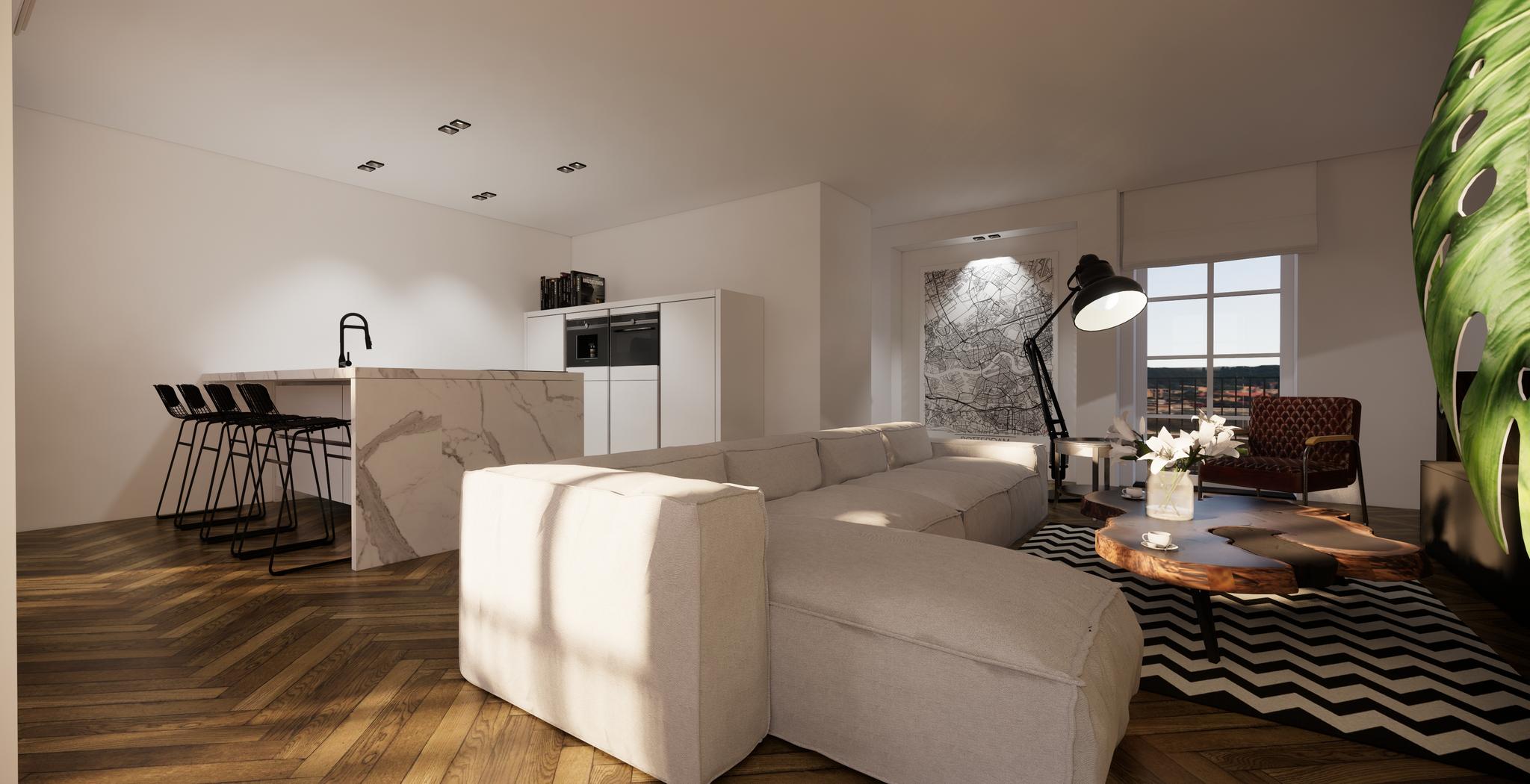 Appartement H is op de tweede en derde verdieping gelegen en bereikbaar via het trappenhuis. De tweede verdieping is een mooie ruimte voor je woonkamer met de entresol als slaapruimte. Het plafond is hier deels 4.66. De derde verdieping heeft een hoogte van 2.60 meter. Doordat je hier zo je dakterras op loopt is dit de ideale plek voor je woonkeuken. Door de hoekligging van appartement H heb je hier een extra groot terras.