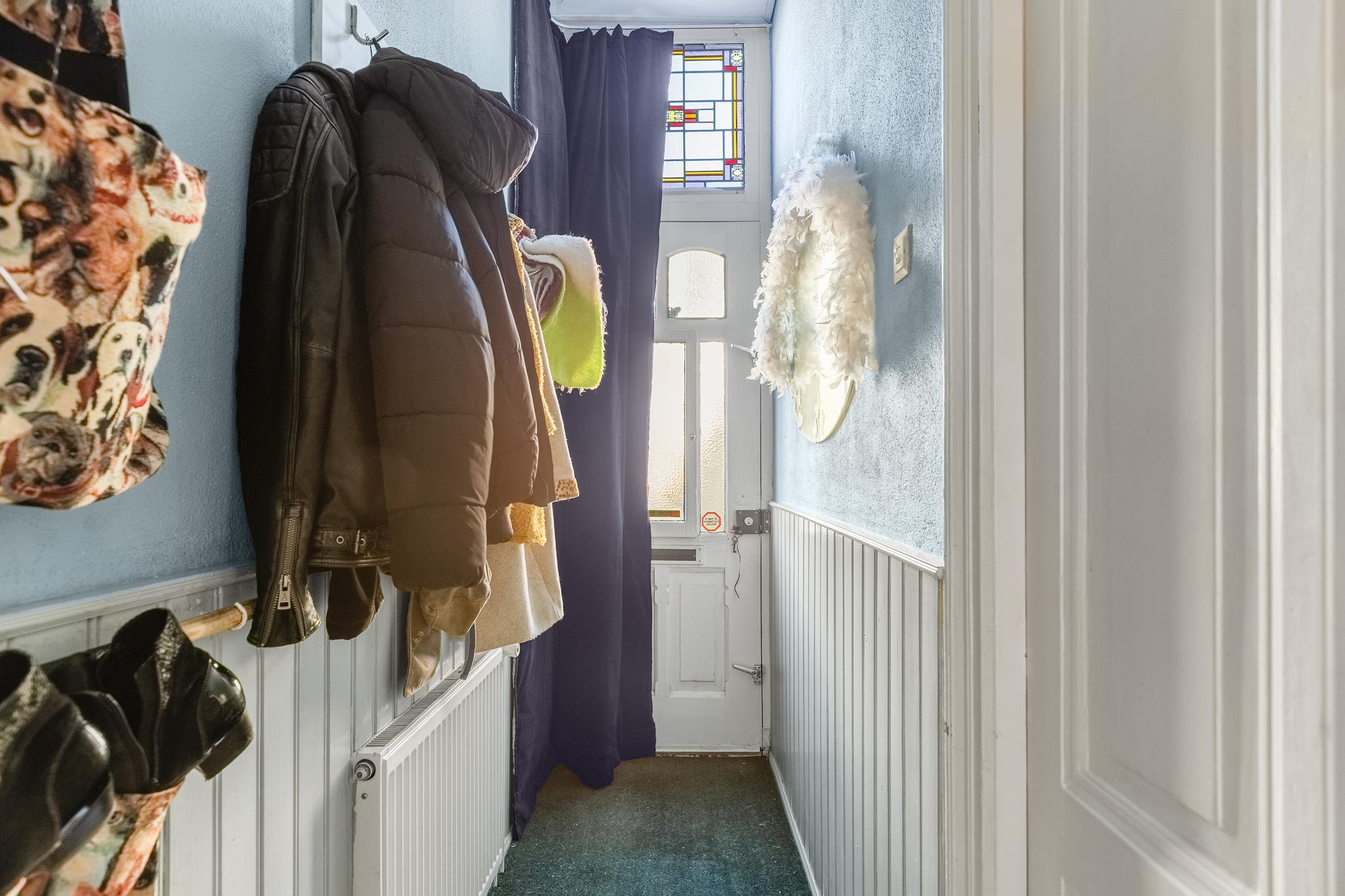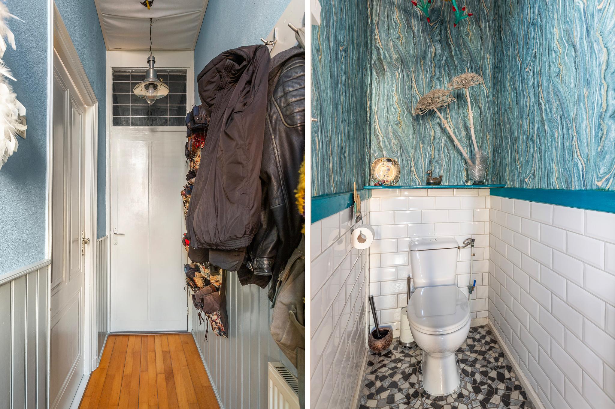 Hal met toilet (deels betegeld) en toegang tot de woonkamer.