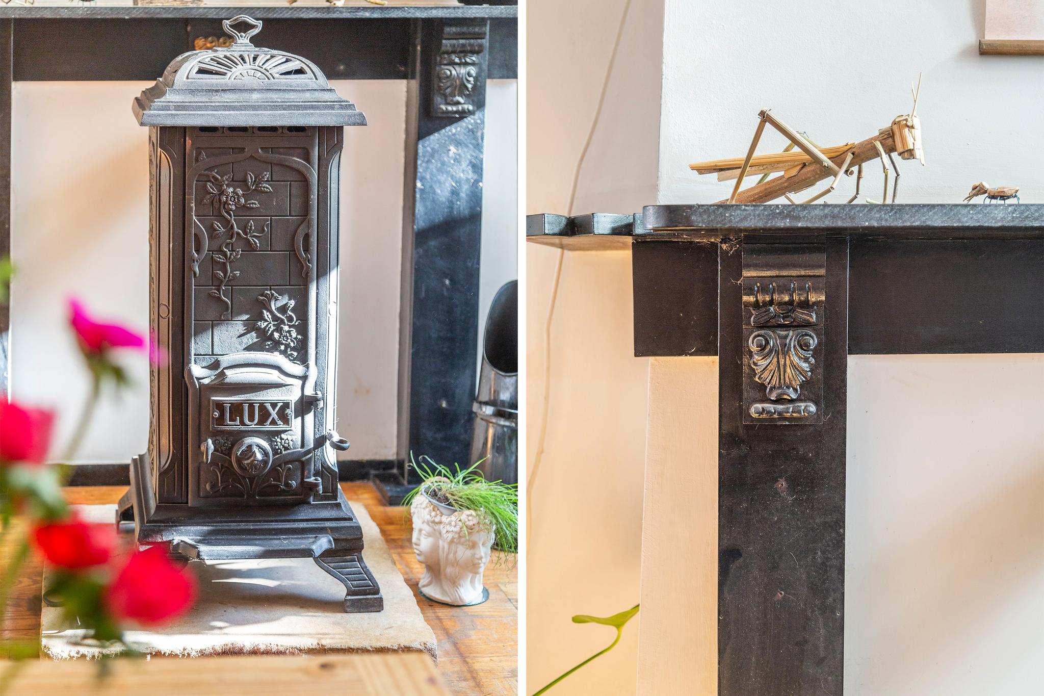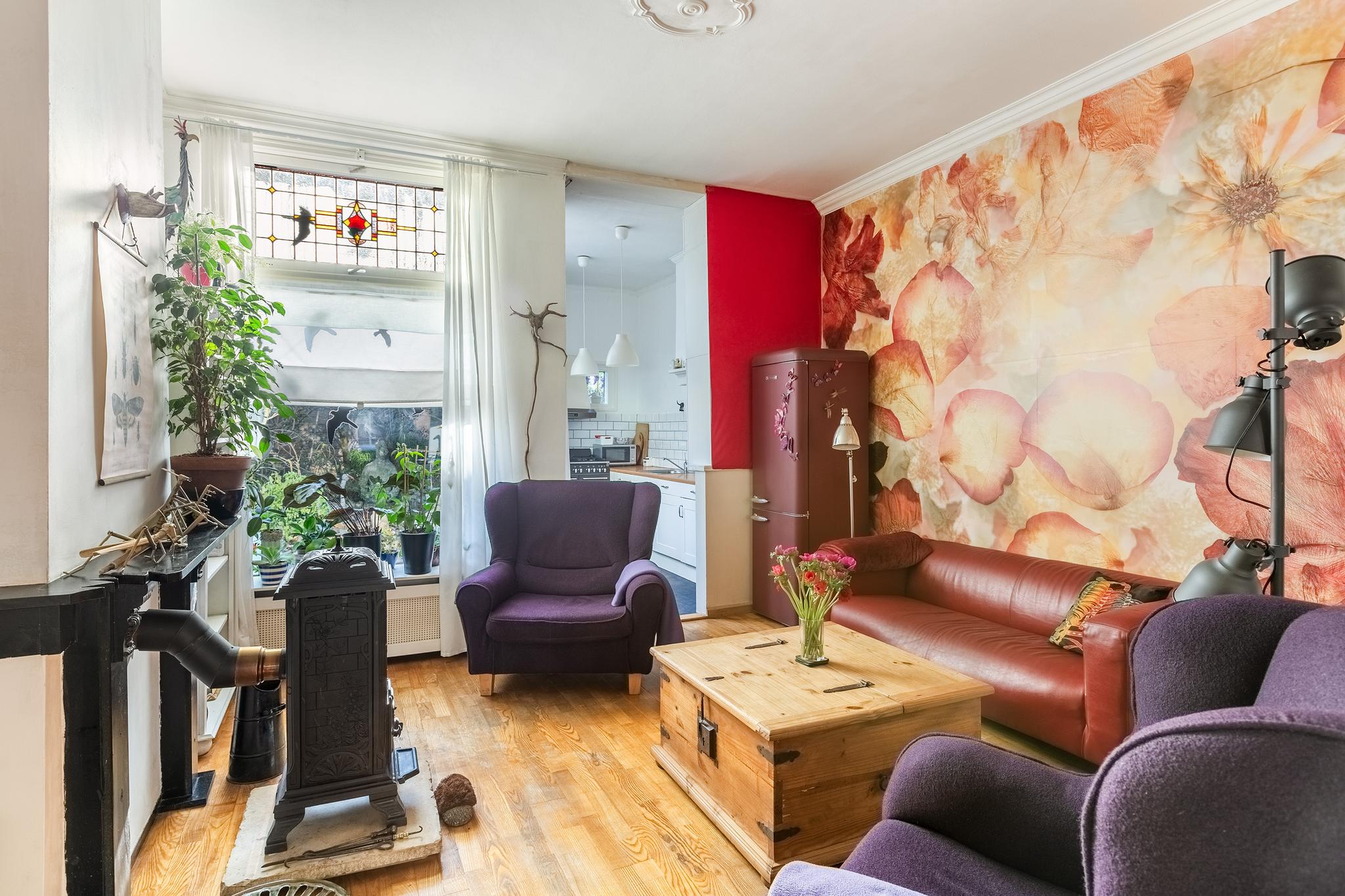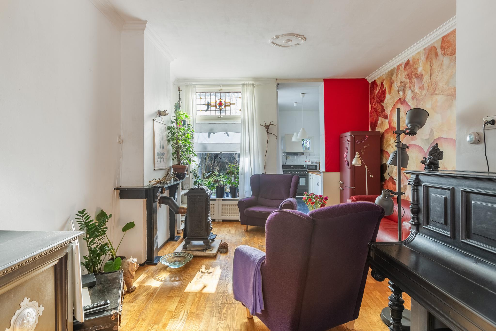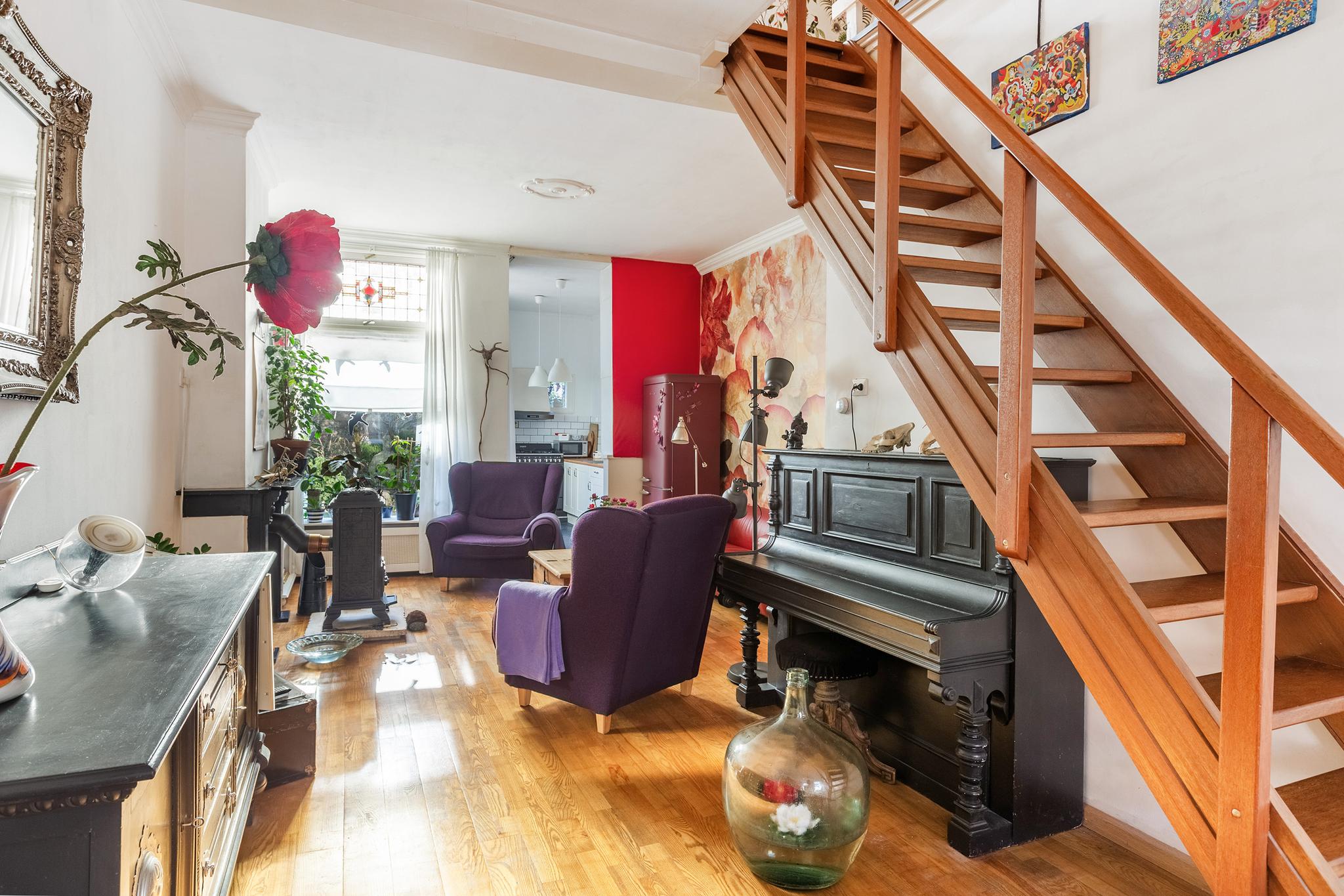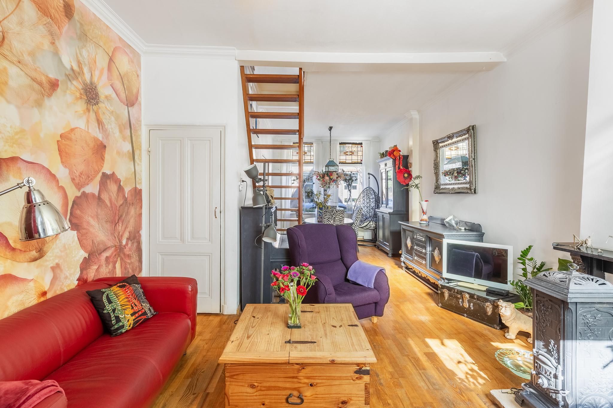 Sfeervolle woonkamer met karakteristieke schouw, houten vloer, trapkast, trap naar de verdieping en toegang tot de keuken aan achterzijde. De woonkamer is afgewerkt met stucwerk en deels behang wandafwerking.