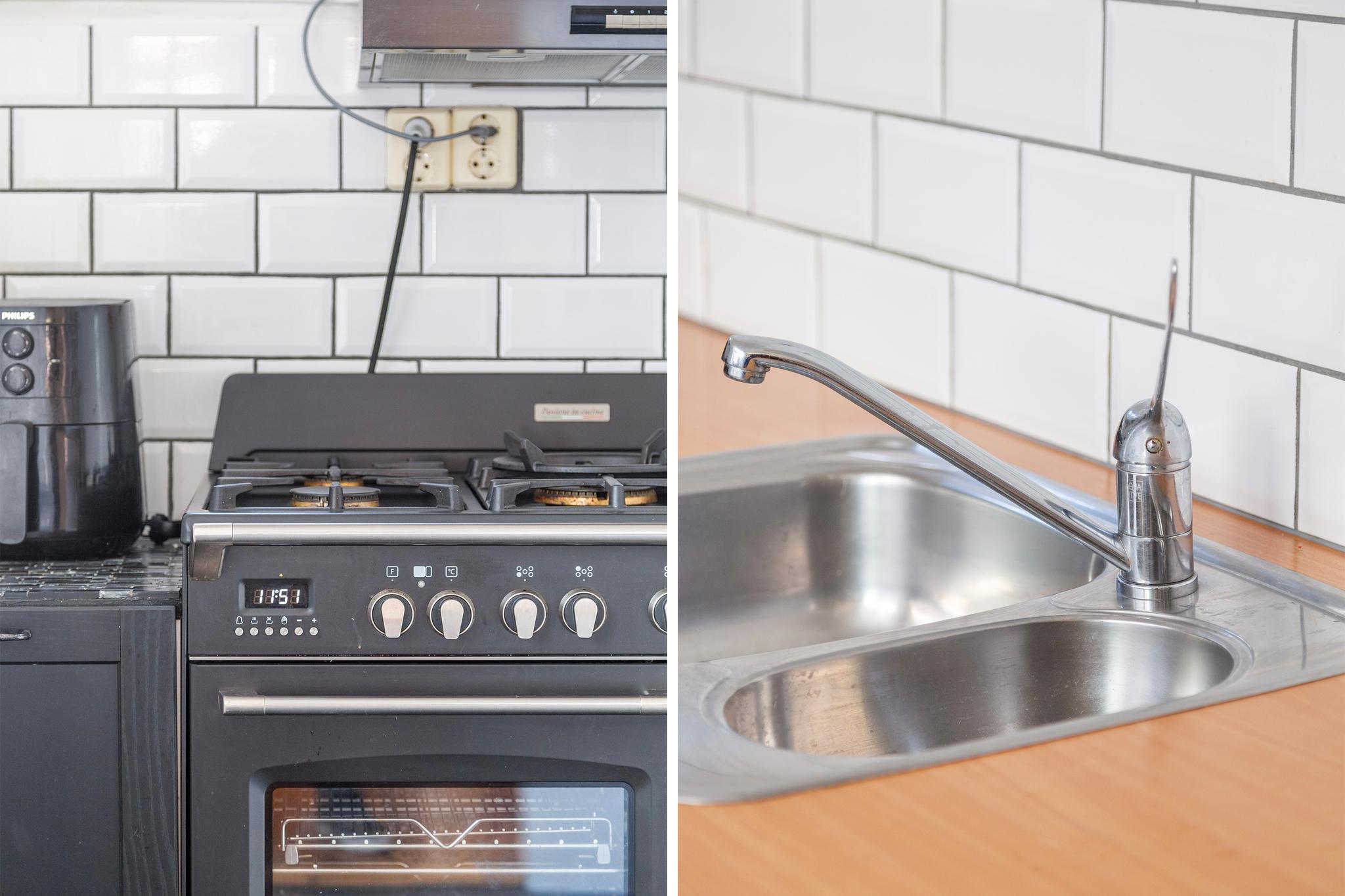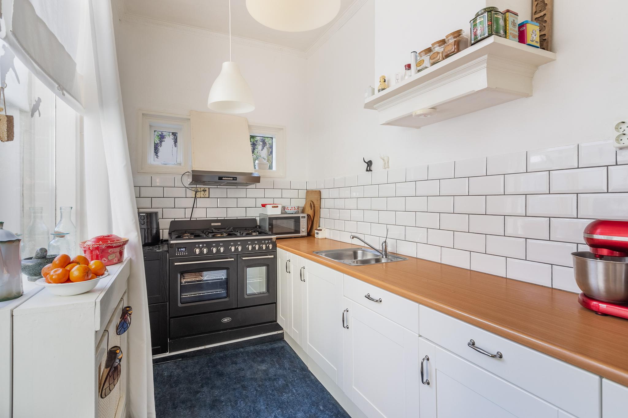 De keuken bevindt zich in de aanbouw aan achterzijde, deze is opgesteld in L-opstelling en beschikt over een 1,5 spoelbak, 5-pit gaskookplaat met dubbele oven (ter overname), afzuigkap, losse koel/vriescombinatie (ter overname) en een houten werkblad. Vanuit de keuken is de achtertuin begaanbaar. De keukenruimte is afgewerkt met een linoleum vloer.