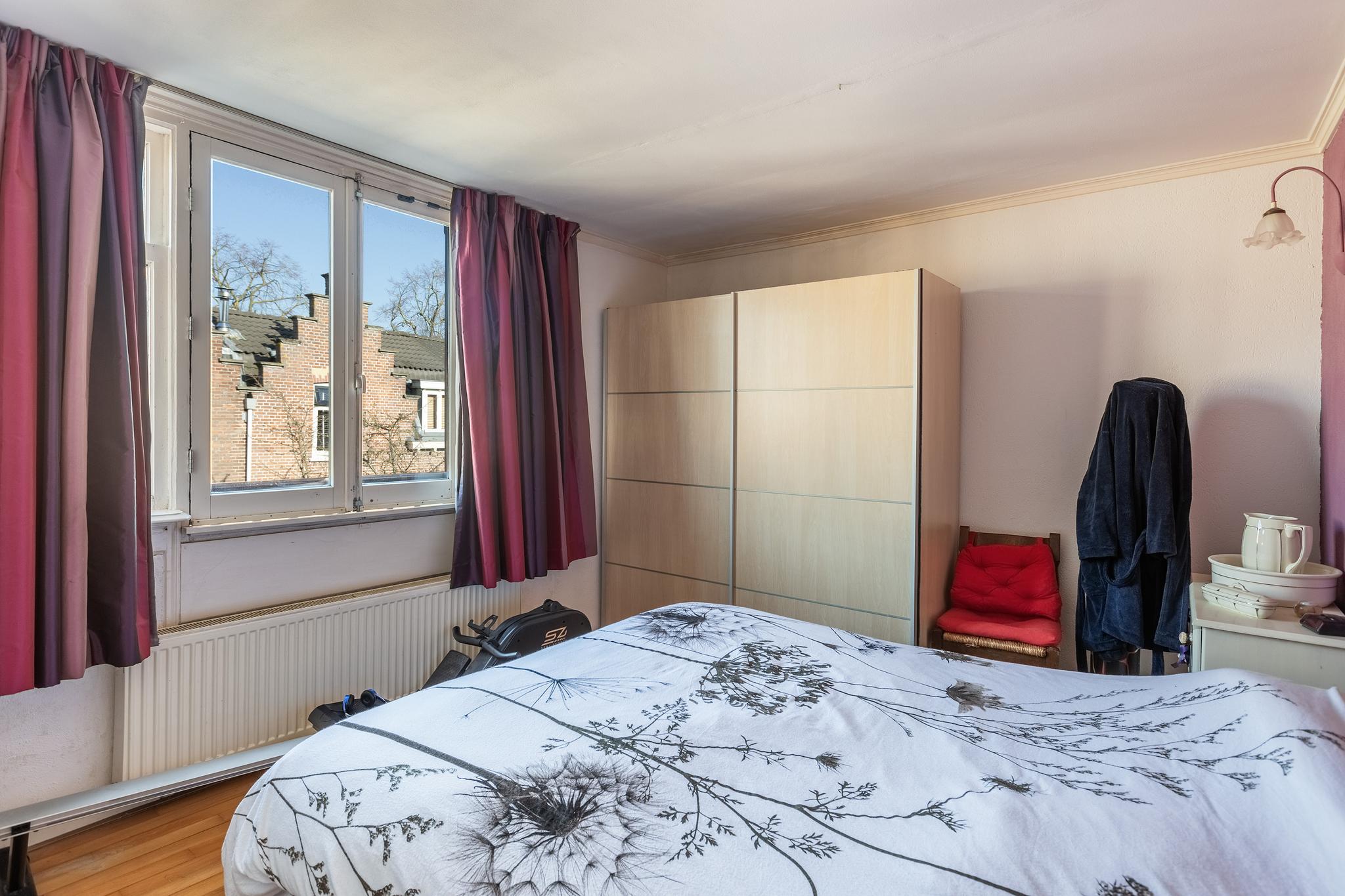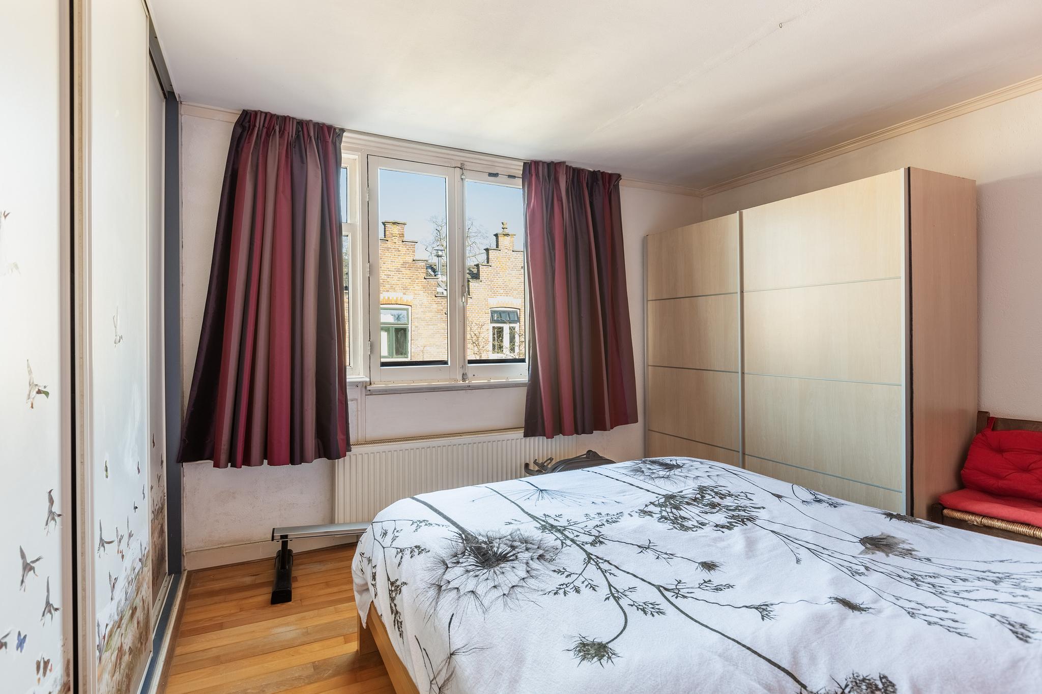 Slaapkamer aan voorzijde, voorzien van een schuifkastenwand en een grote raampartij met het kenmerkende hekje aan voorzijde.