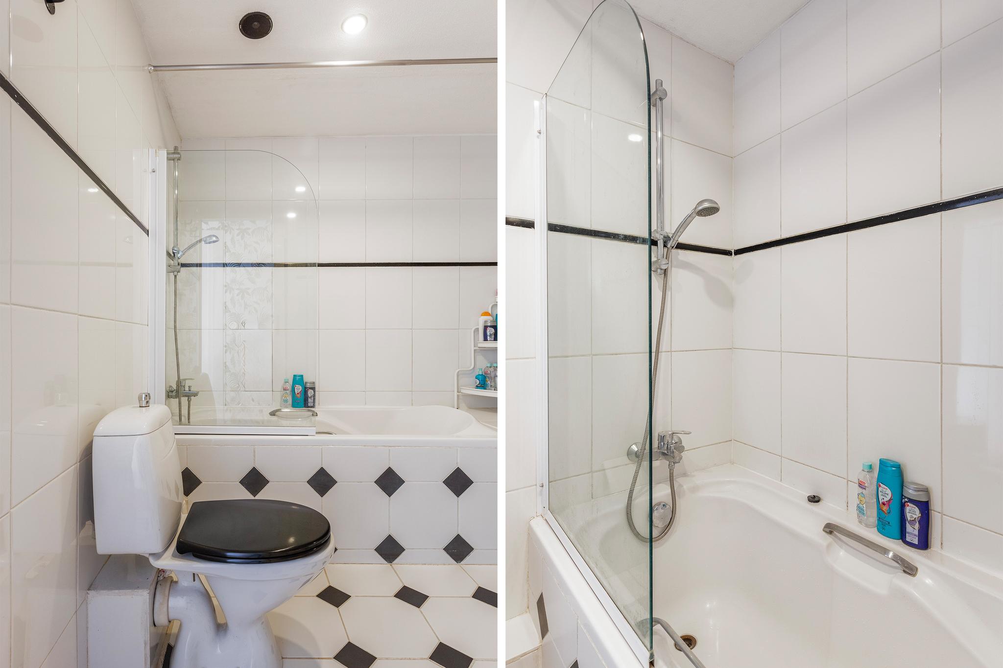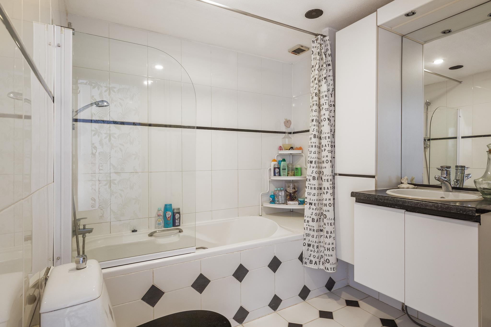 Inpandige badkamer (volledig betegeld), voorzien van ligbad met douche, toilet, groot wastafelmeubel met kolomkast en mechanische ventilatie.