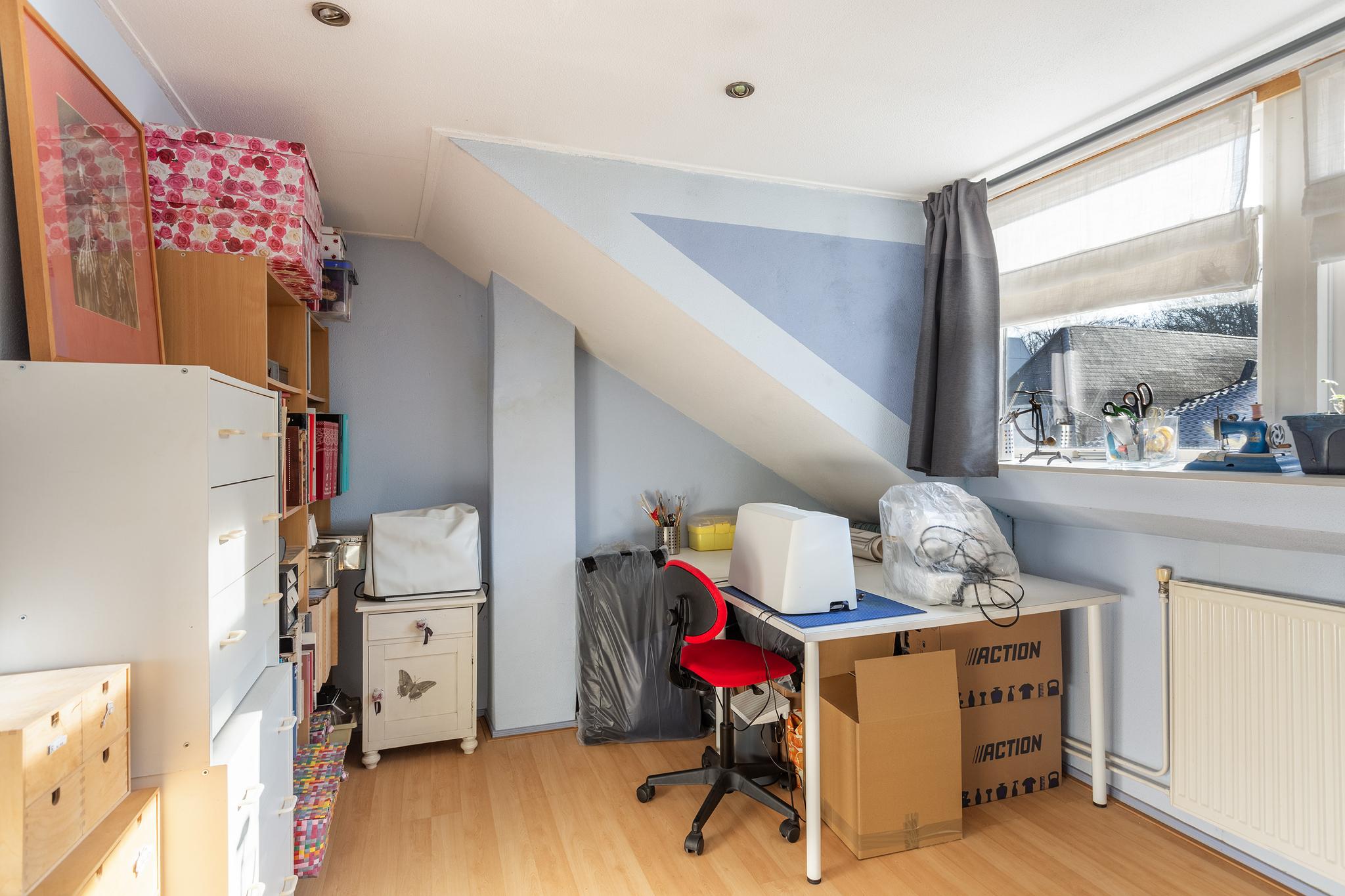 Heel bijzonder aan deze woning is dat deze beschikt over een grote vliering, bereikbaar middels een vlizotrap. De vliering is momenteel als atelier/hobbyruimte in gebruik, maar is als bergruimte ook ideaal. De vliering beschikt over twee dakramen.