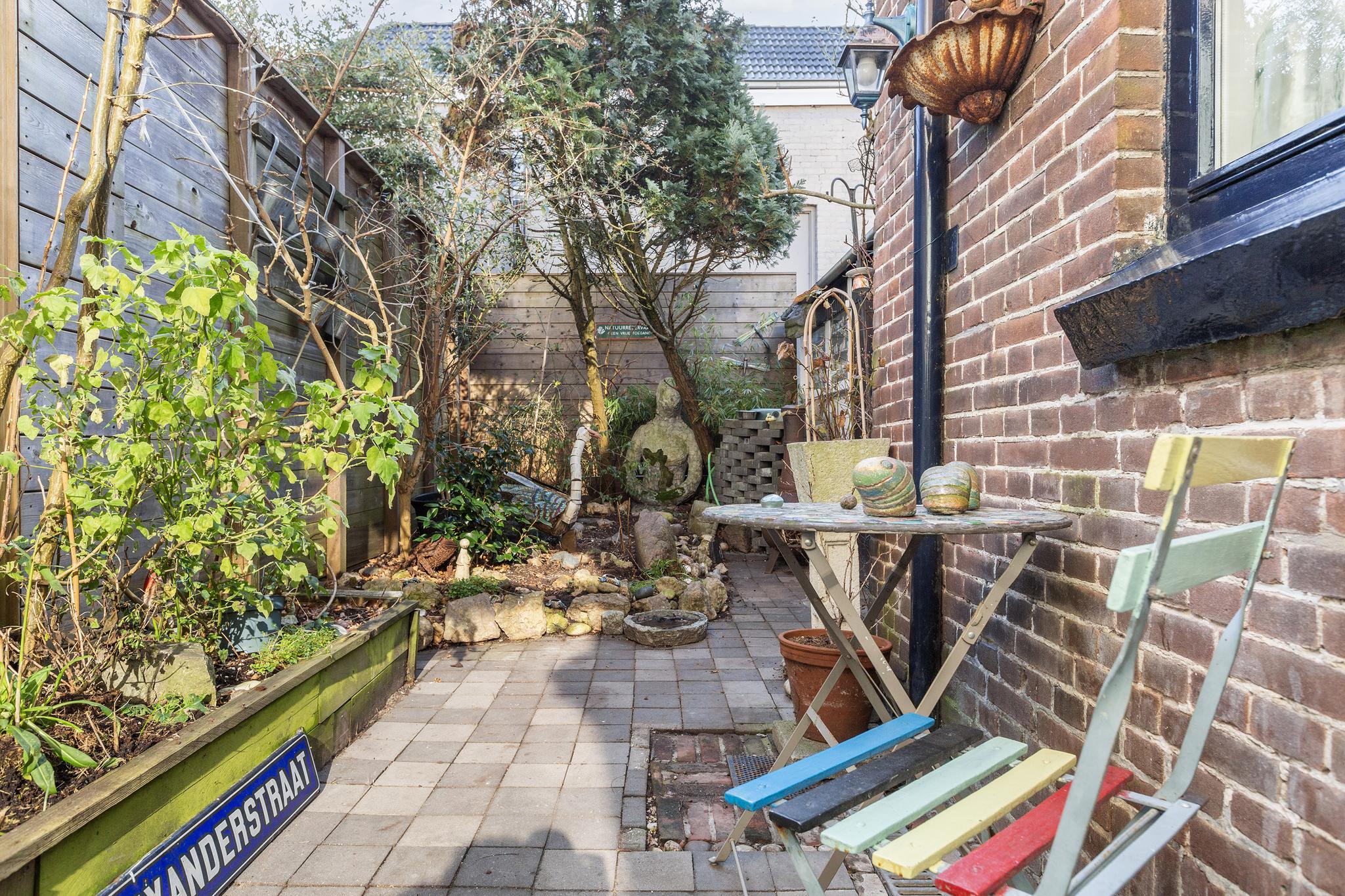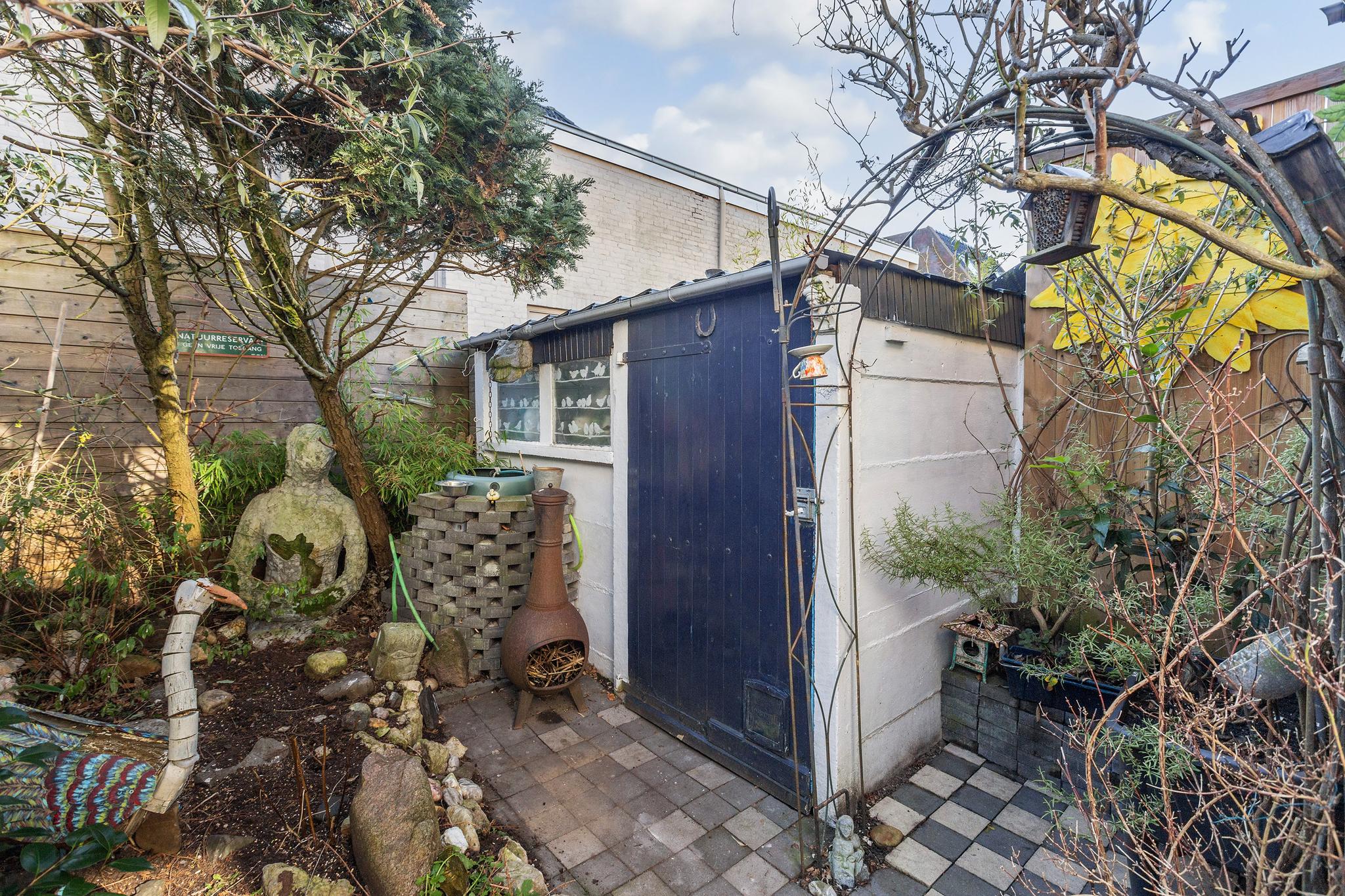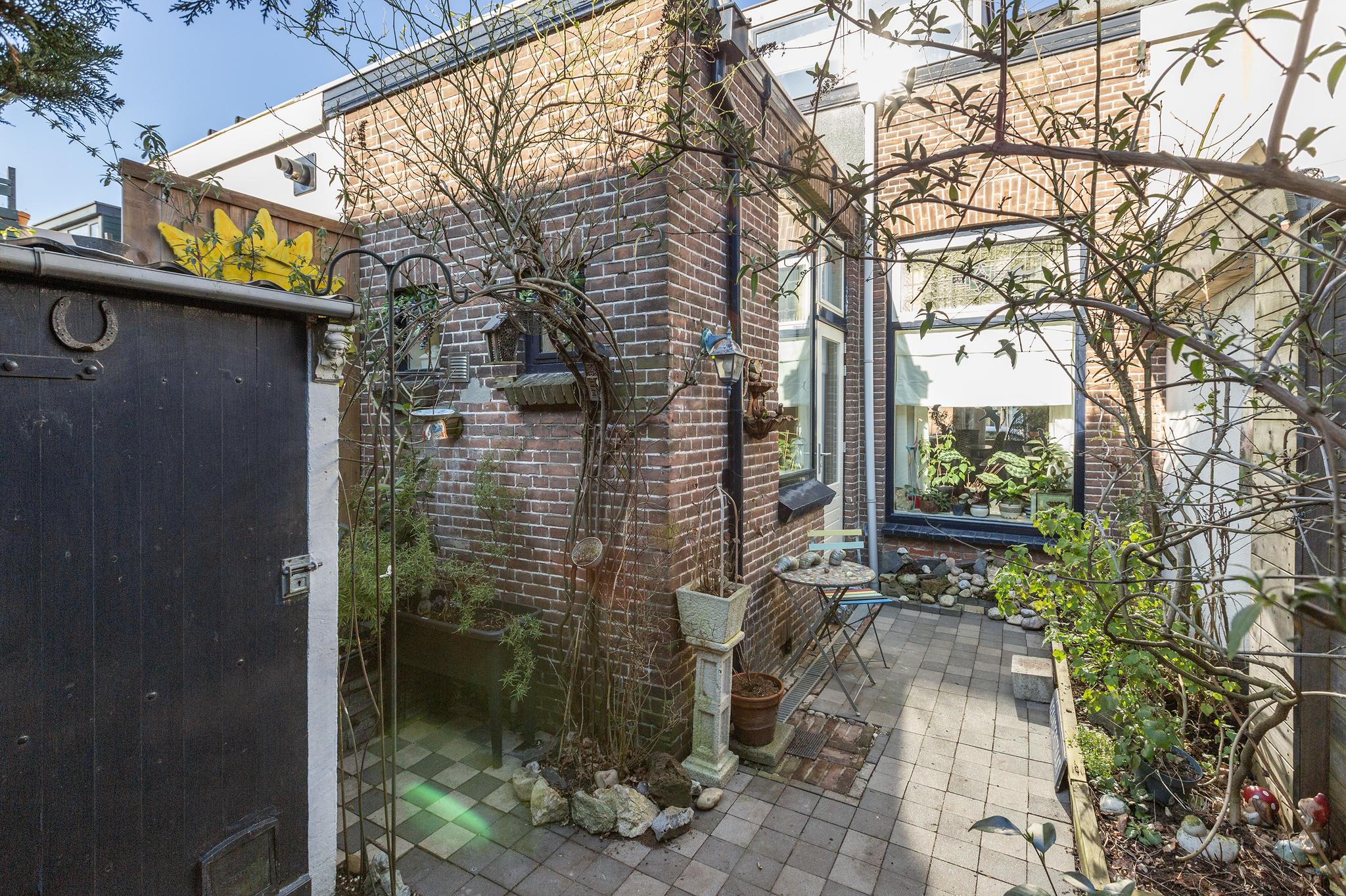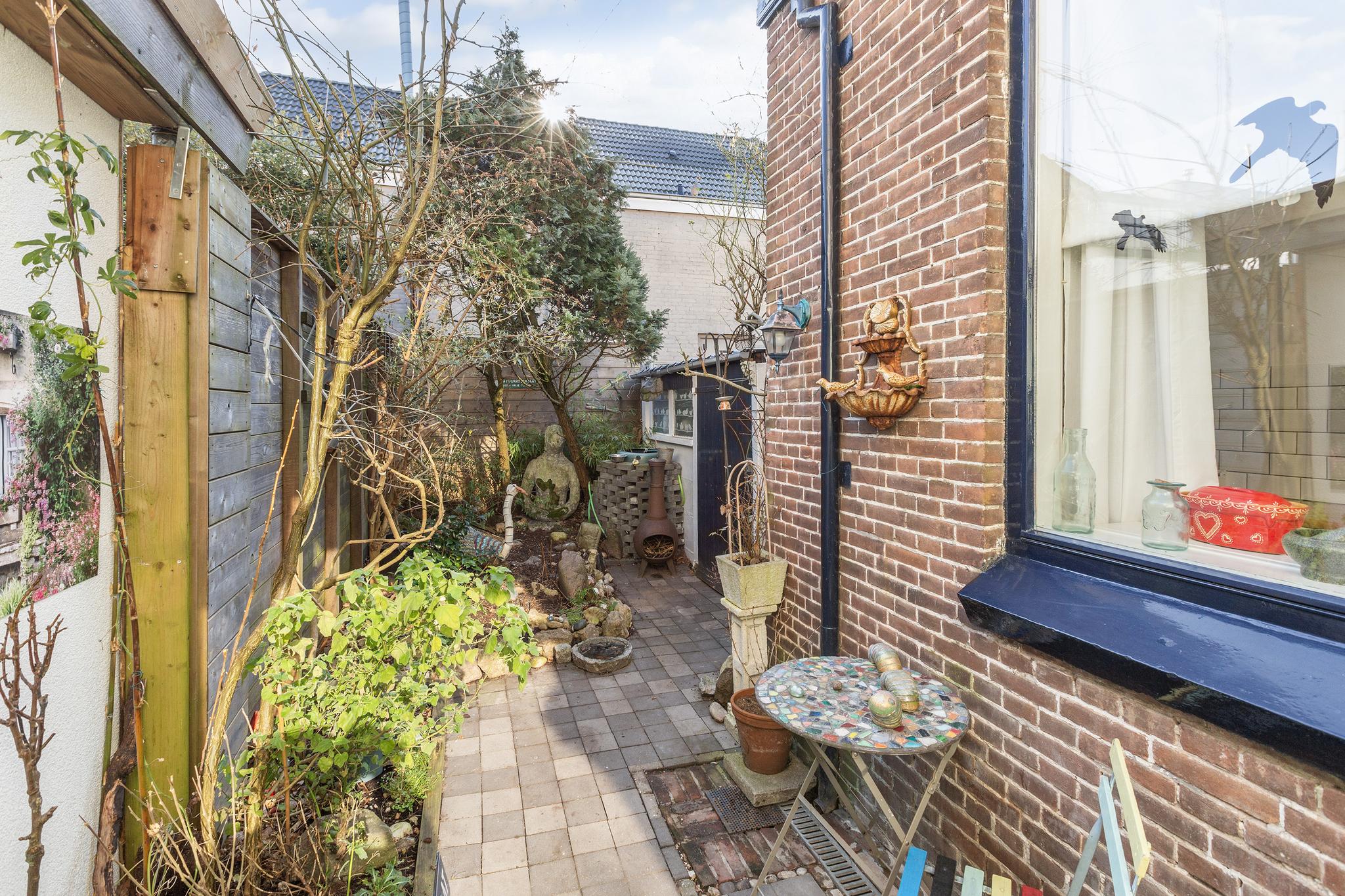 De achtertuin is gelegen op het zuiden en daarmee heerlijk zonnig te noemen. De tuin is voorzien van een stenen berging, speelse bestrating en drainage.