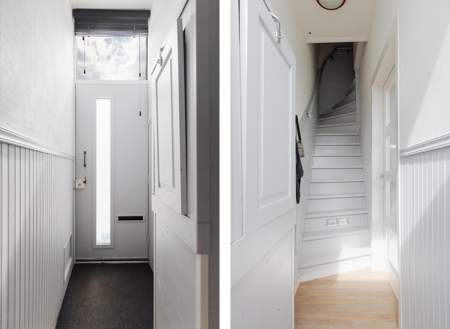 Entree in de hal met meterkast en deur naar de woonkamer.