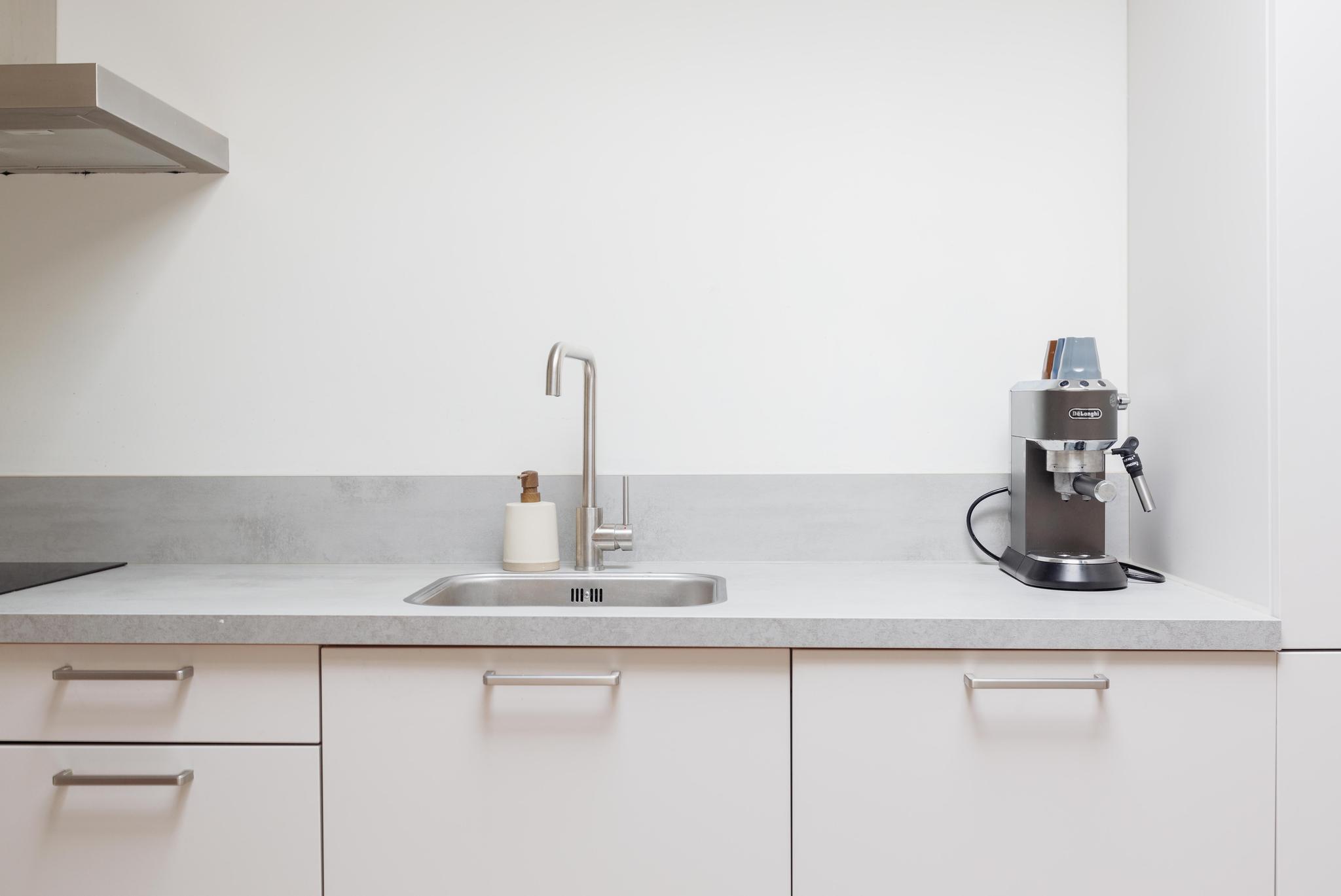Keuken in wandopstelling met spoelbak, vaatwasser, inductie kookplaat, recirculatie kap, oven, koelkast en vriezer.