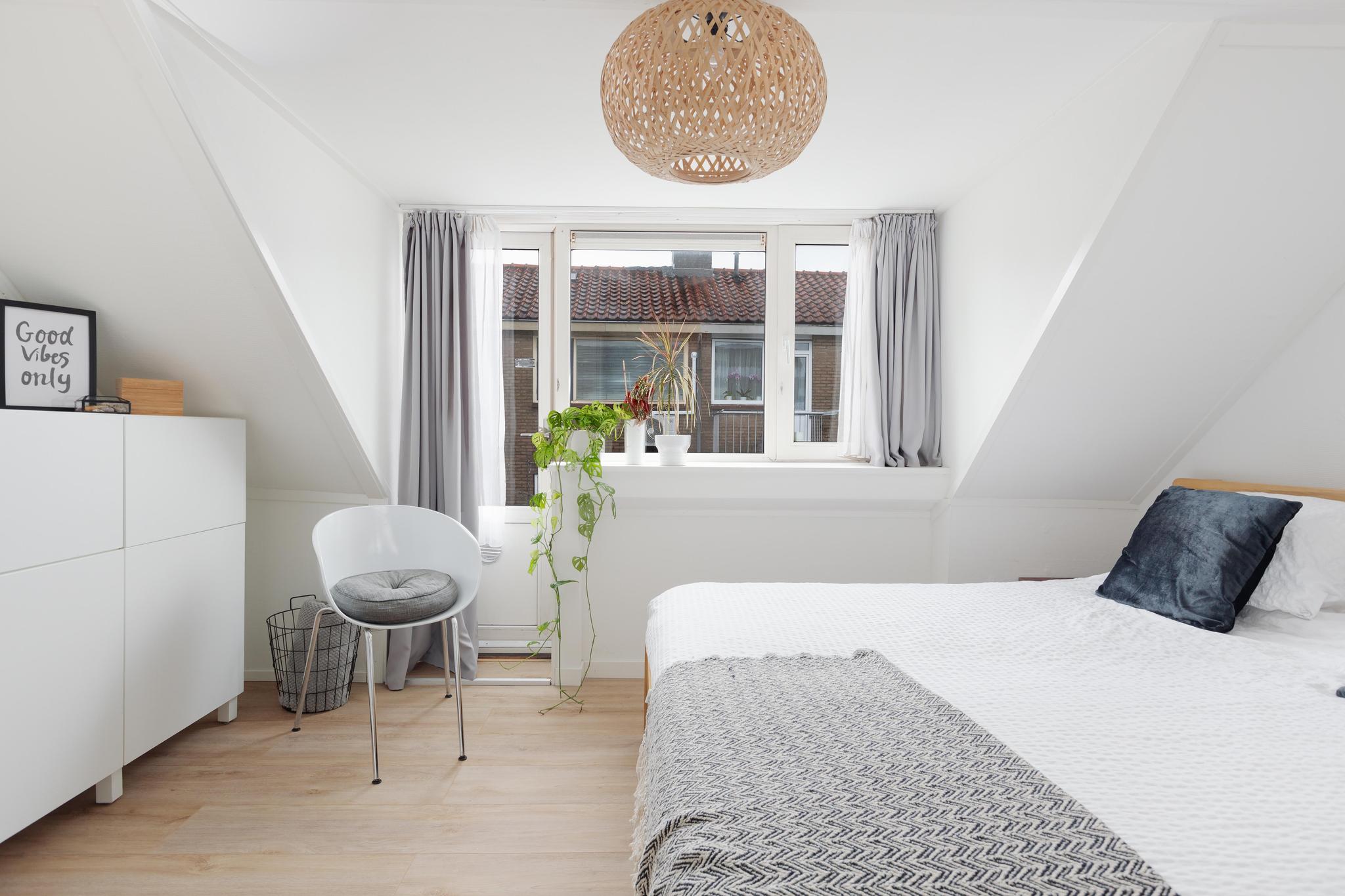 Slaapkamer 1 aan de voorzijde met dakkapel en laminaat vloer.