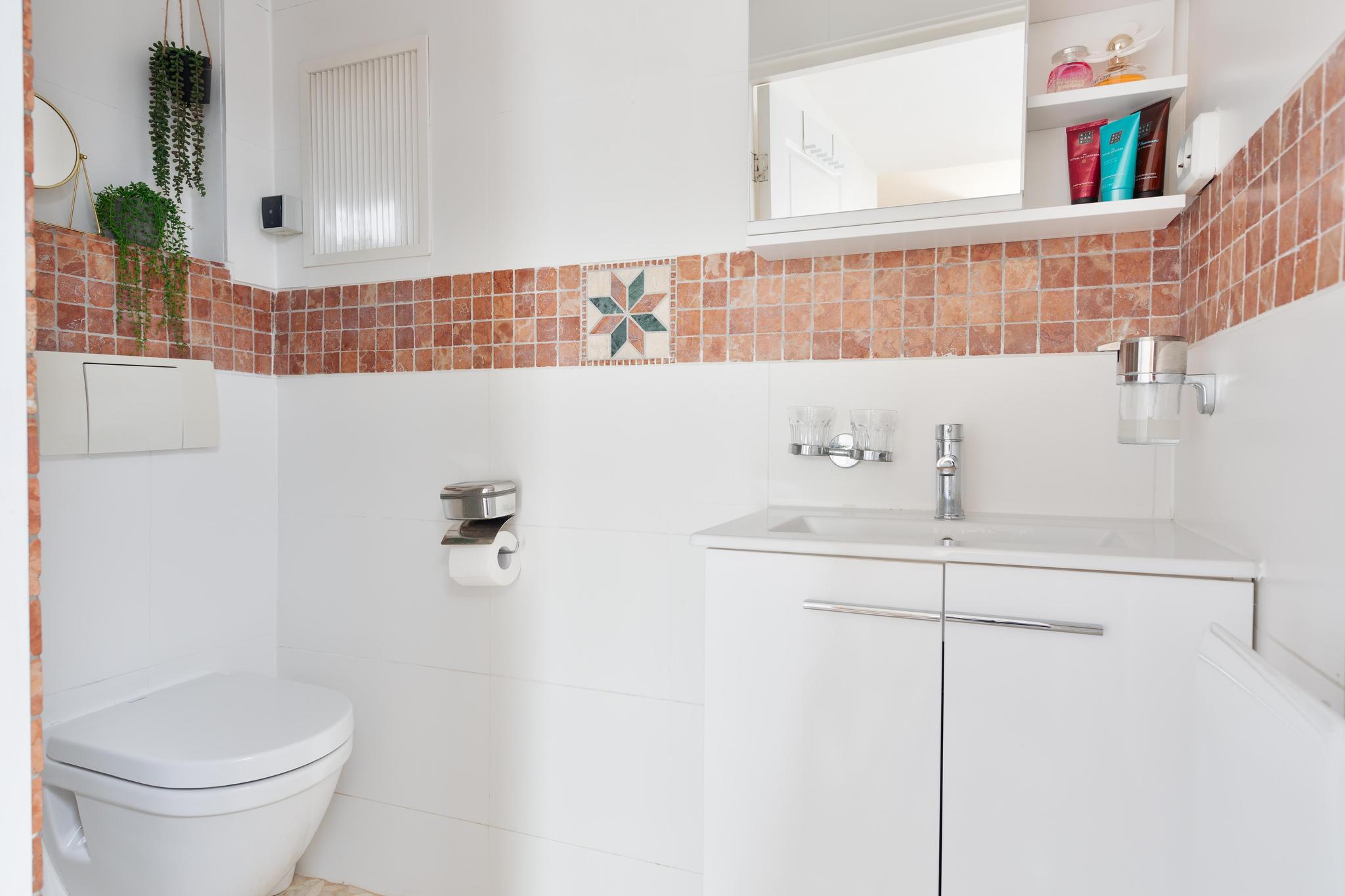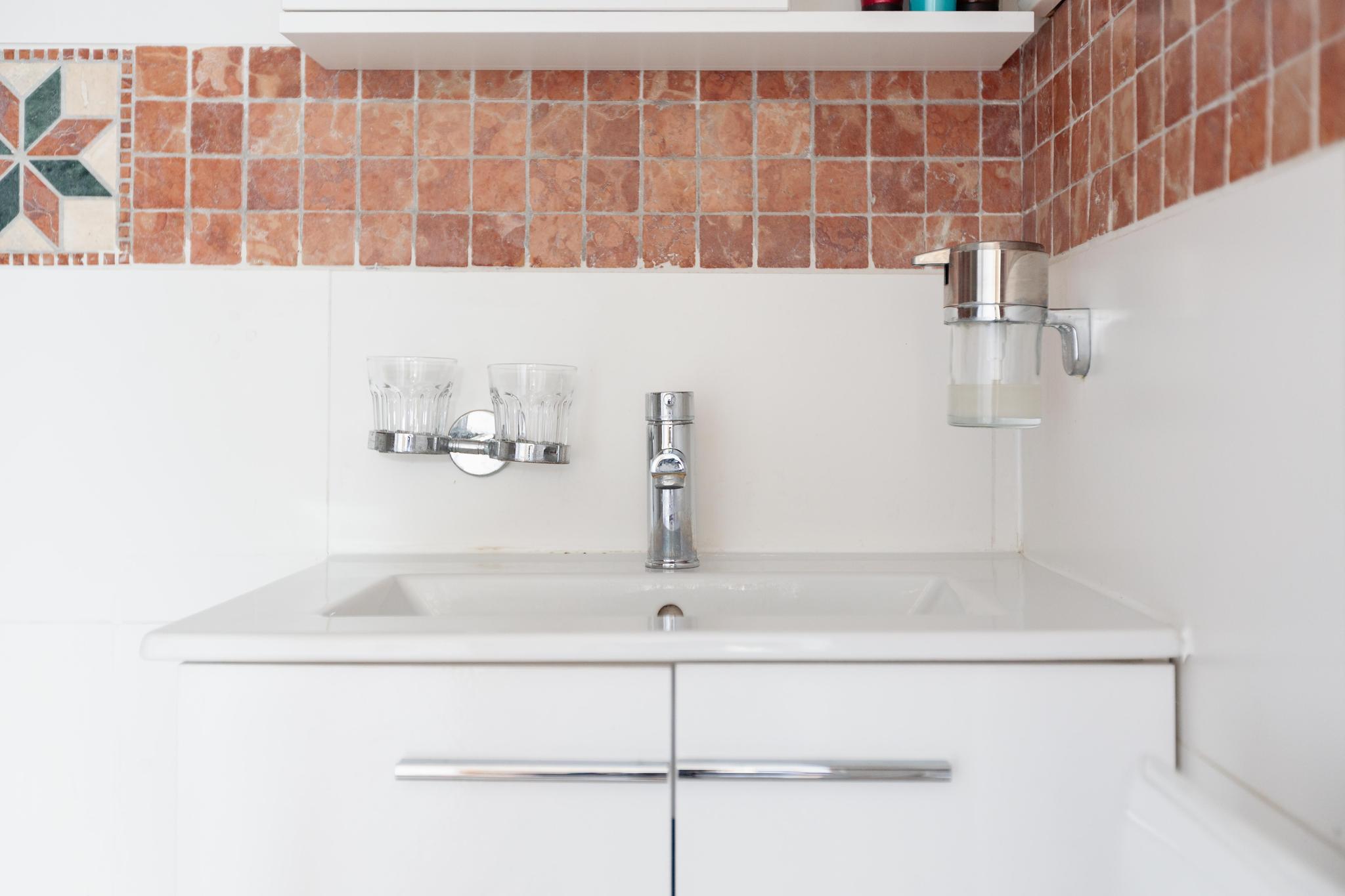 Badkamer, inpandig met wastafel en meubel, douchehoek en toilet, geheel betegelde wanden.