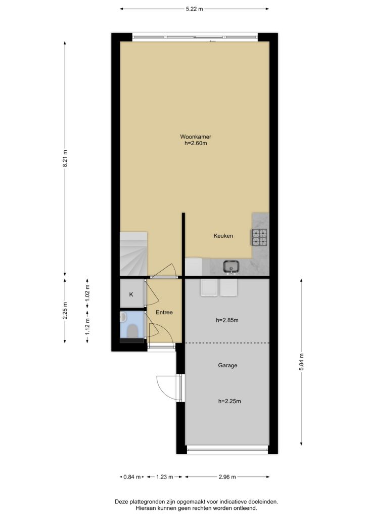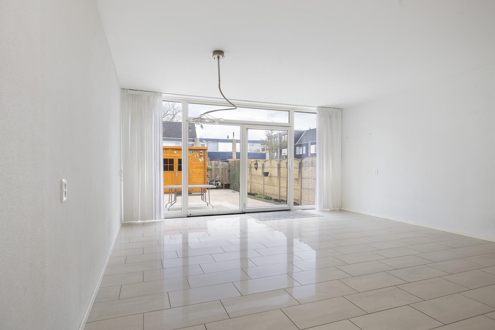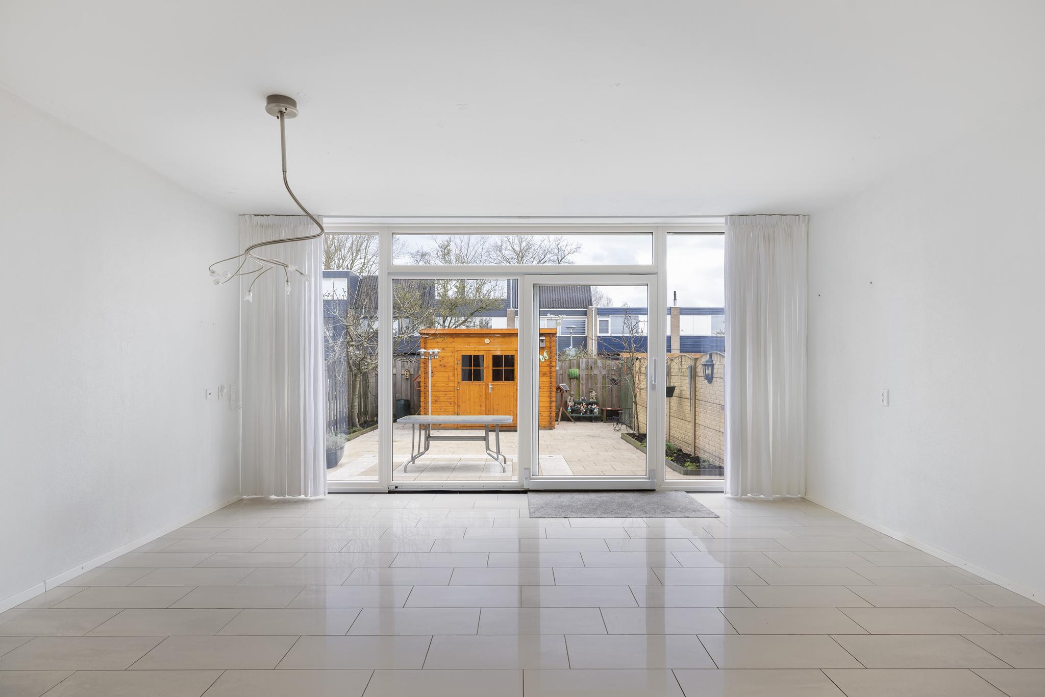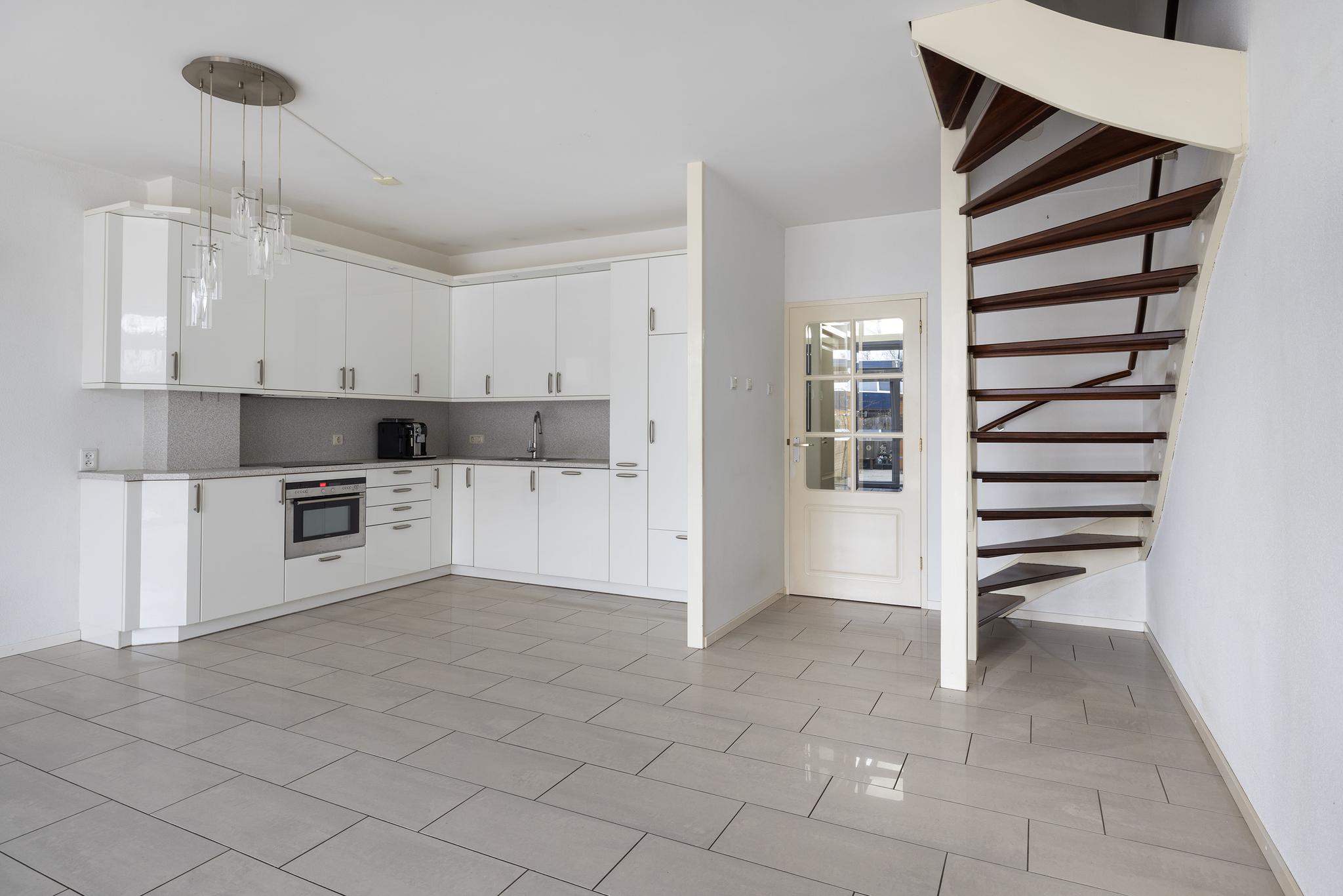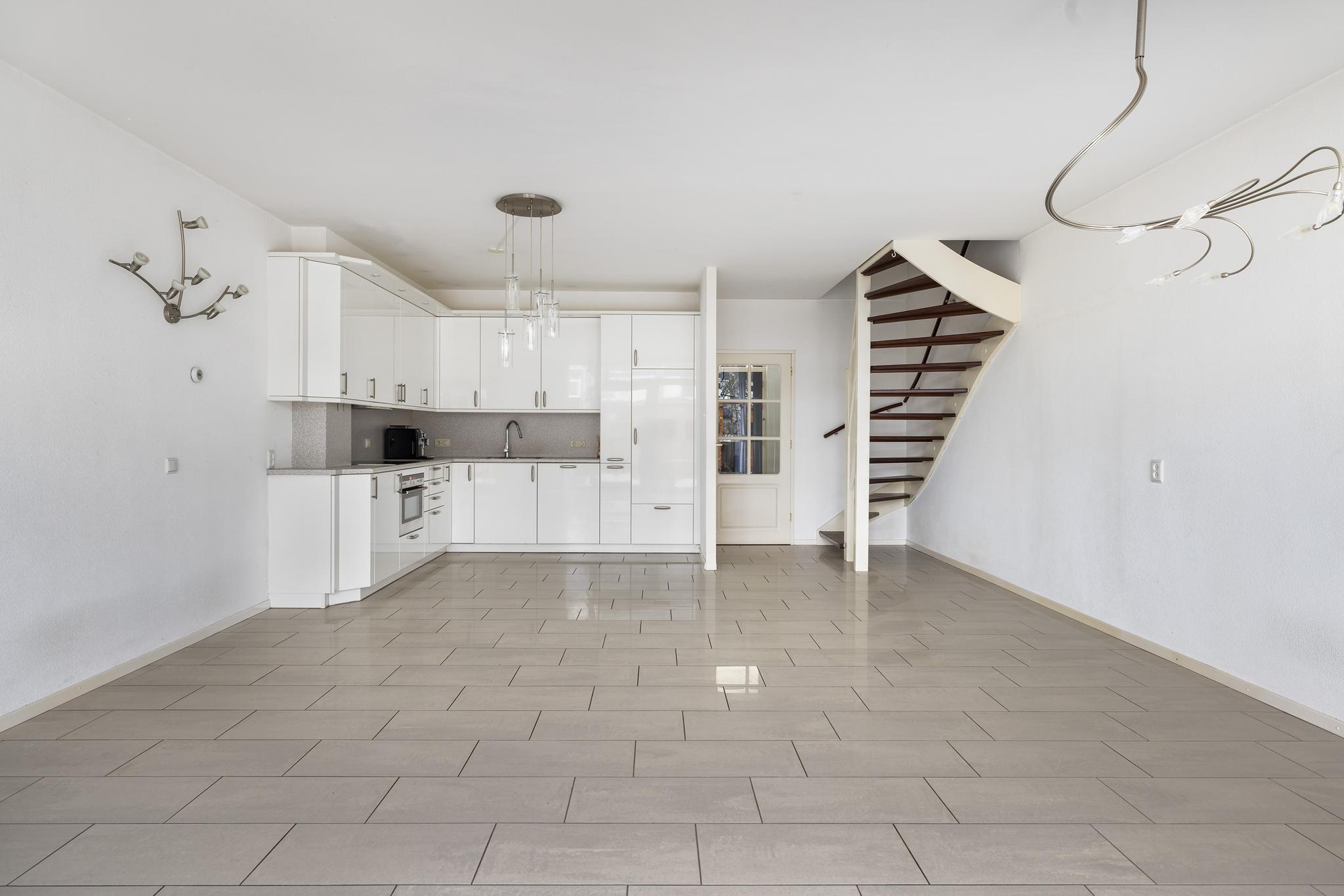 Ruime woonkamer met open keuken, trapopgang naar de verdieping en grote schuifpui naar de achtertuin.