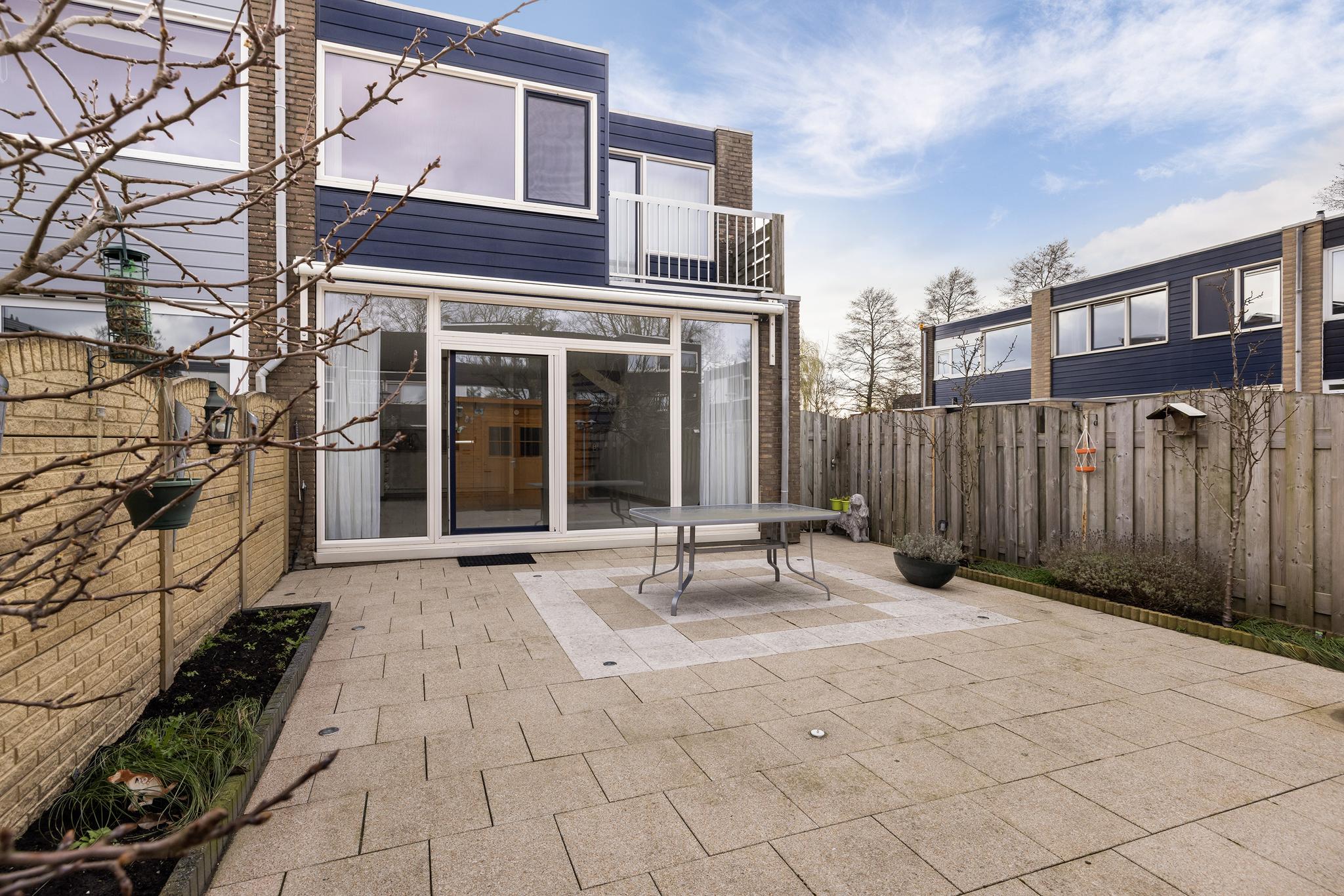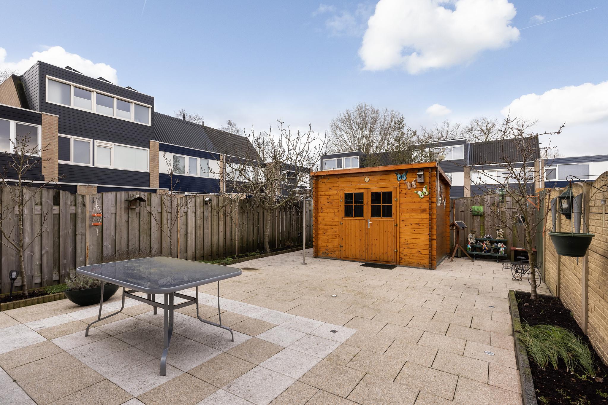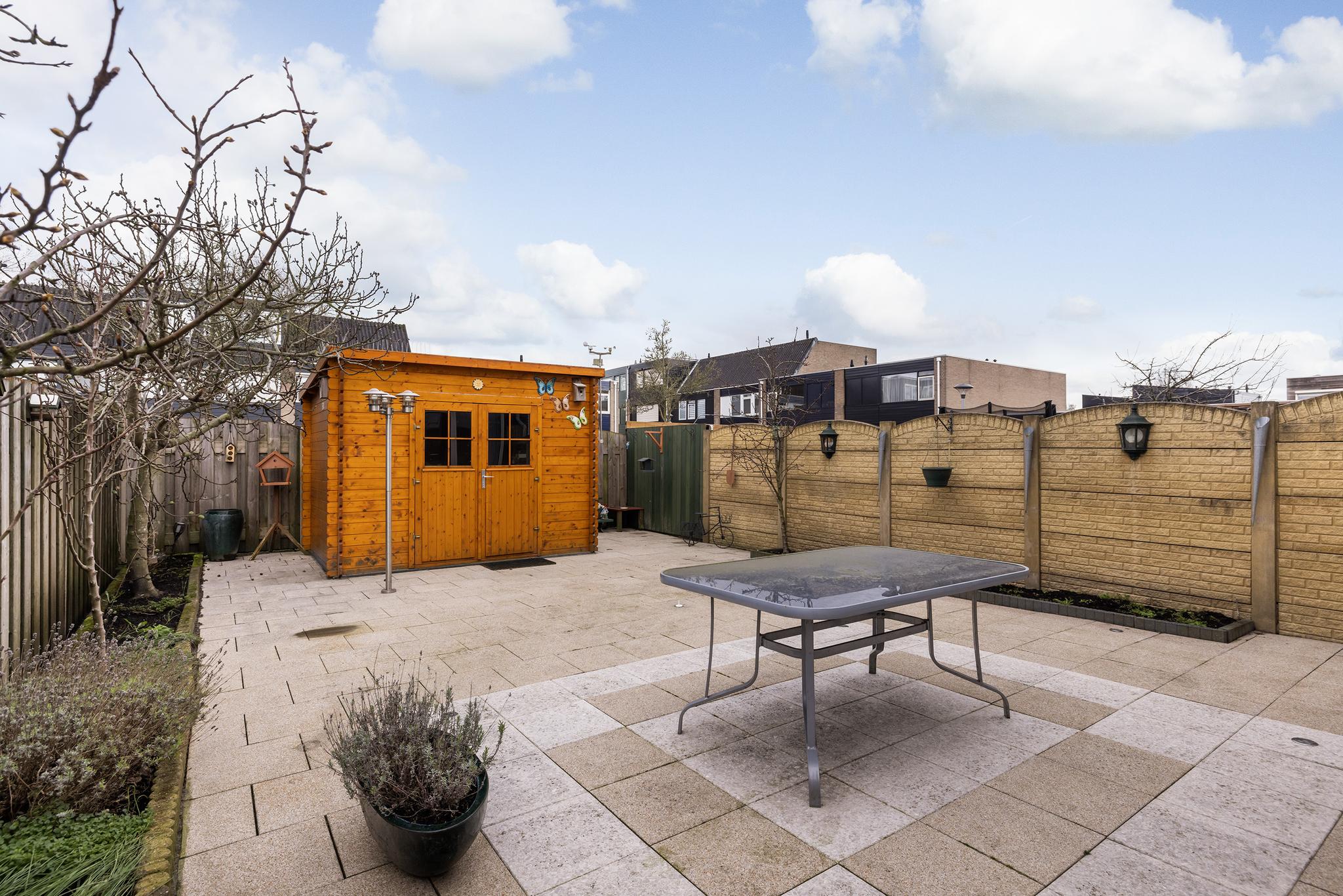 Heerlijk ruime achtertuin op het zonnige zuiden met elektrisch zonnescherm, buitenkraan, vrijstaande houten berging voorzien van stroom. Een tuin op het zuiden betekend: fruitbomen doen het geweldig! In de tuin kun je een peren en een vijgenboom vinden die het heerlijk naar hun zin hebben!