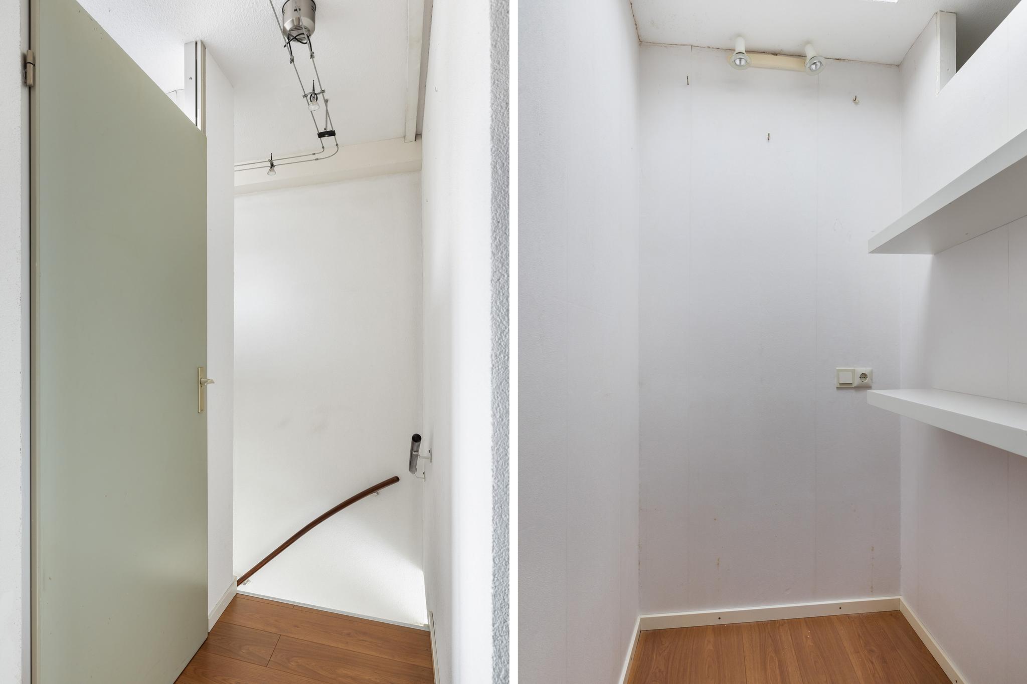 Overloop, voorheen was er een vide aanwezig die is nu dicht gemaakt en als grote bergkast in gebruik met dakkoepel.
