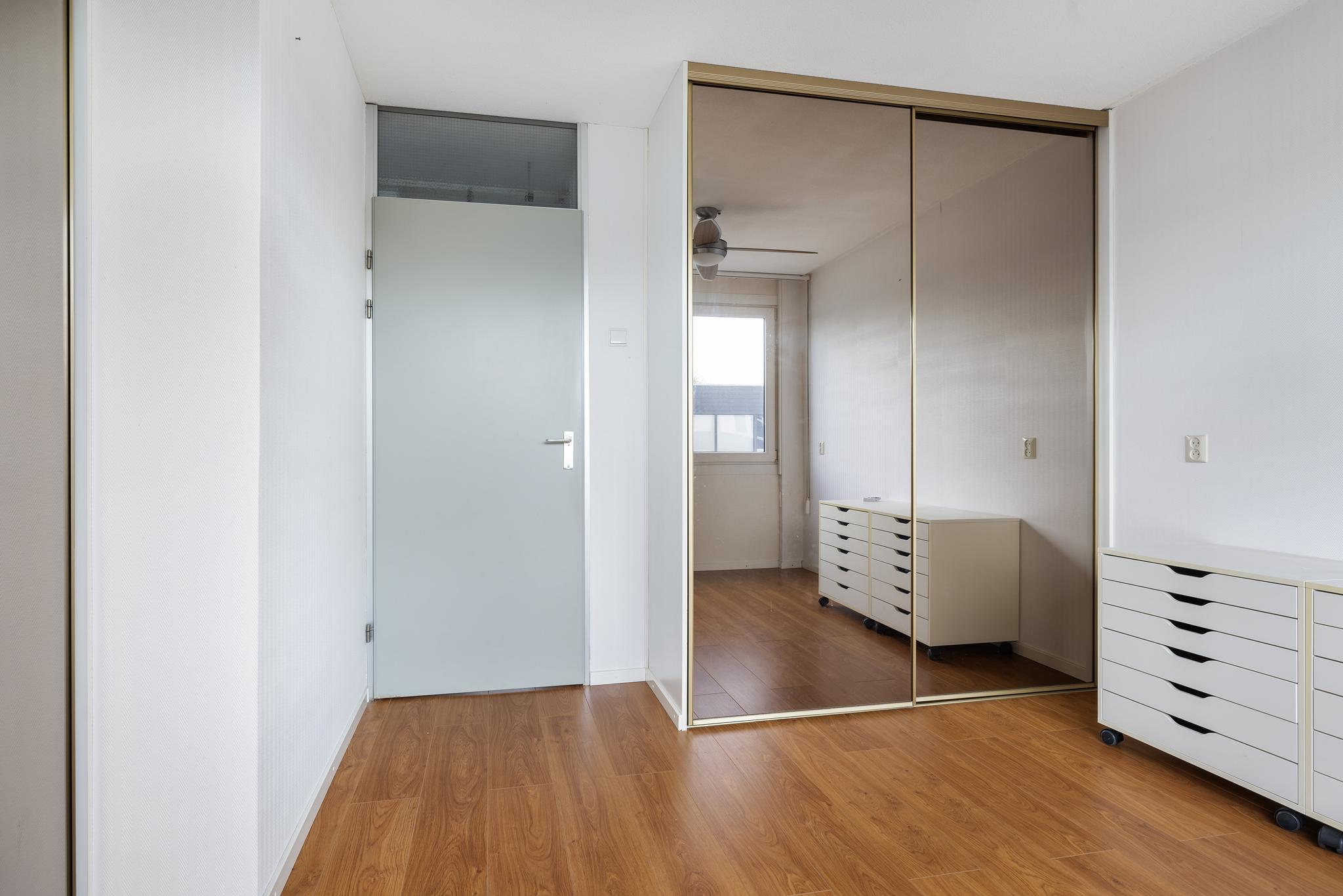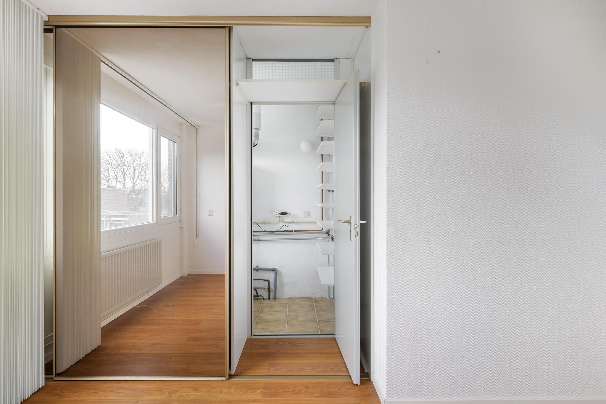 Slaapkamer 1 aan de voorzijde met 4 deurs schuifkastenwand. 1 Deur biedt toegang tot een extra ruimte waarachter de CV is weggewerkt. De CV is van het merk Vaillant en geplaatst in 2008. De omvormer van de zonnepanelen is hier ook te vinden.