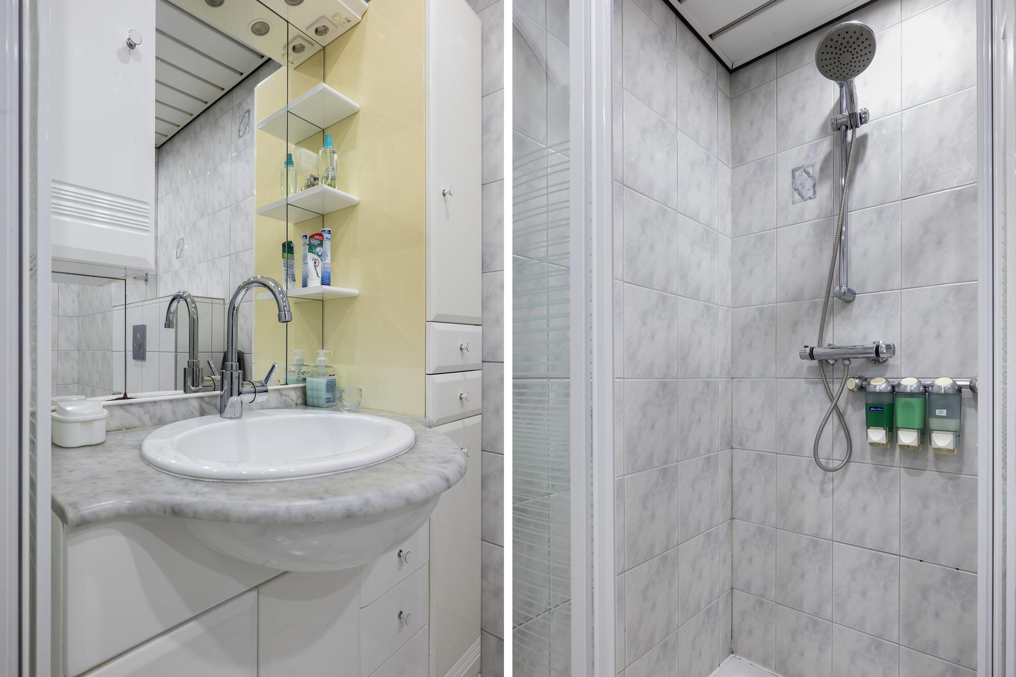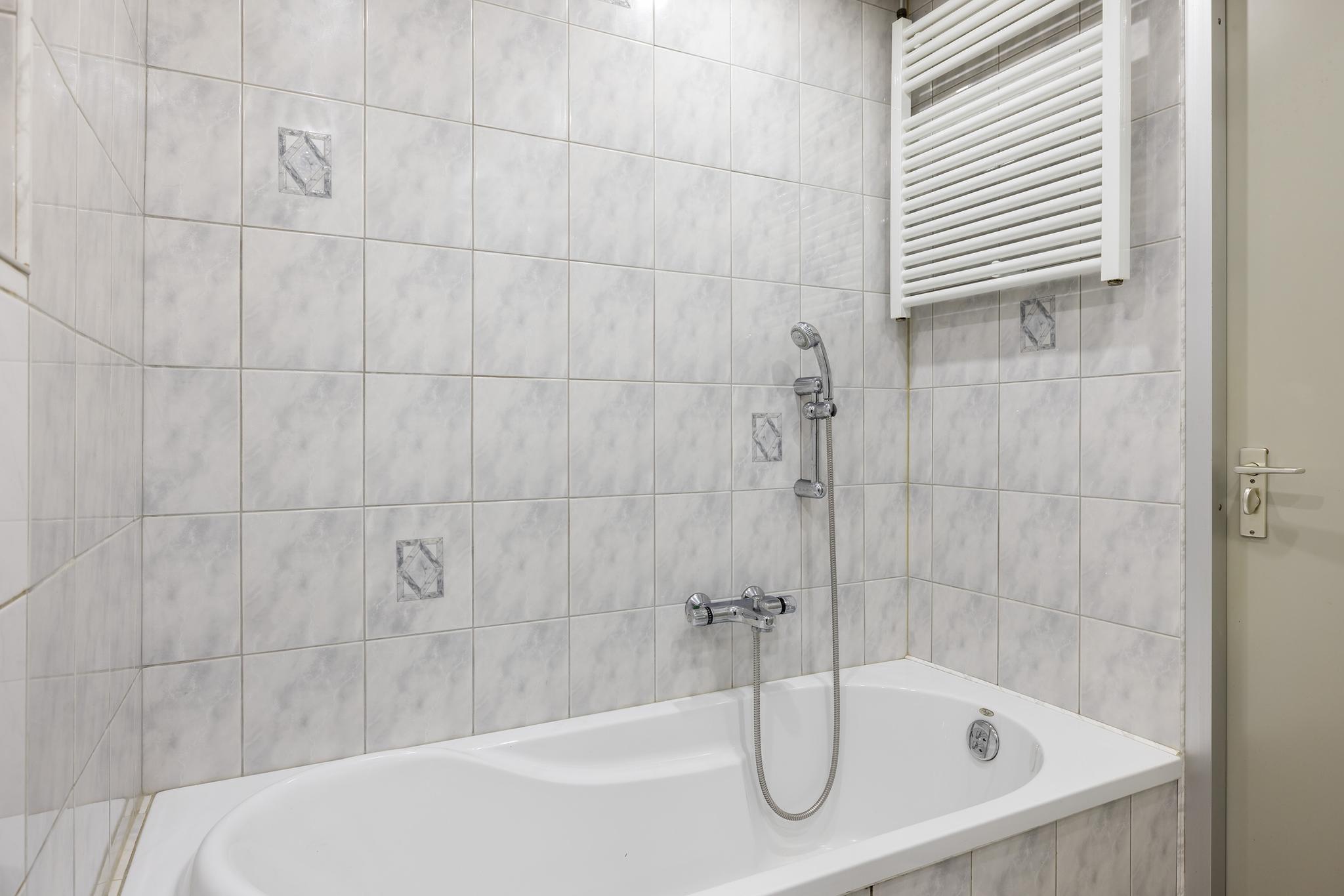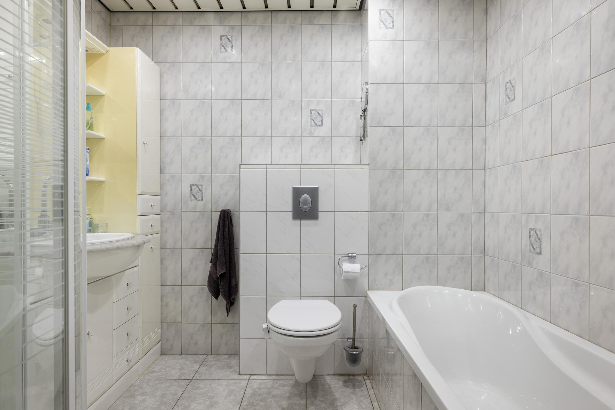 Toilet, 2 jaar geleden vervangen: vrijhangend model met fonteintje en volledig betegelde wanden.