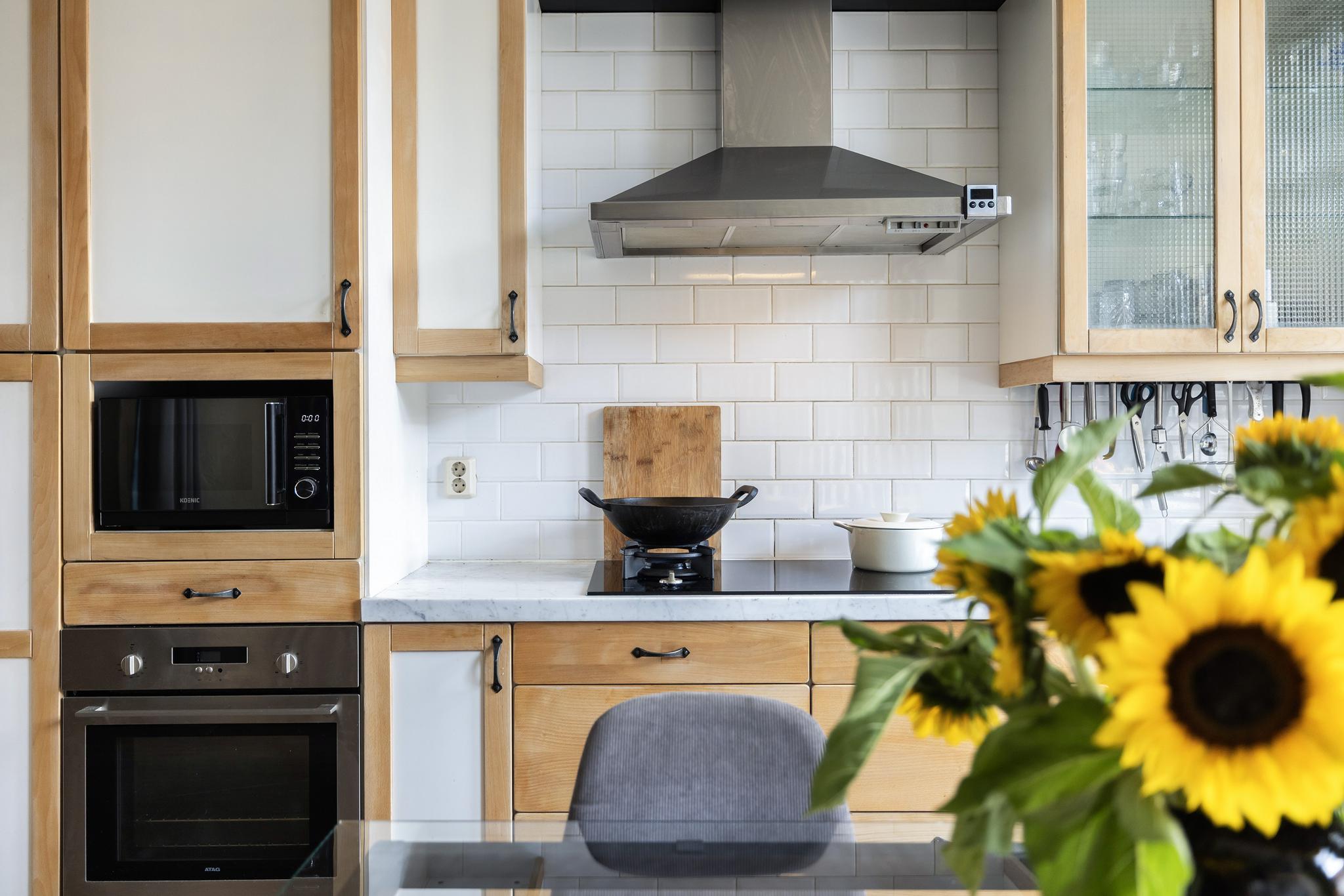 Voor de keukenprinsen en prinsessen onder ons is er een grote hoekkeuken aanwezig met voldoende ruimte voor een eettafel. De keuken is voorzien van een inductie kookplaat met wokbrander, afzuigkap, Quooker, vaatwasser, koelkast, vriezer (3 a 4 jaar oud), oven en losse magnetron. De keuken is afgewerkt met een marmeren blad.