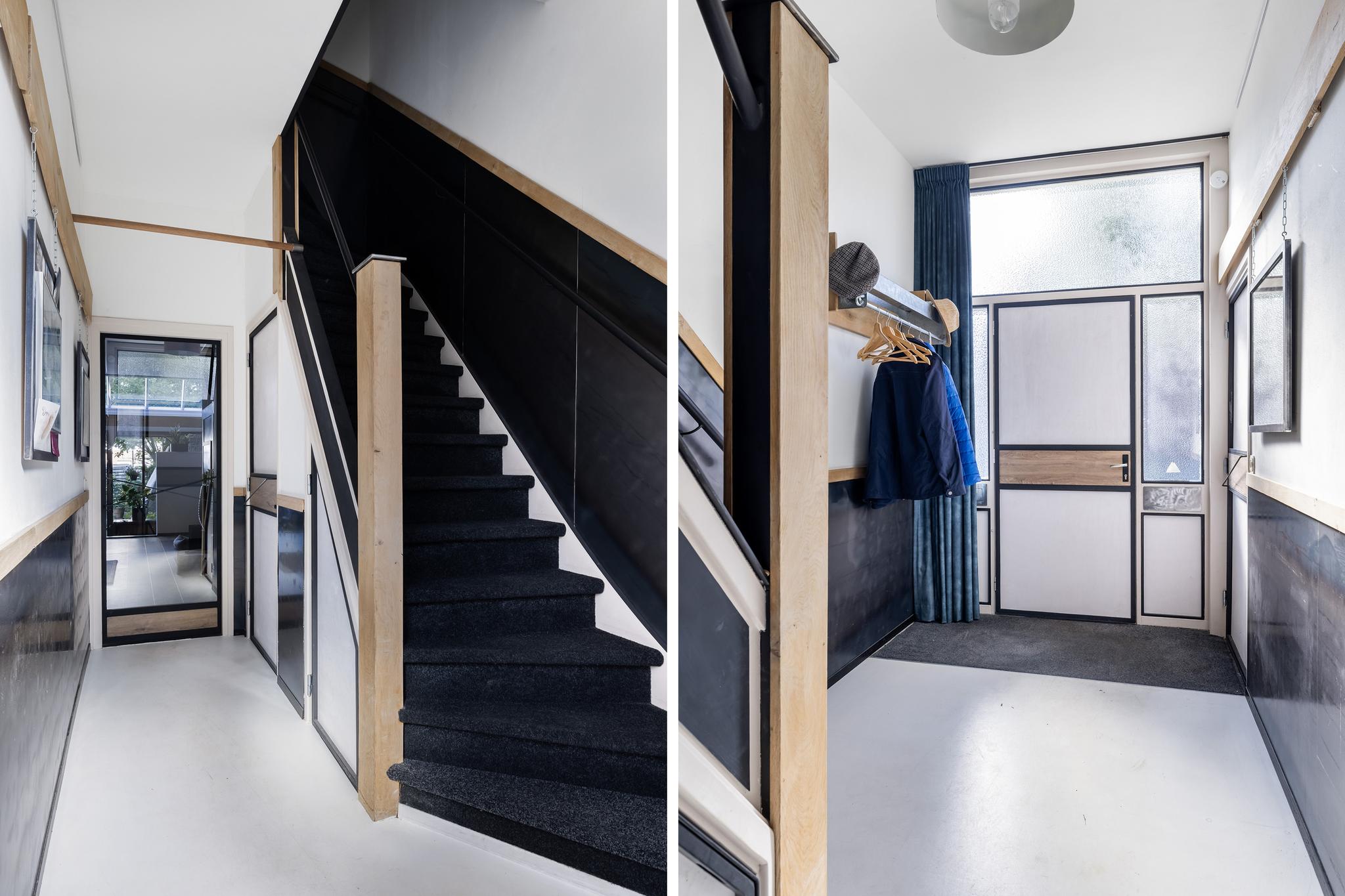 Entree in de hal met meterkast, trapkast, toilet, trapopgang en deur naar de woonkamer.