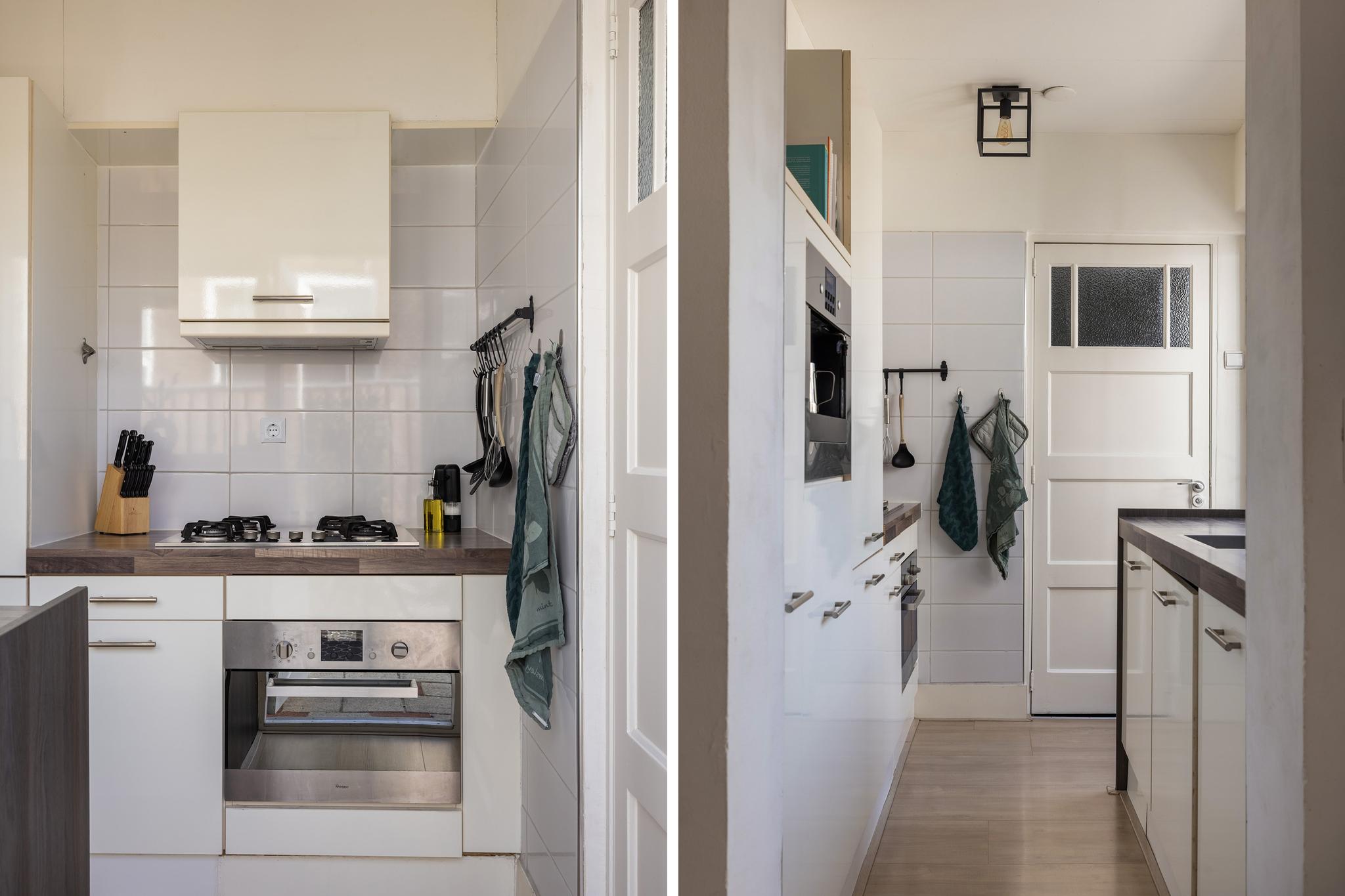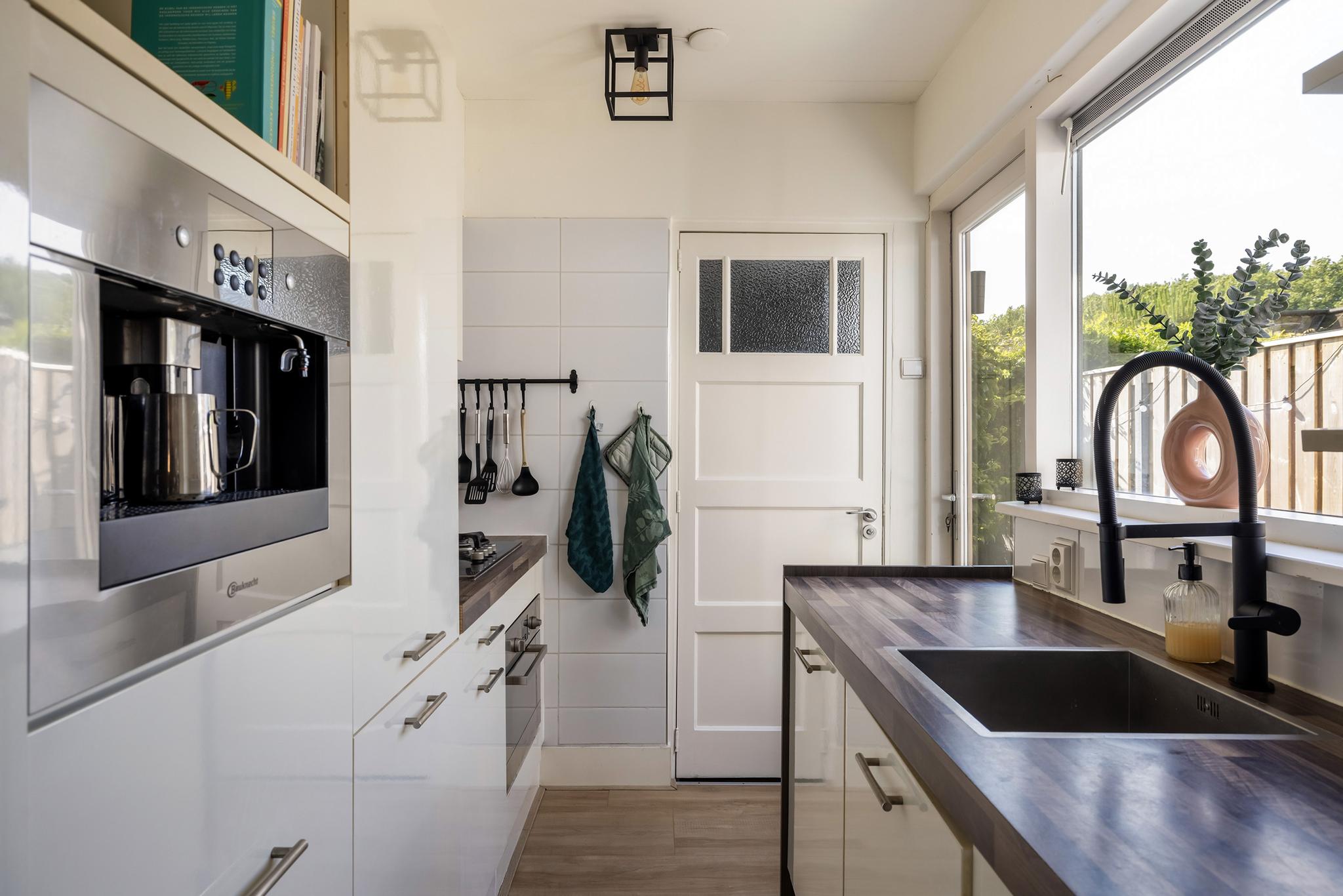 Moderne keuken in dubbele wandopstelling, voorzien van een 4 pit gaskookplaat, afzuigkap, koelkast, vriezer, combi-oven, vaatwasser en een praktische apothekerskast. Via de keuken is de badkamer aan achterzijde begaanbaar. Daarnaast is de tuin begaanbaar vanuit de keuken.