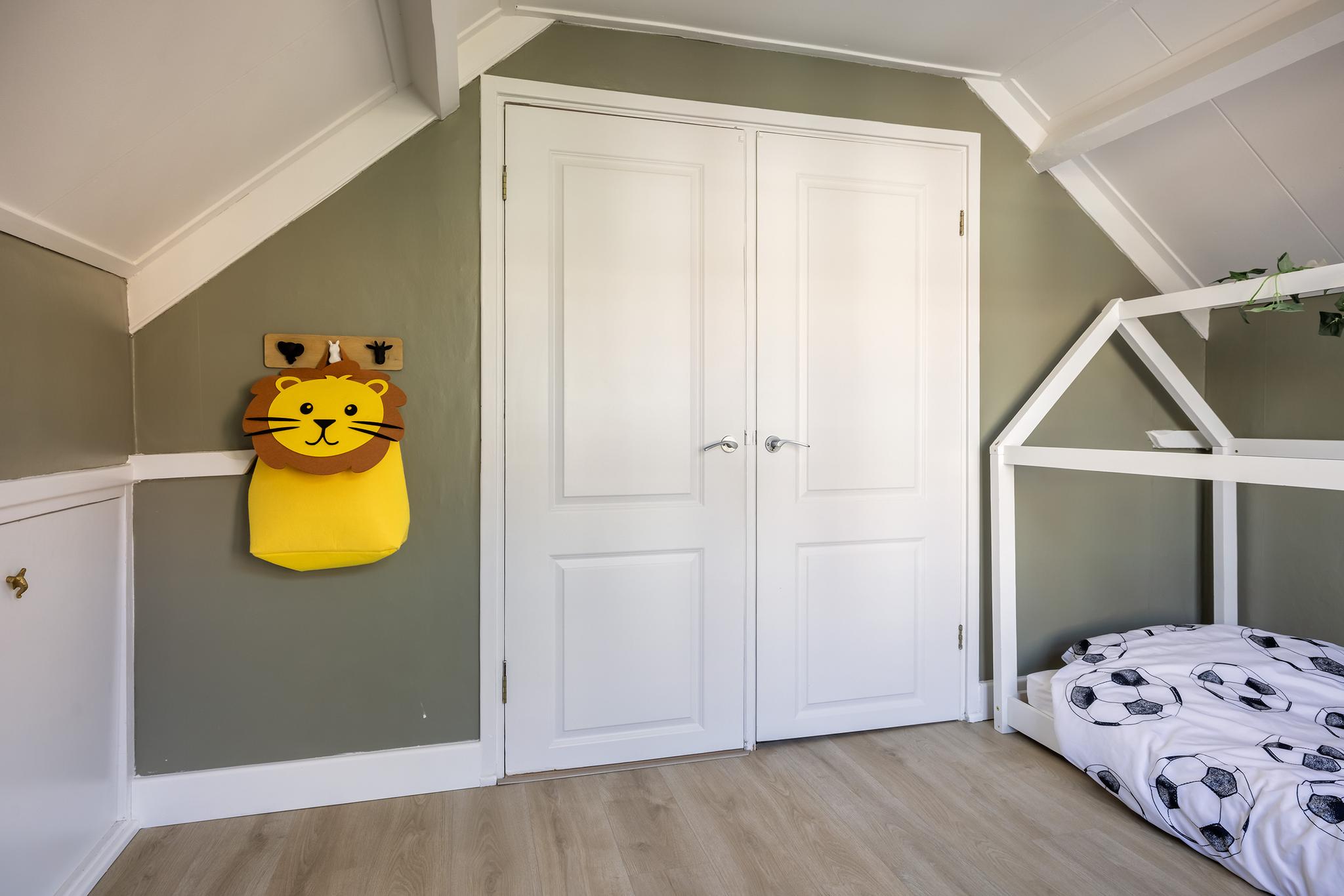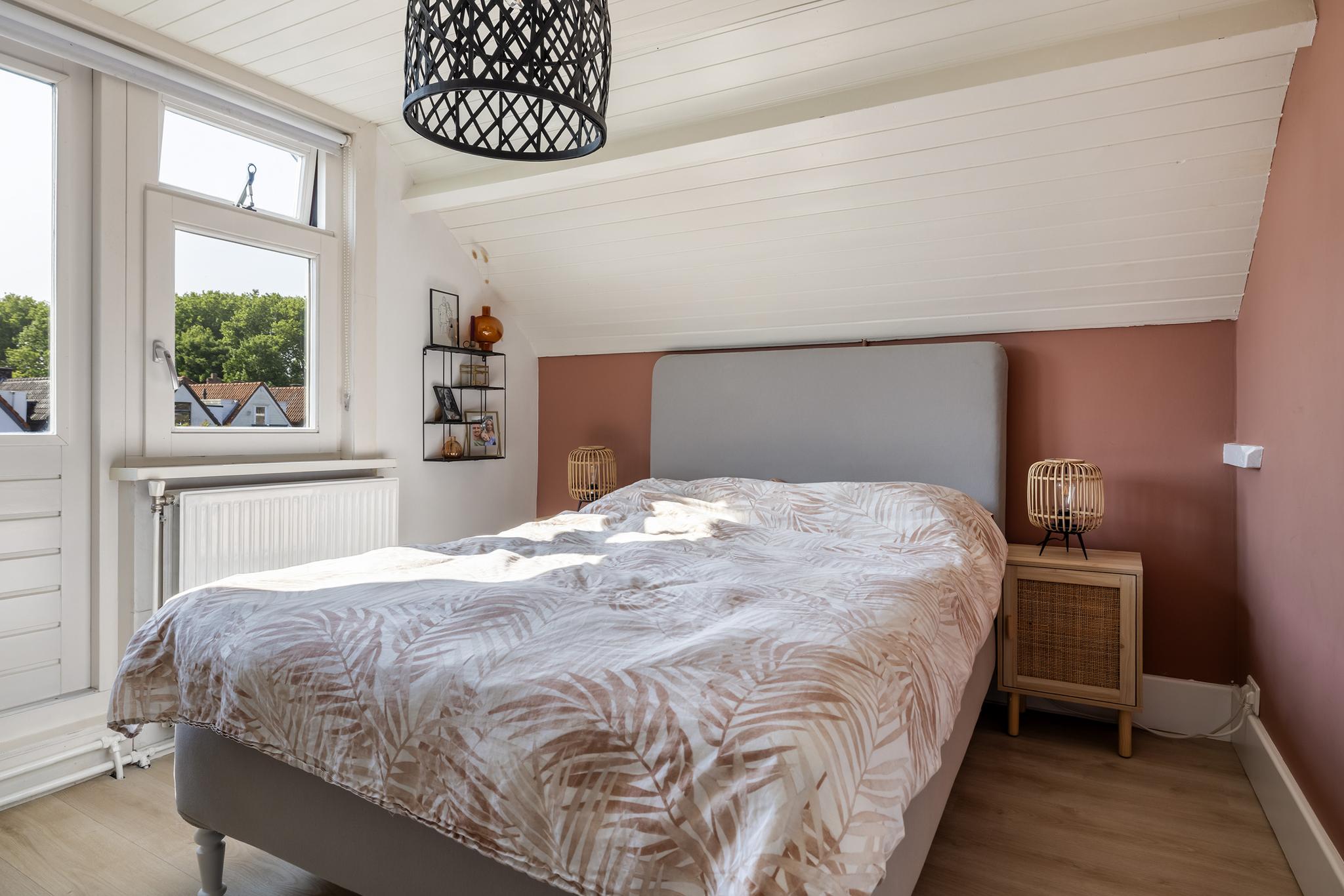 Slaapkamer aan achterzijde, voorzien van knieschotten met schuifdeuren.