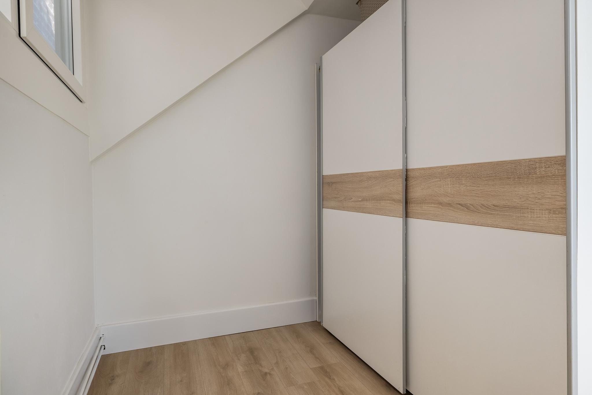 Slaapkamer aan zijkant, momenteel in gebruik als bergruimte. Hier is in 2024 een nieuwe dakkapel met kunststof kozijnen aan zijkant geplaatst, waardoor een fijne kamer is ontstaan.
