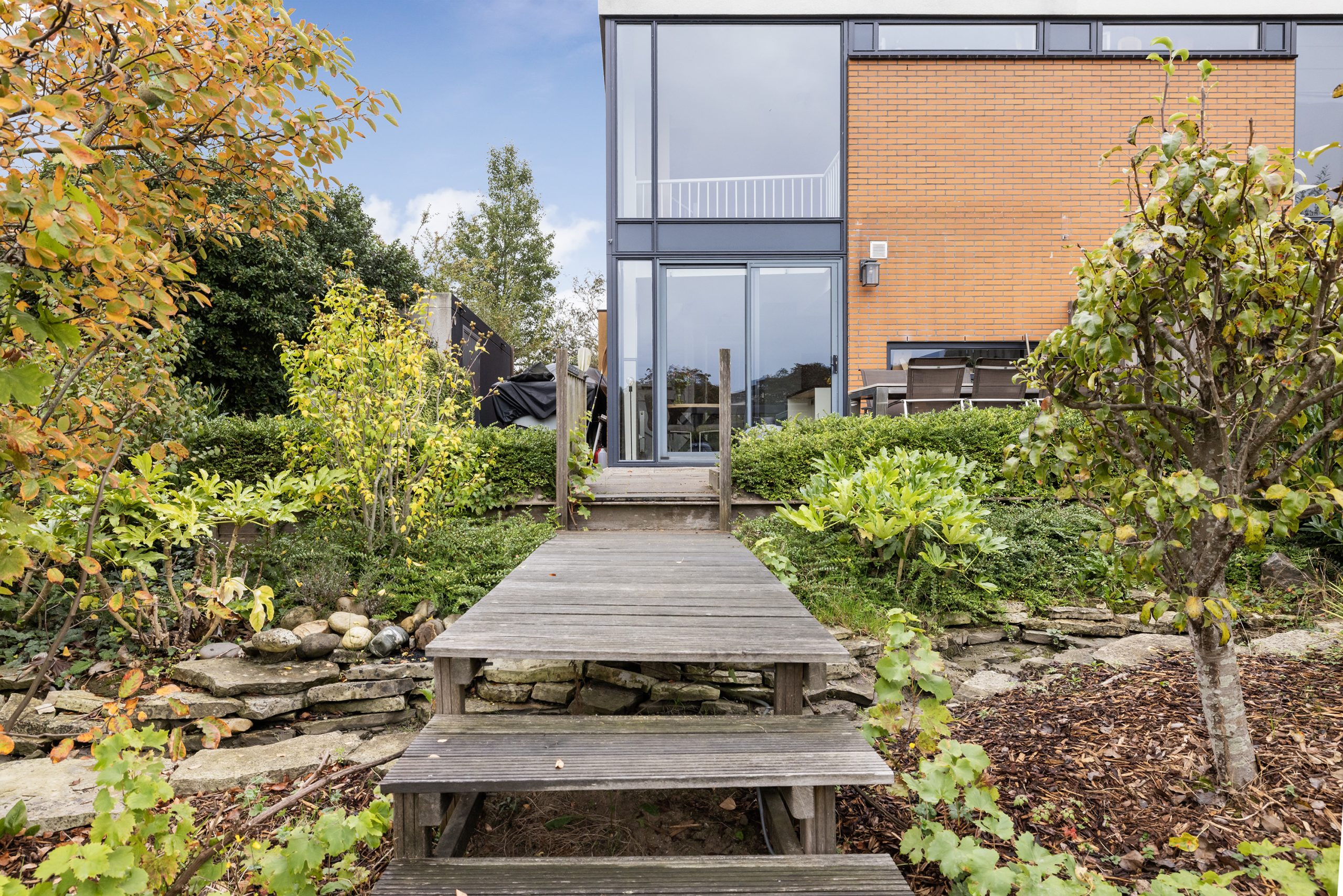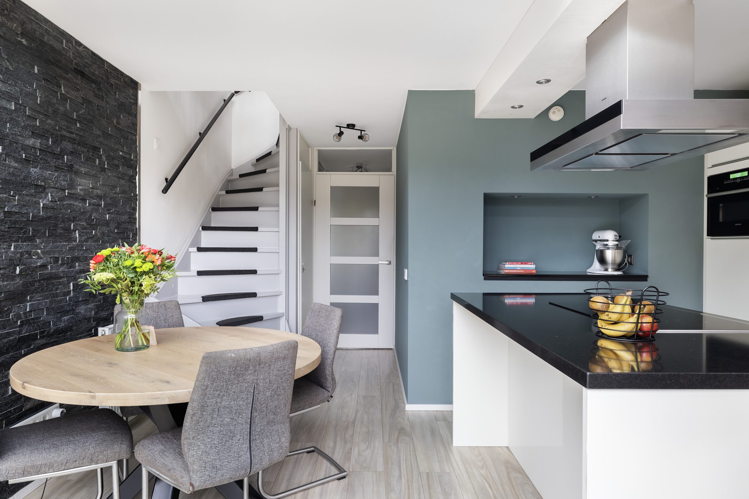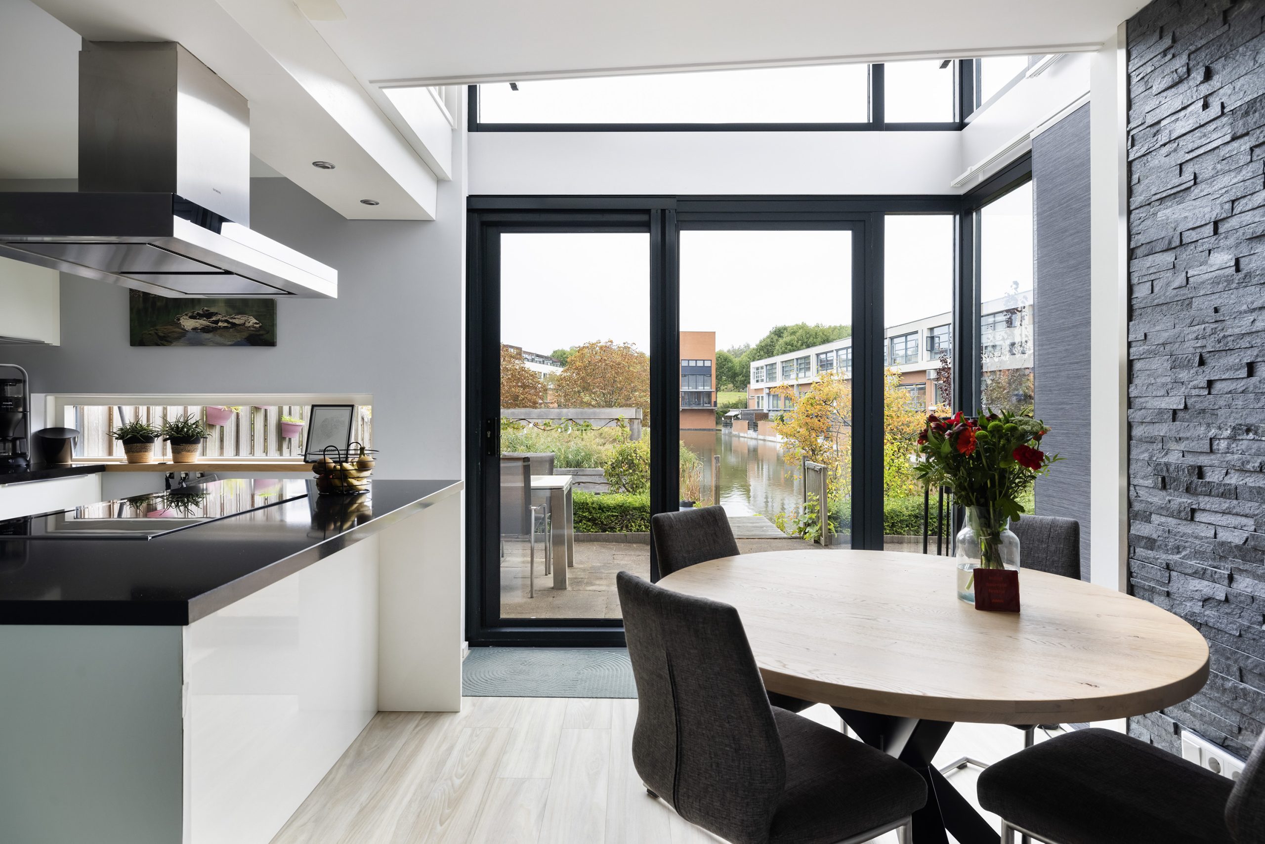 Binnen is het al net zo’n feestje. De speelse indeling zorgt voor een verrassend ruimtelijk gevoel. Je komt binnen, loopt via de hal naar de moderne keuken en daar begint het wegdromen al. Door de grote schuifdeuren stap je zó de tuin in, richting de vlonder aan het water. Even zitten, eendjes kijken, een drankje erbij... Meer heb je eigenlijk niet nodig, hier word je al helemaal zen.