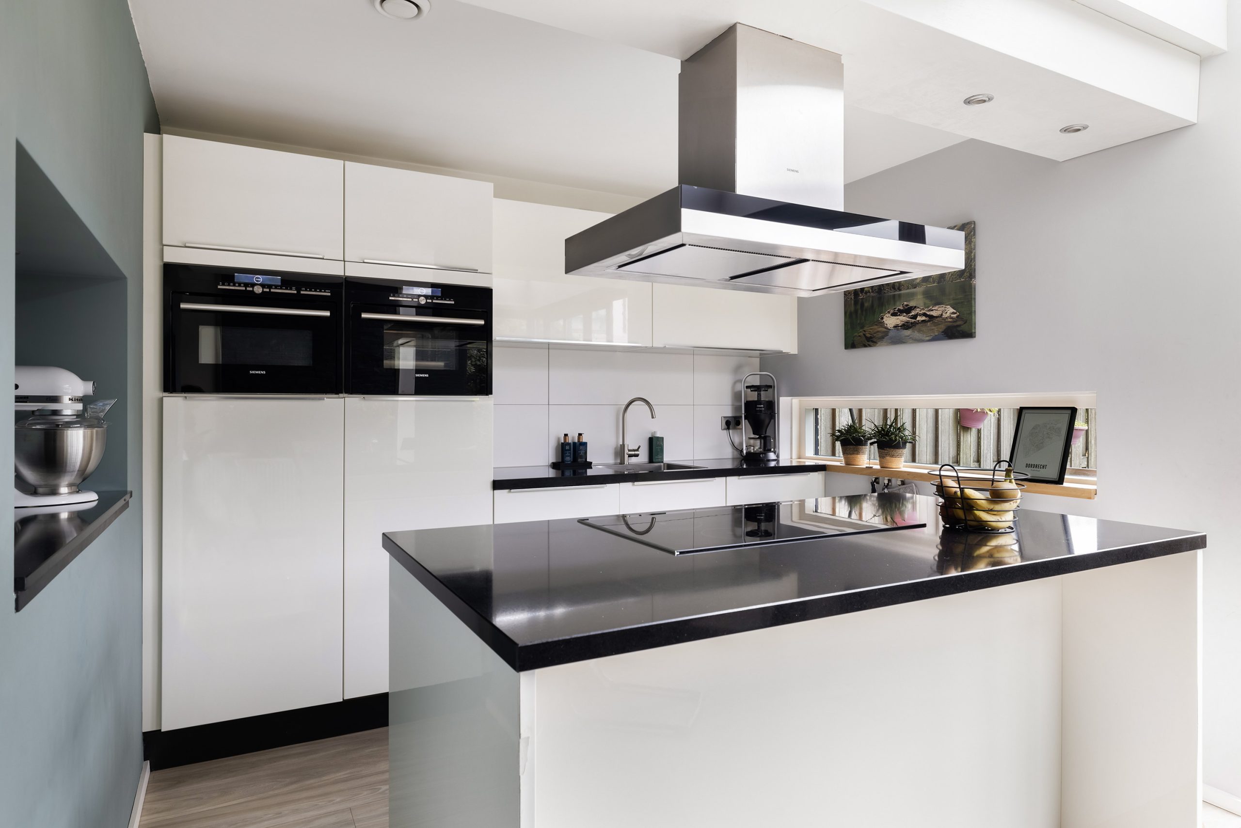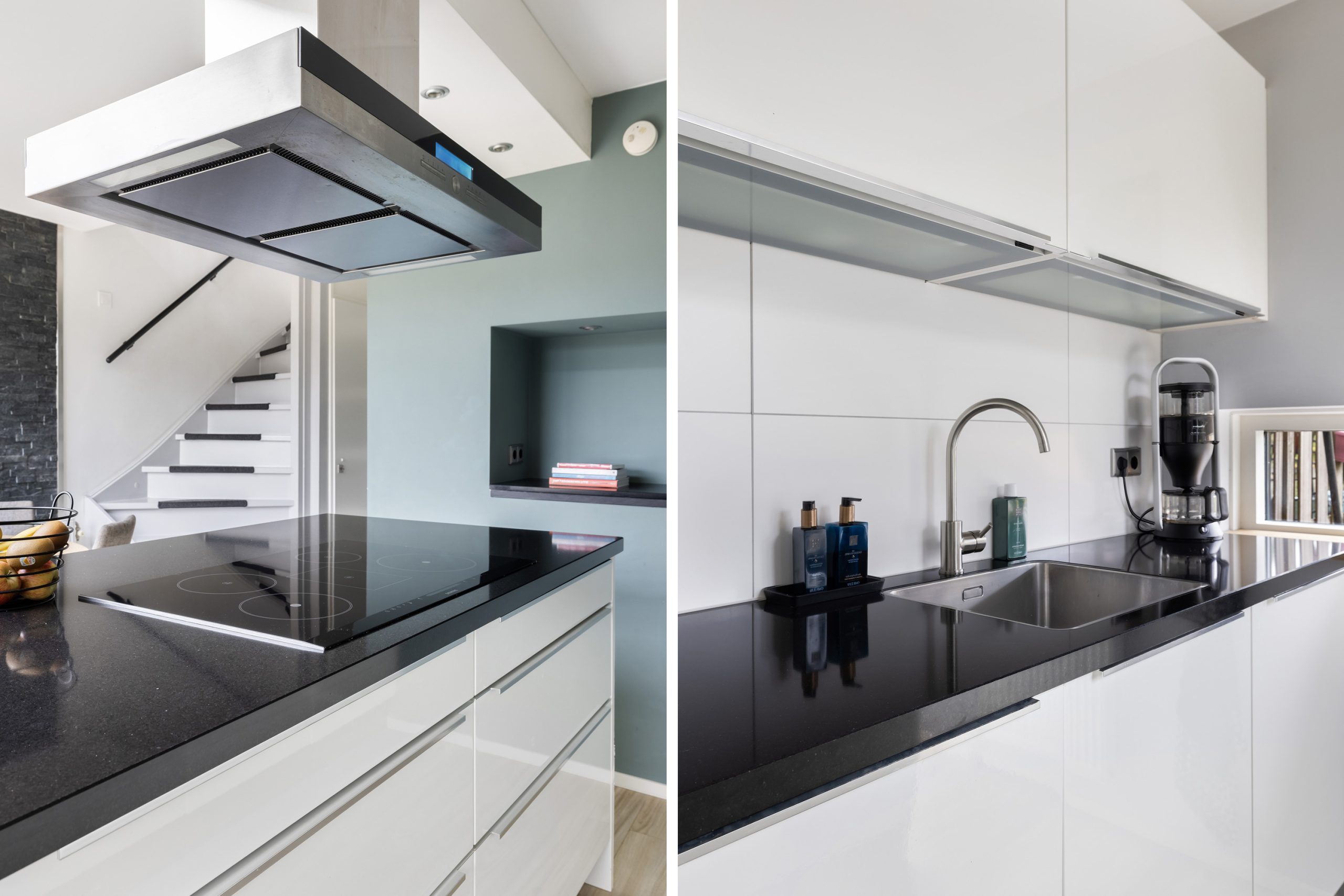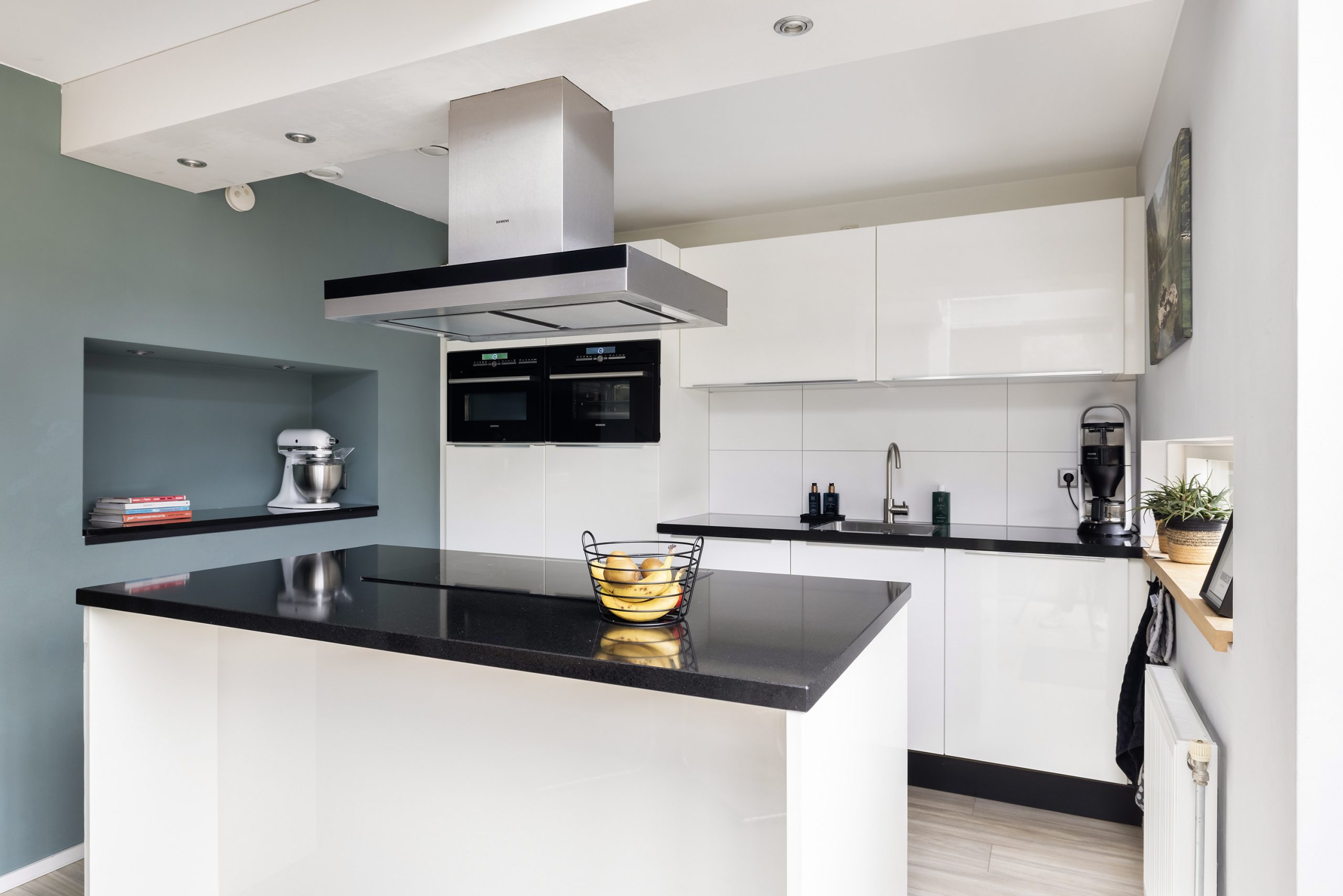 De keuken is gesitueerd aan de achterzijde (tuinzijde) van de woning. De keuken is speels geplaatst in een wandopstelling met een kook eiland, het geheel is afgewerkt met een zwart composiet blad. Qua apparatuur is hij ook goed uitgerust met een stoomoven, combimagnetron, koelkast, vriezer, vaatwasser, inductie kookplaat, rvs afzuigkap en een schuifpui naar de tuin.