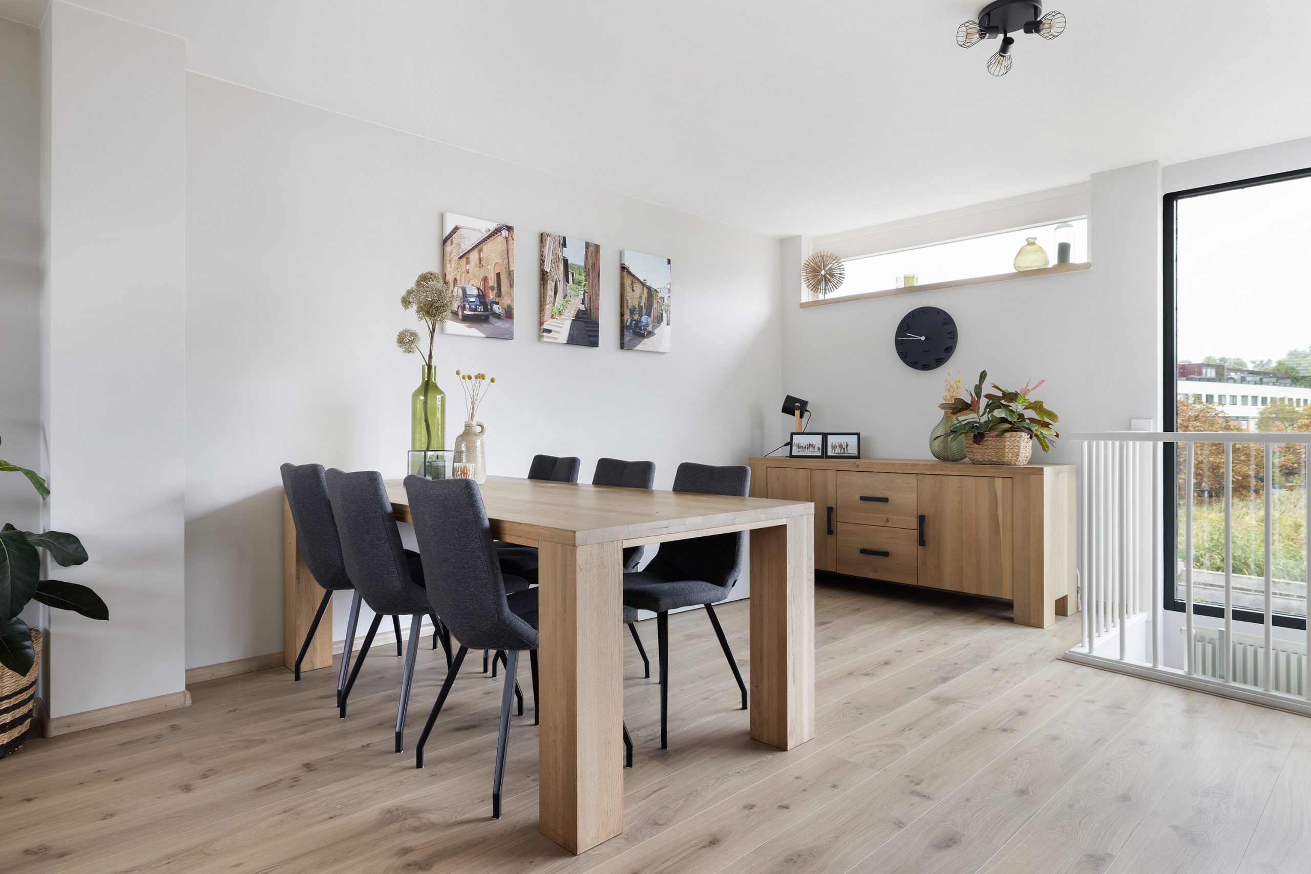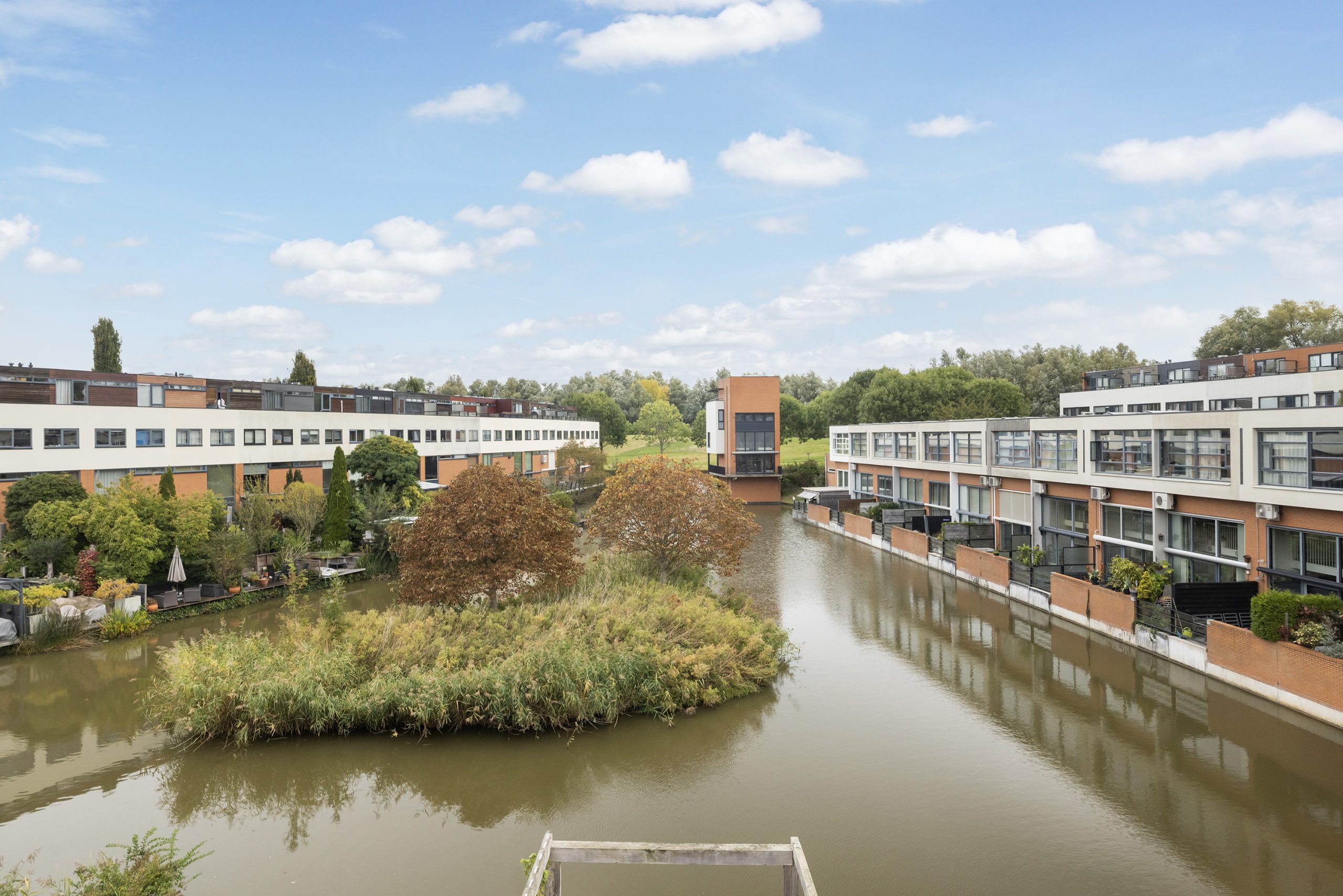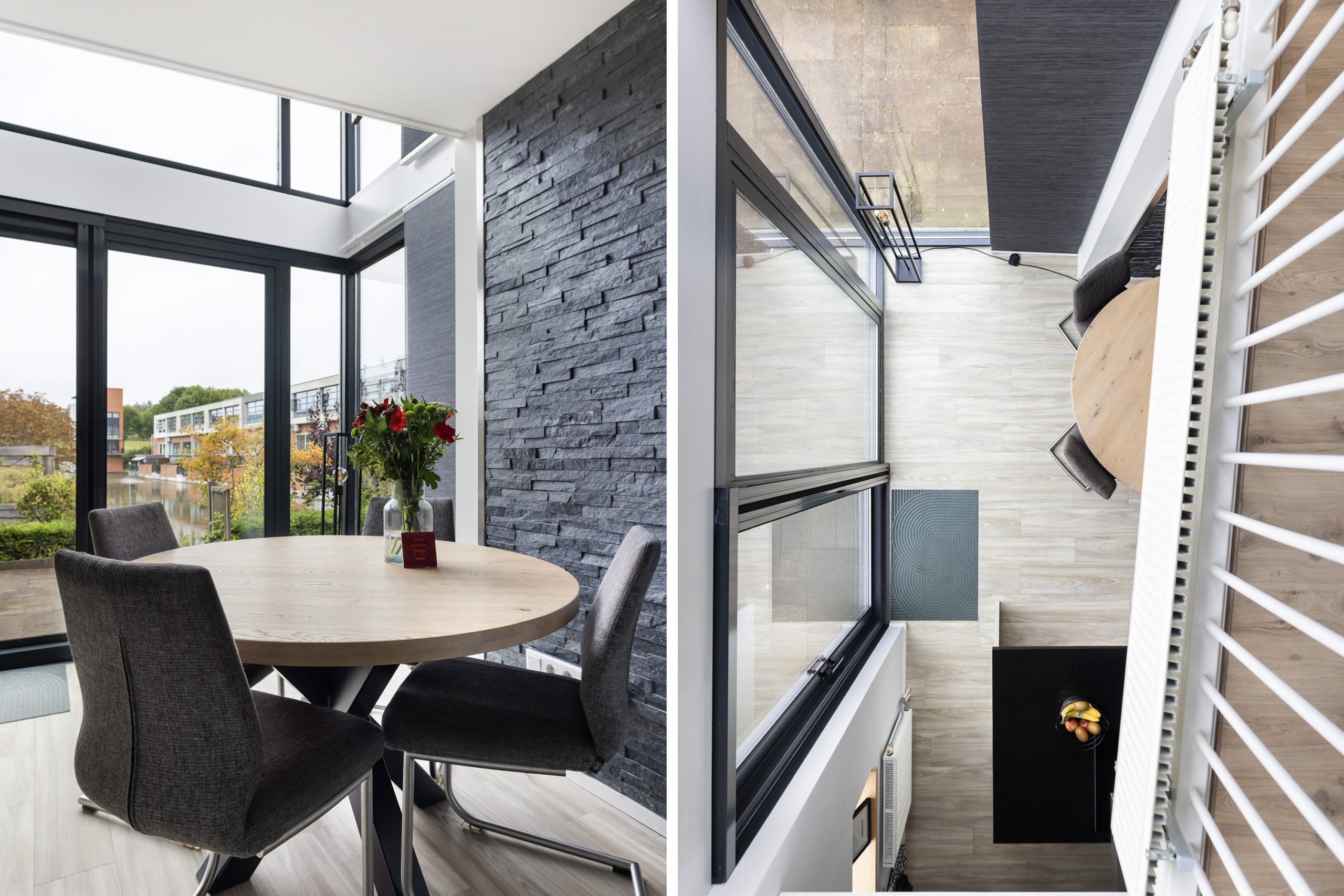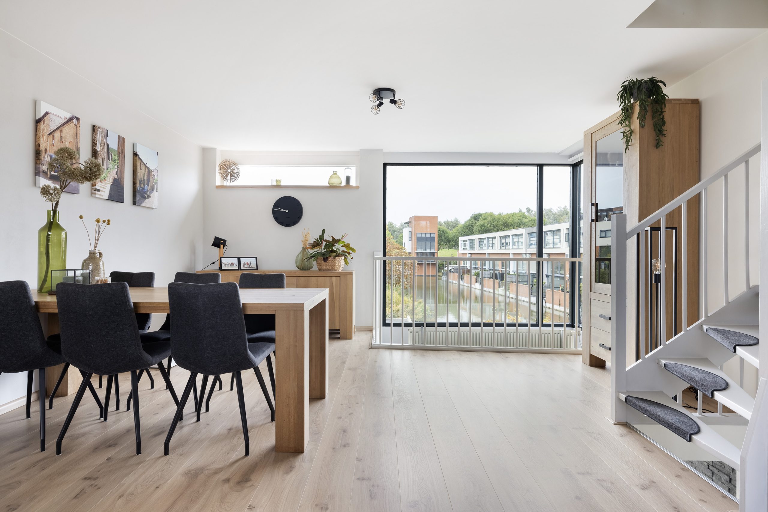 De grote raampartijen aan de achterzijde trekken het daglicht tot diep in de woning en lopen helemaal door naar boven. Vanaf de vide in de woonkamer kijk je prachtig uit over het water; een uitzicht dat nooit verveelt en dat vrije gevoel extra versterkt.