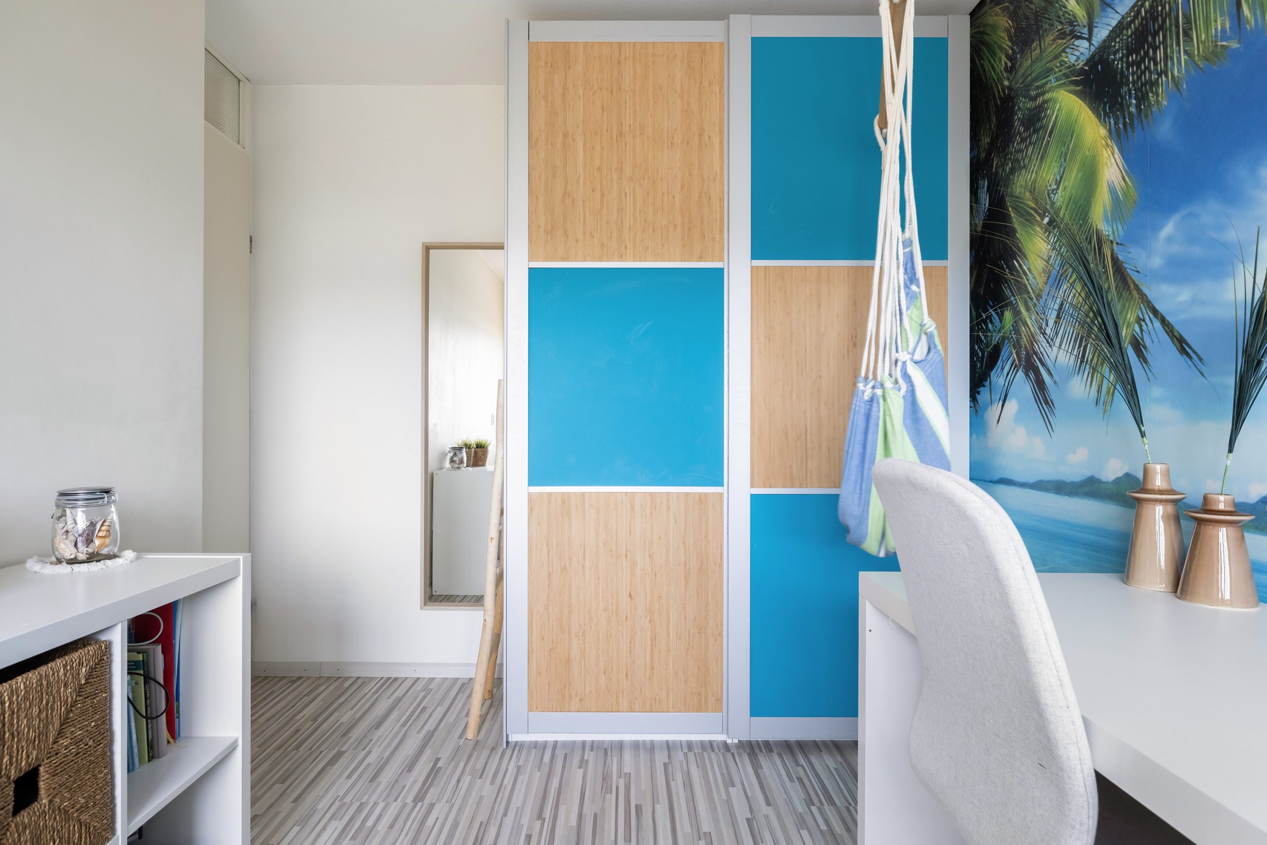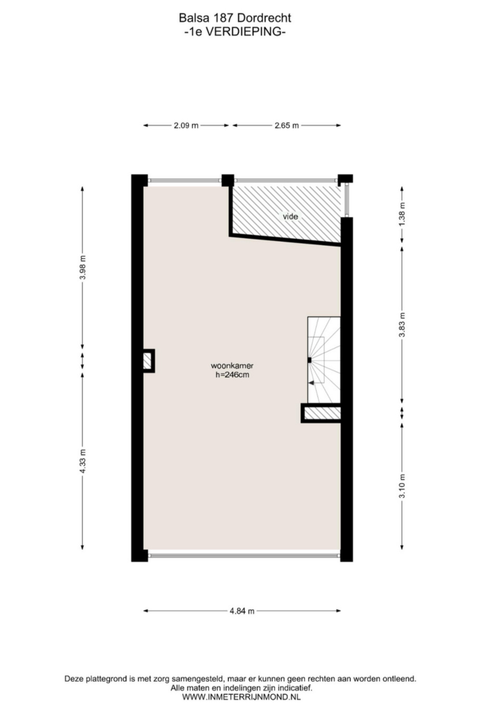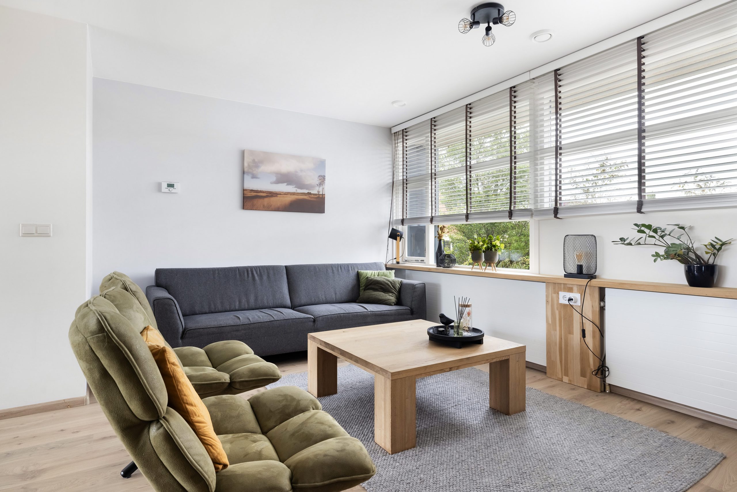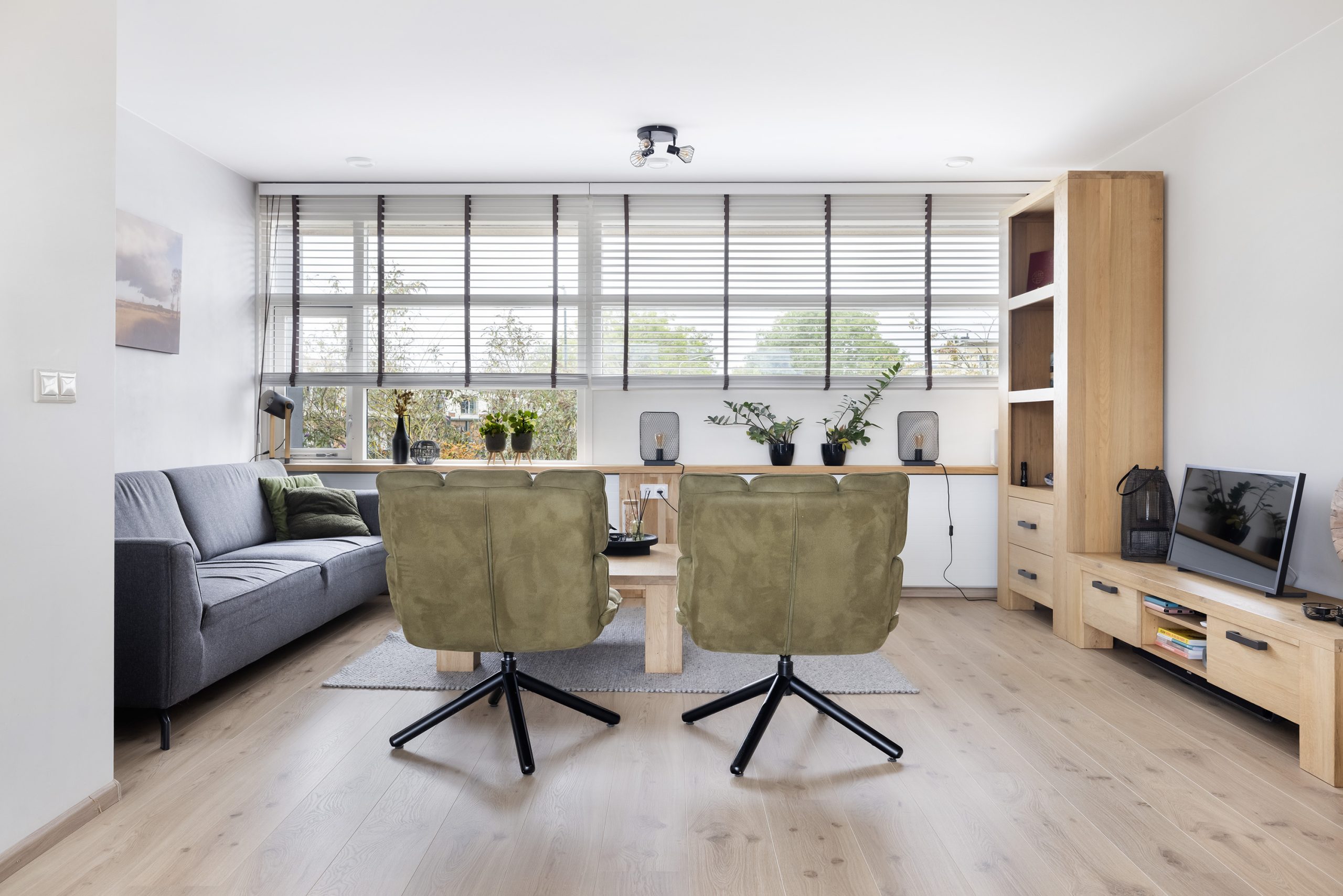 De kamer is afgewerkt met stuc wanden en een laminaat vloer, een speelse vide zorgt voor de doorkijk naar de keuken.