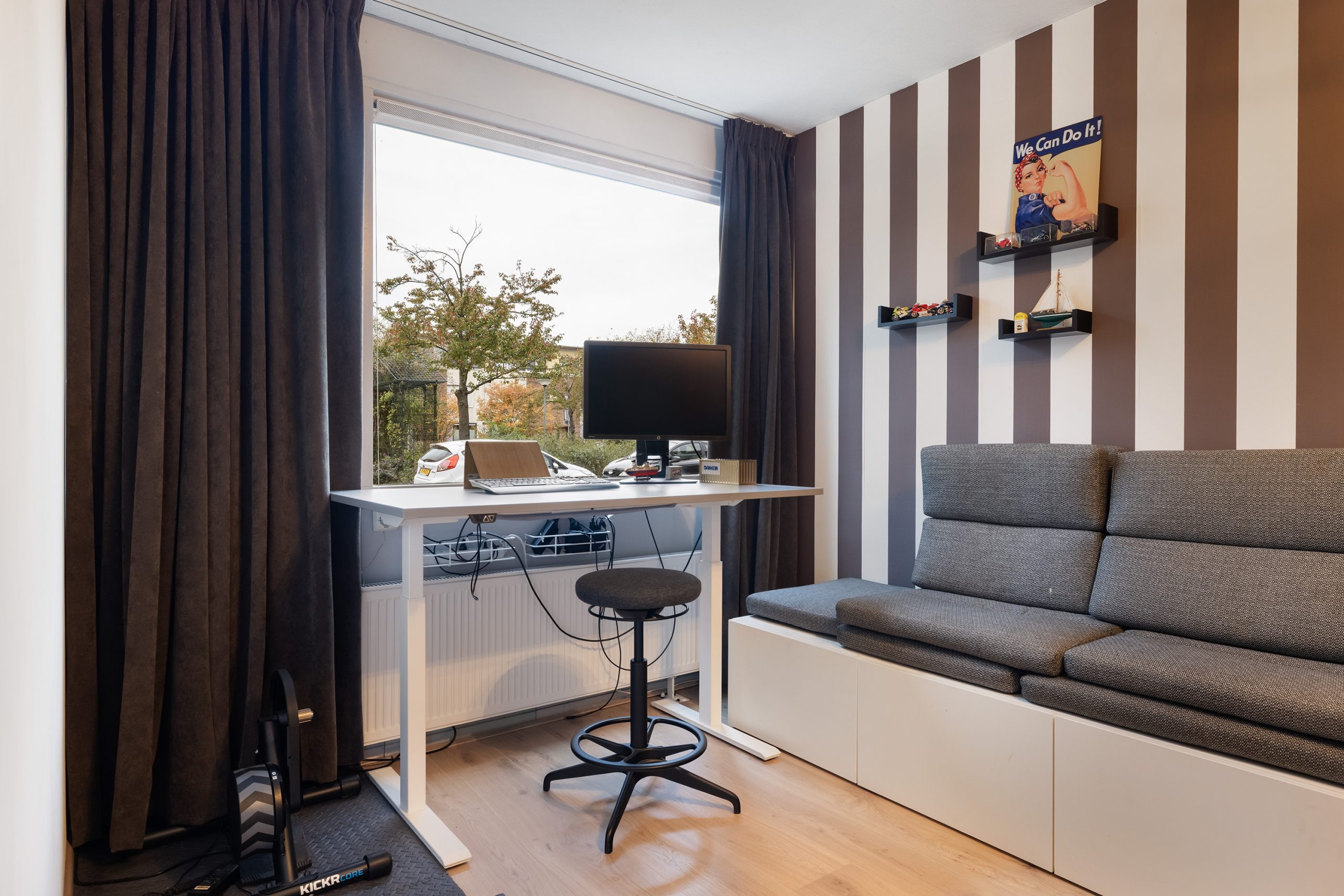 De garage is nu een mooie werkkamer geworden met was aansluiting weggewerkt achter een vaste schuifkasten wand.