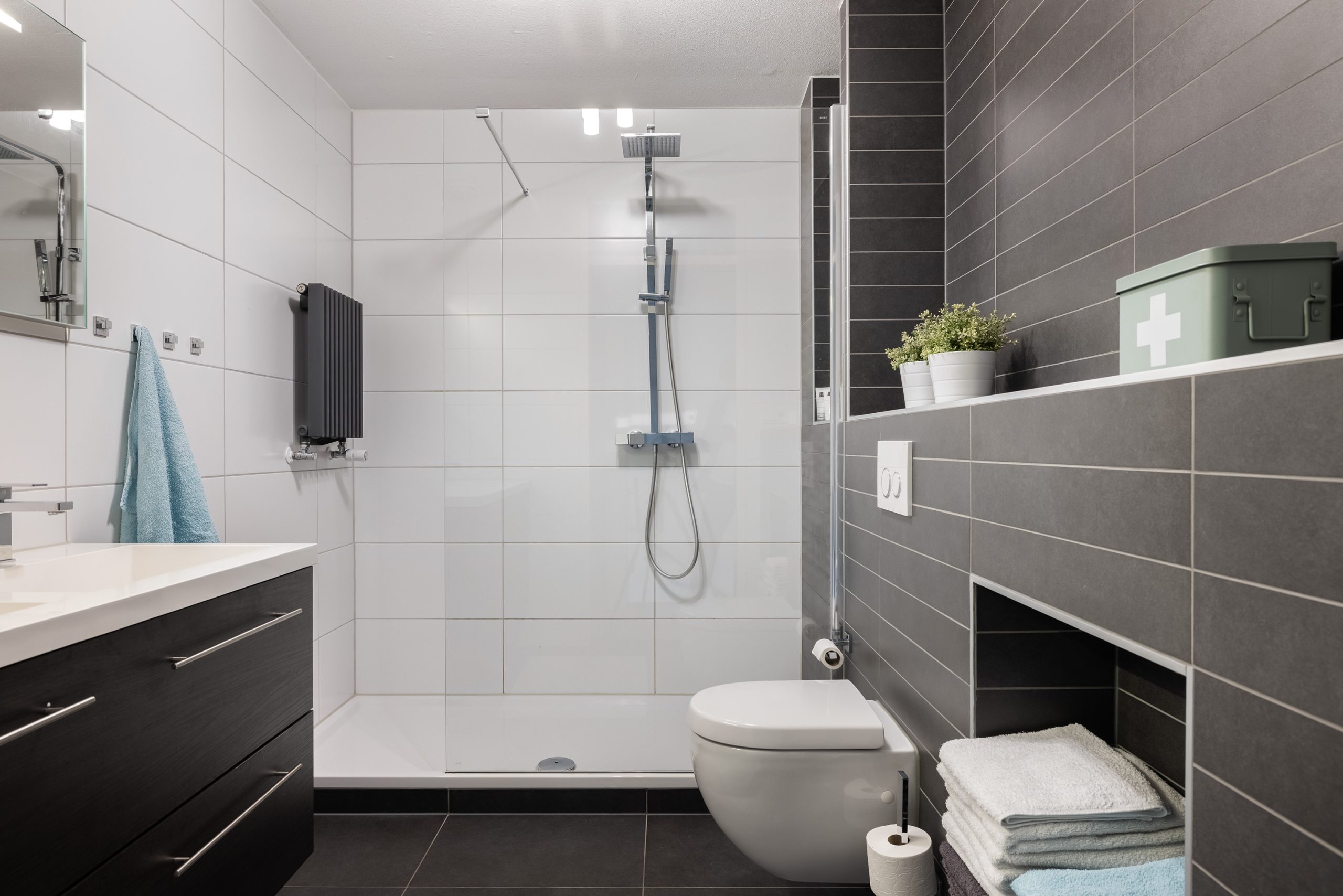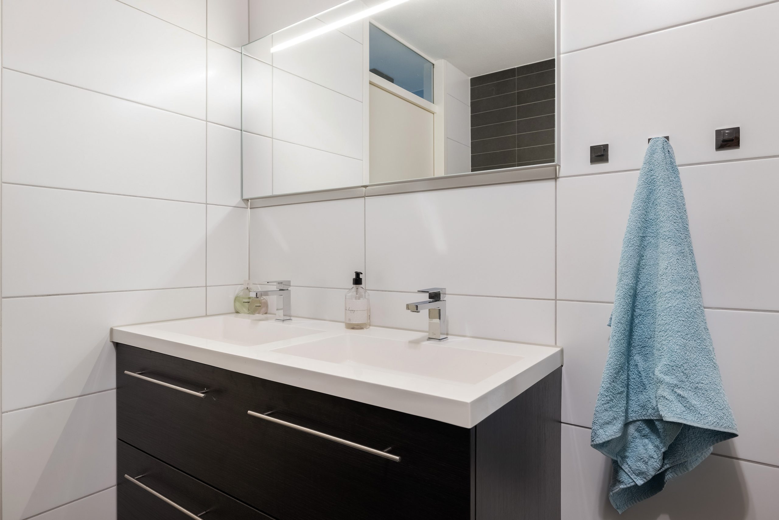 Inpandige badkamer, vervangen in 2011 en voorzien van een inloop douche, vrijhangend toilet, dubbele wastafel en meubel, designradiator en geheel betegelde wanden.
