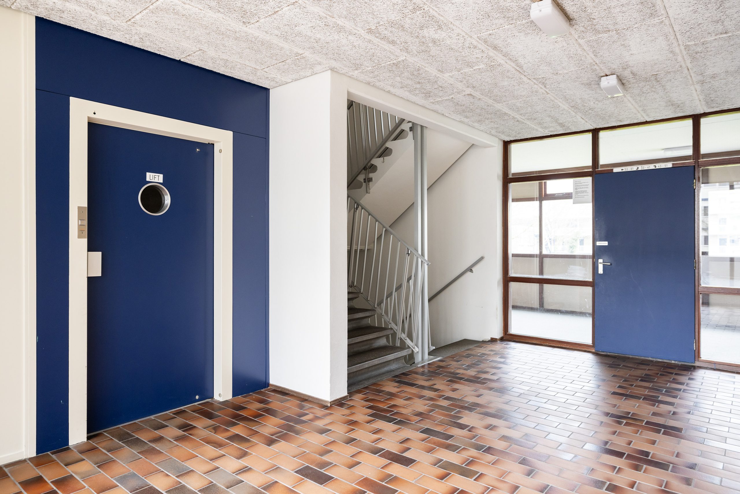 Entree in de afgesloten hal met brievenbussen en bellen tableau, toegang tot de lift, het trappenhuis en de bergingen in de onderbouw.