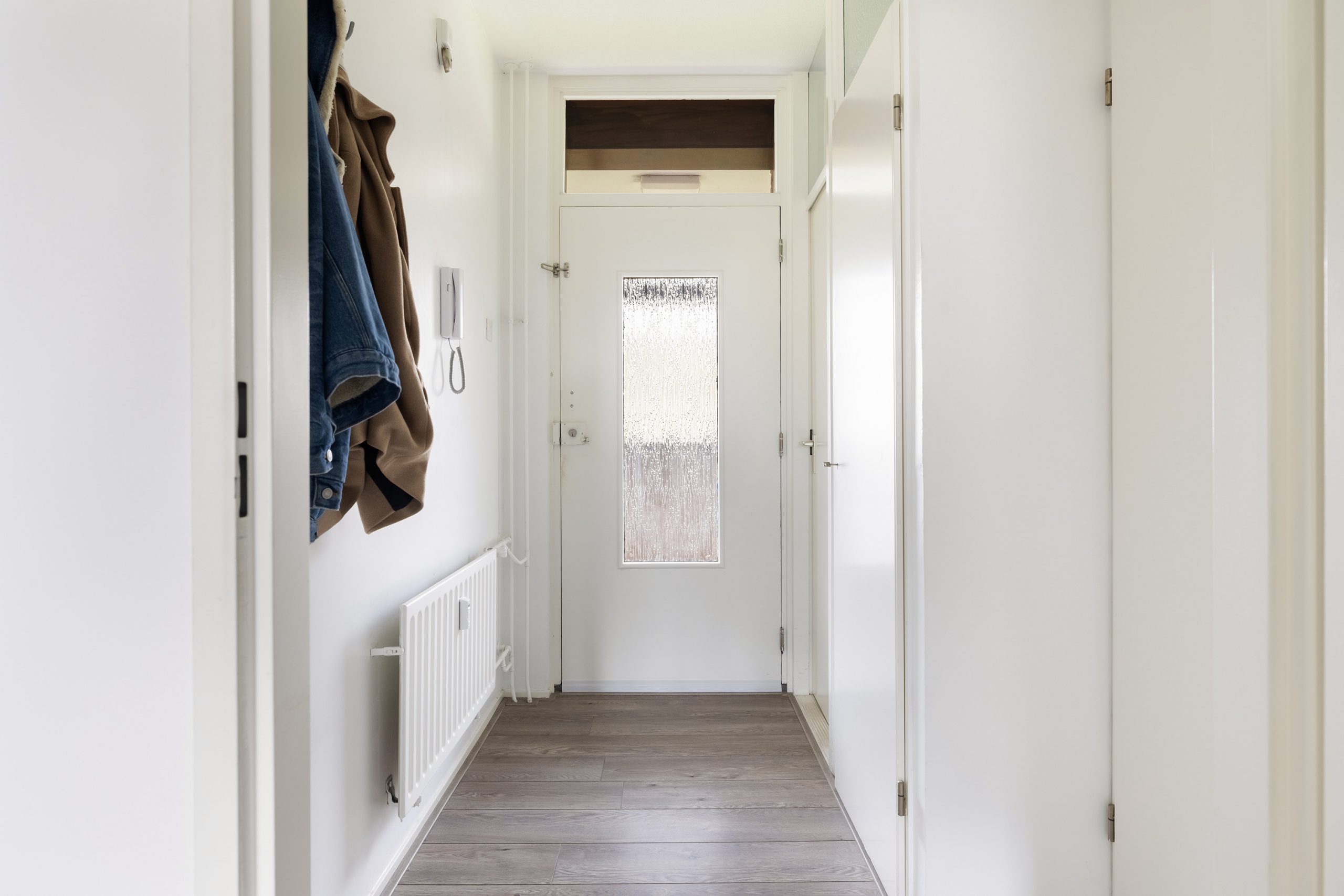 Entree in hal met meterkast, toegang tot de ruime inpandige berging, de badkamer en de woonkamer.