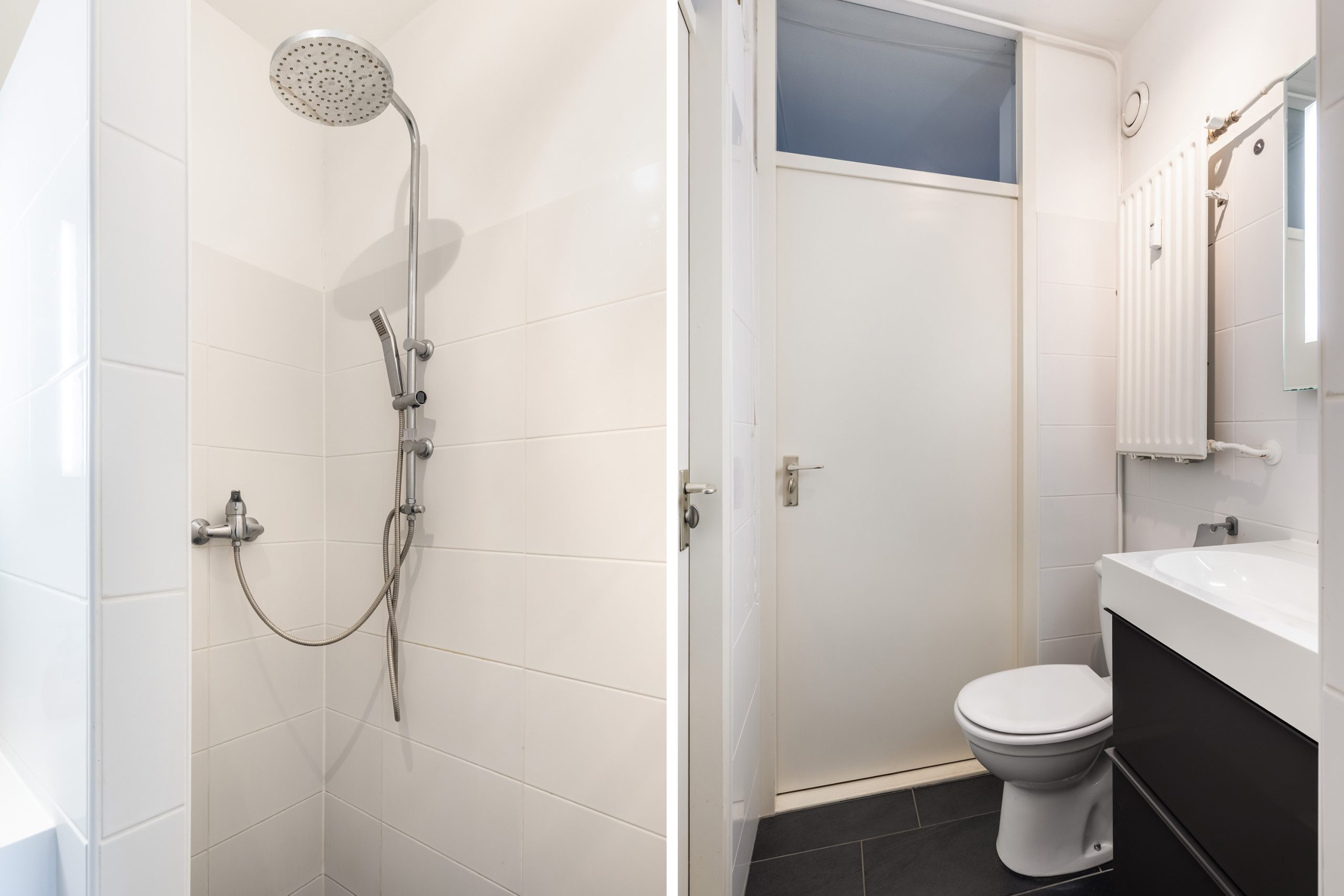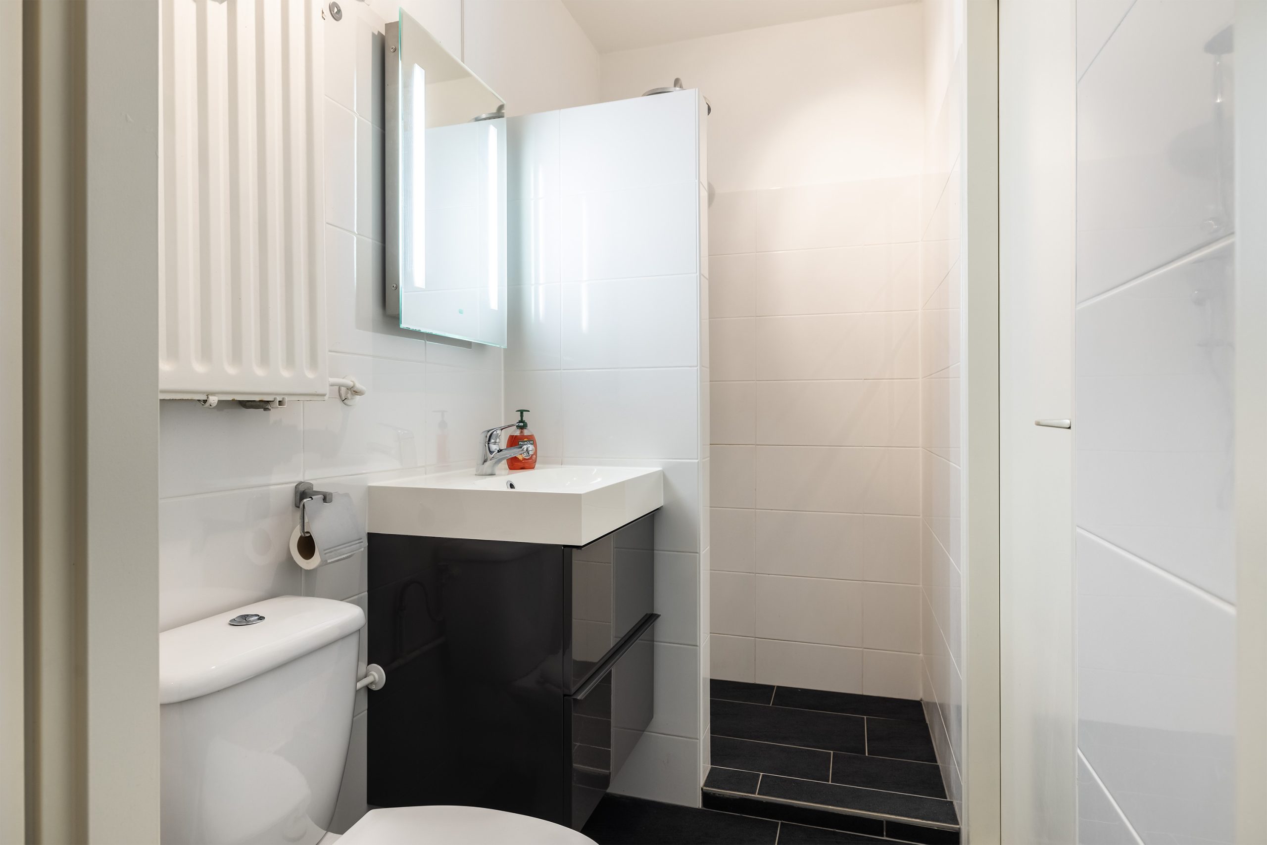 De badkamer is zowel vanuit de slaapkamer als de hal begaanbaar. De badkamer is volledig betegeld en voorzien van een duoblok toilet, wastafel met meubel en ruime douche met regendouche en thermostaatkraan.