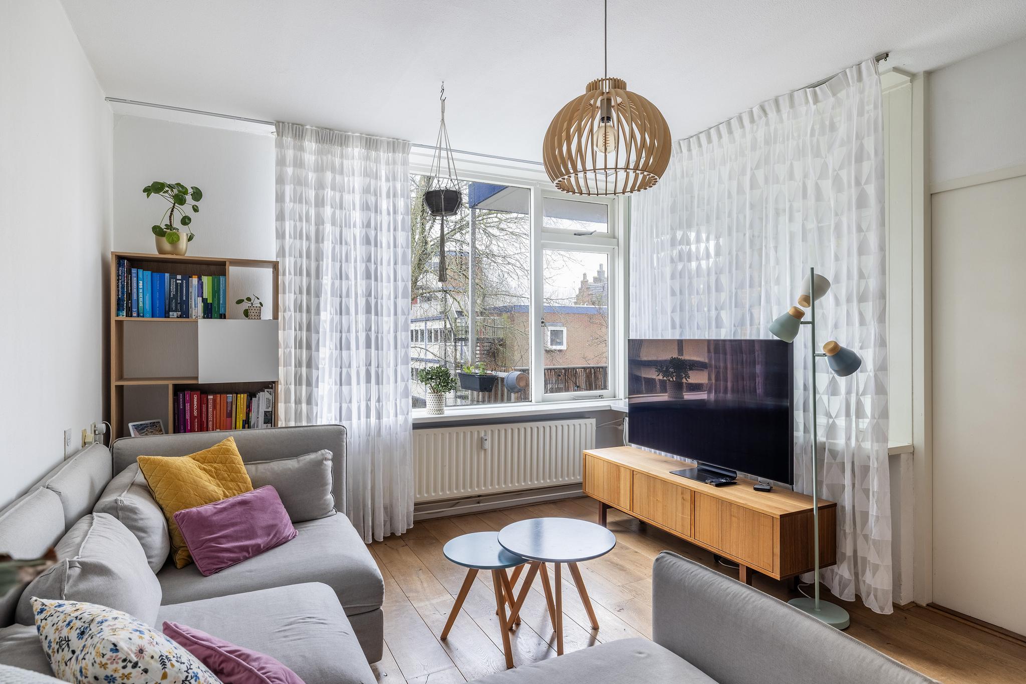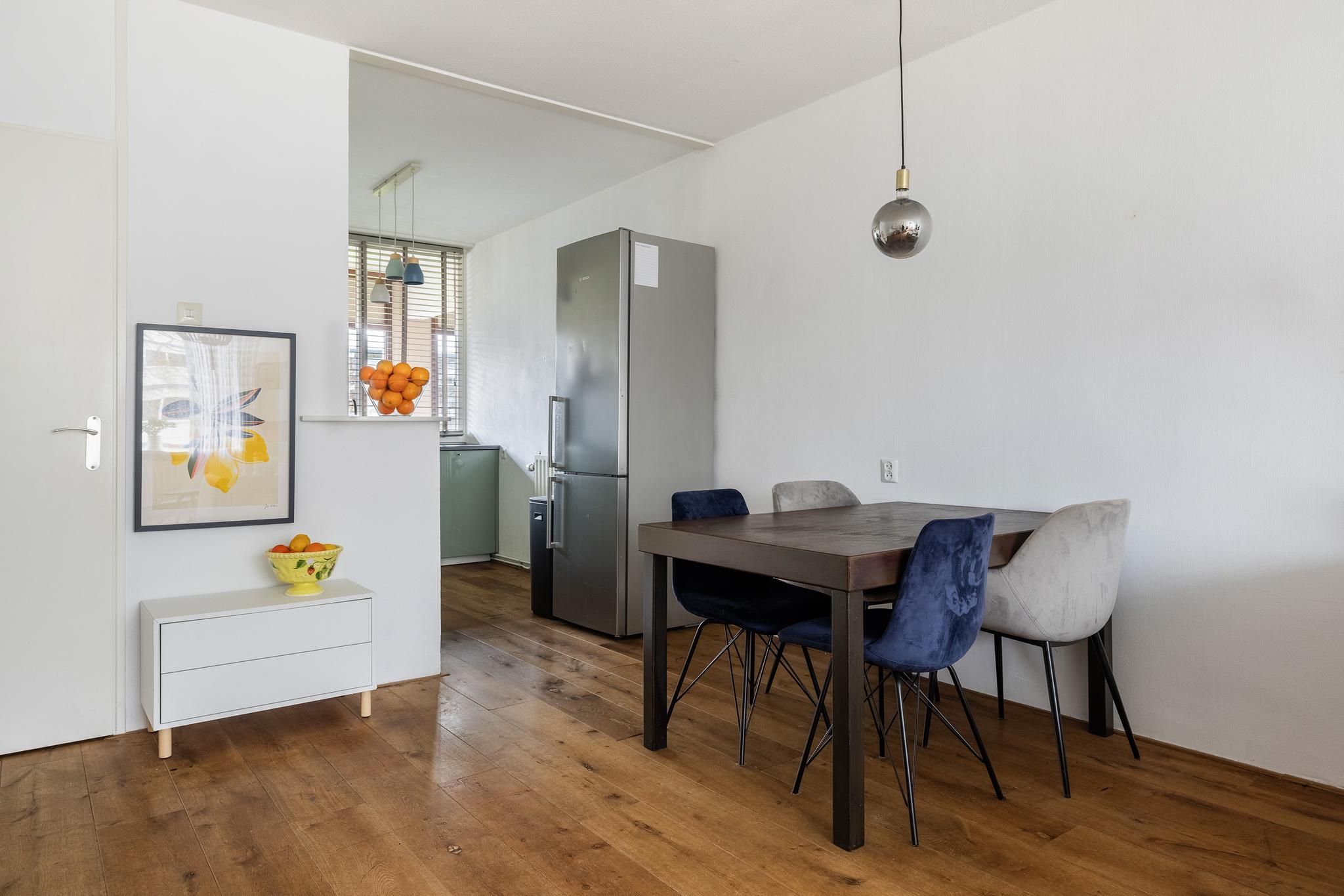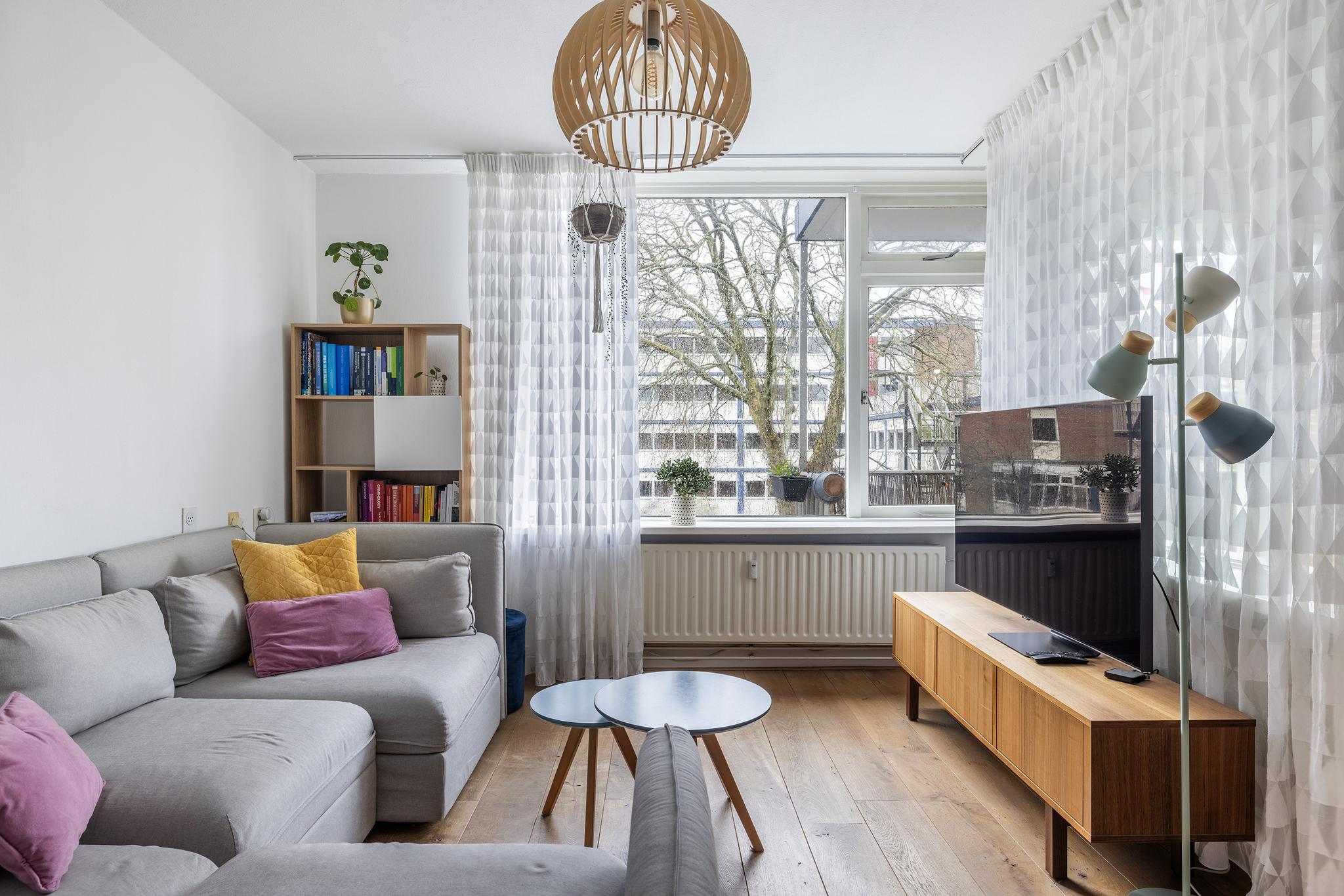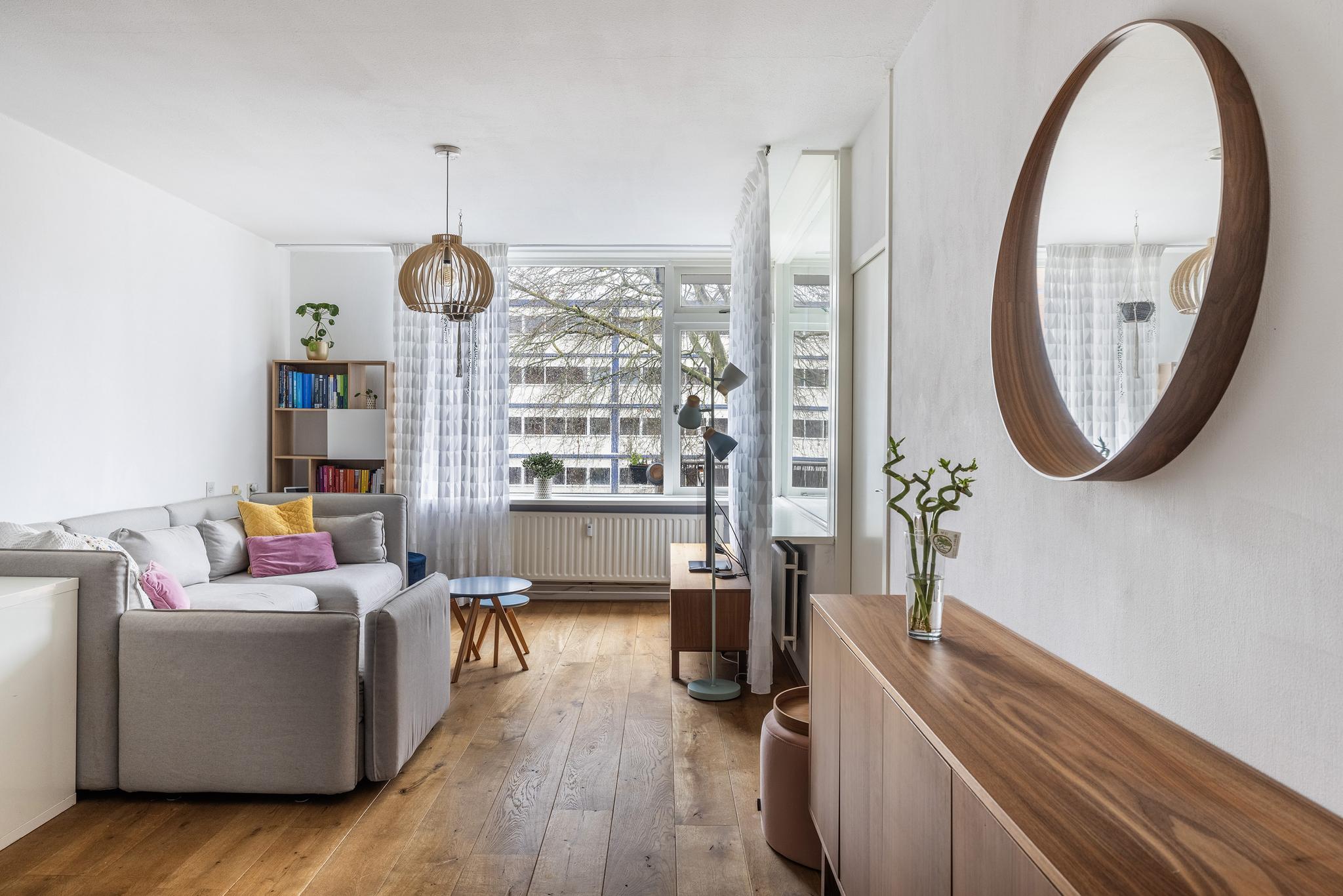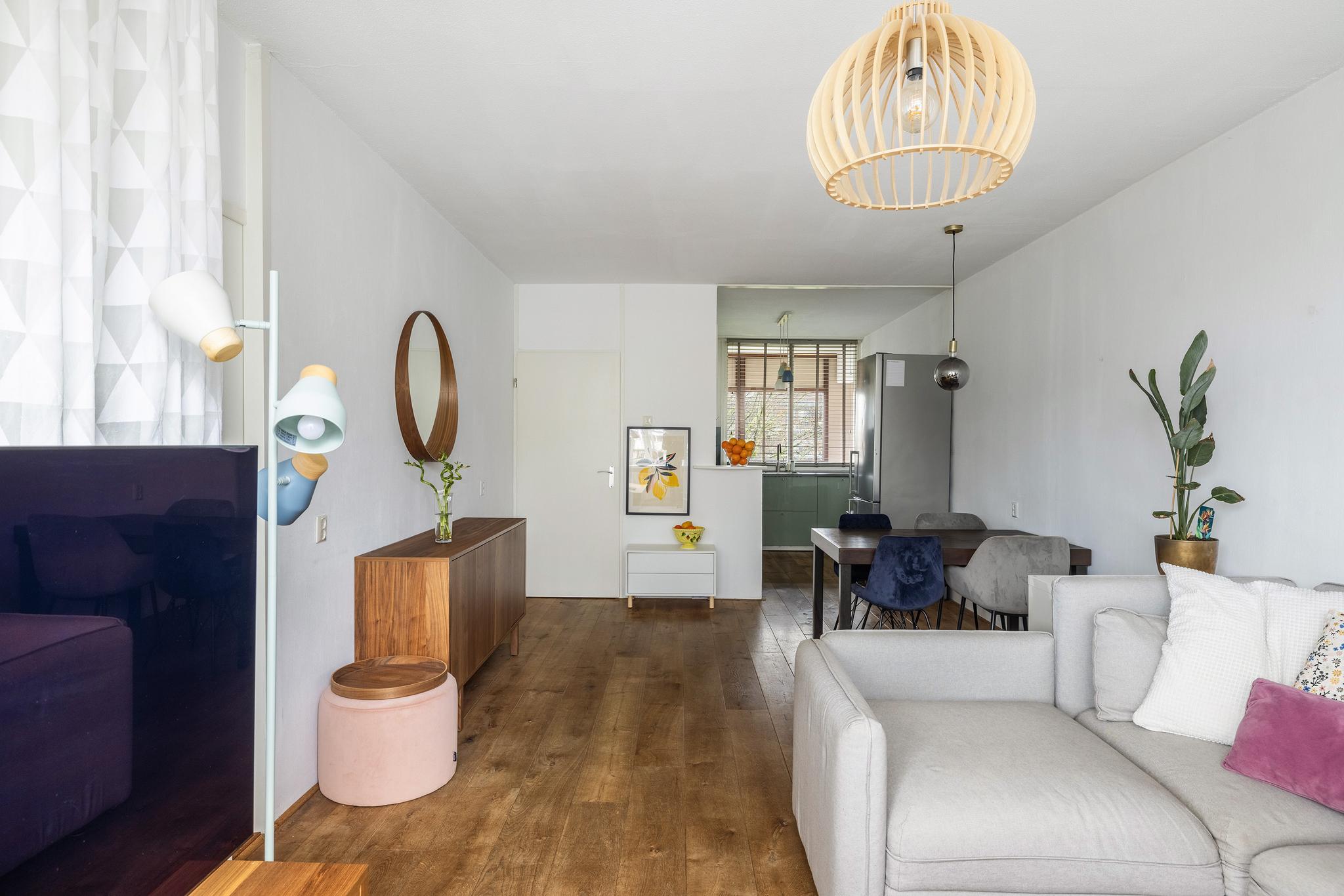 Heerlijke ruime woonkamer met aan de galerij zijde de keuken en aan de achterzijde toegang tot de slaapkamer. De kamer heeft mooie grote raampartijen.