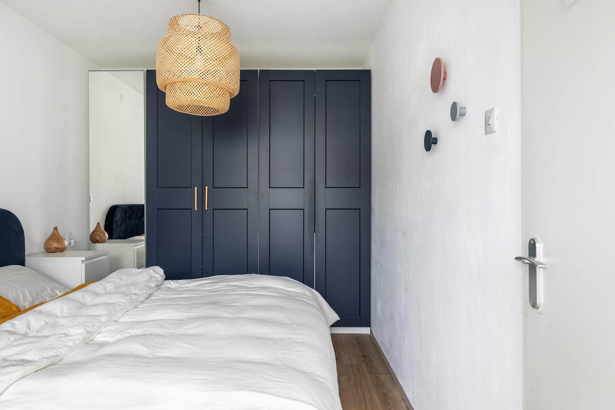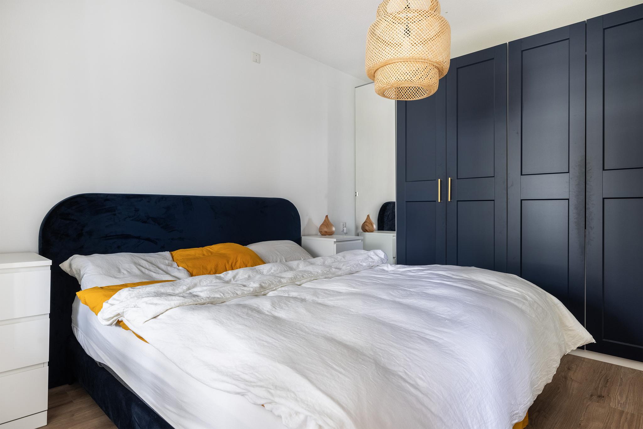 De slaapkamer is goed ruim, meer dan genoeg ruimte voor een grote kastenwand. Vanuit de bouw was er een deur naar de badkamer aanwezig, deze is verwijderd dus de ingang naar de badkamer is via de hal. Dit zorgt voor een mooie extra wand om de kasten tegenaan te zetten en de kamer is flexibeler in te delen.