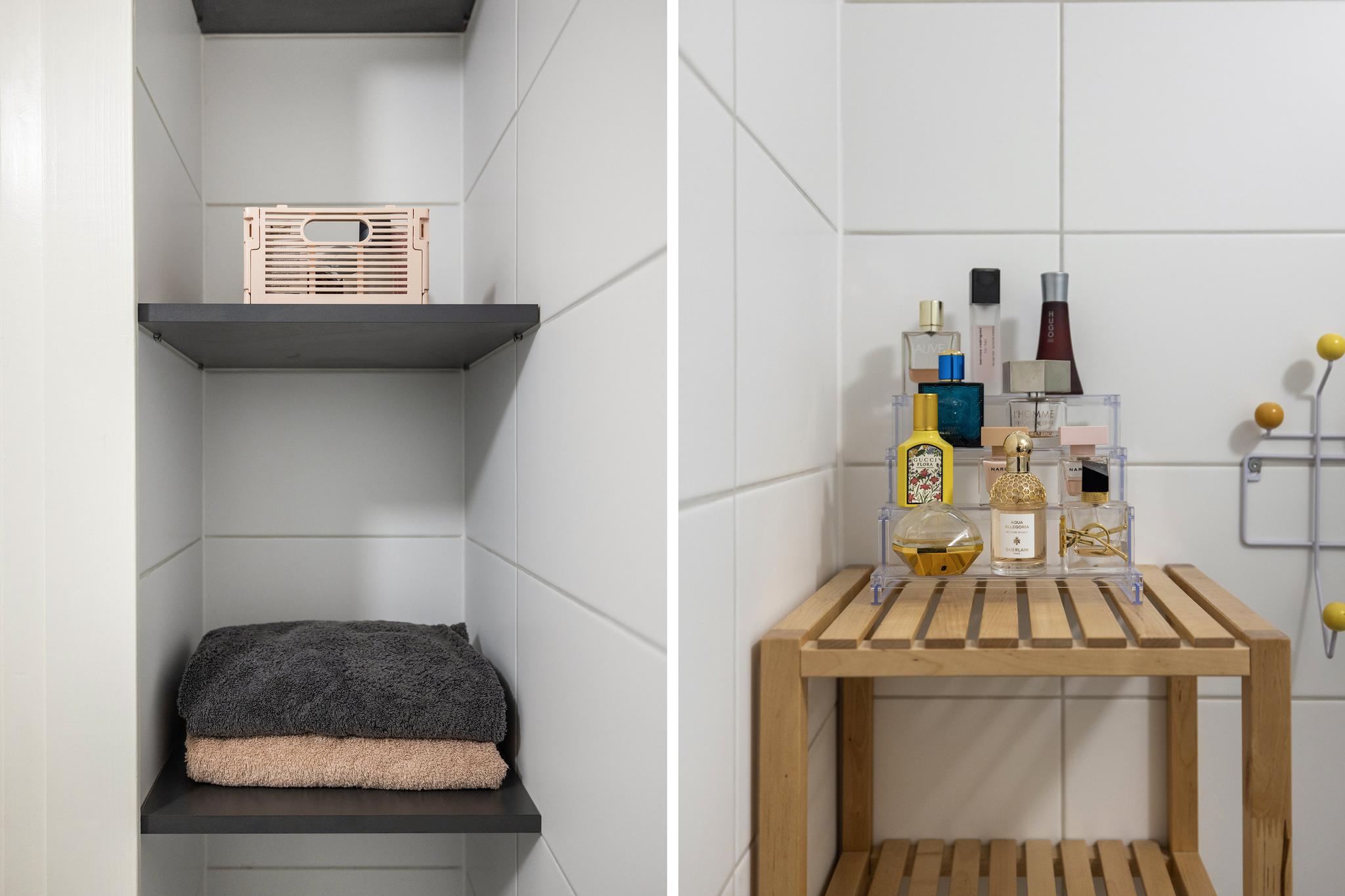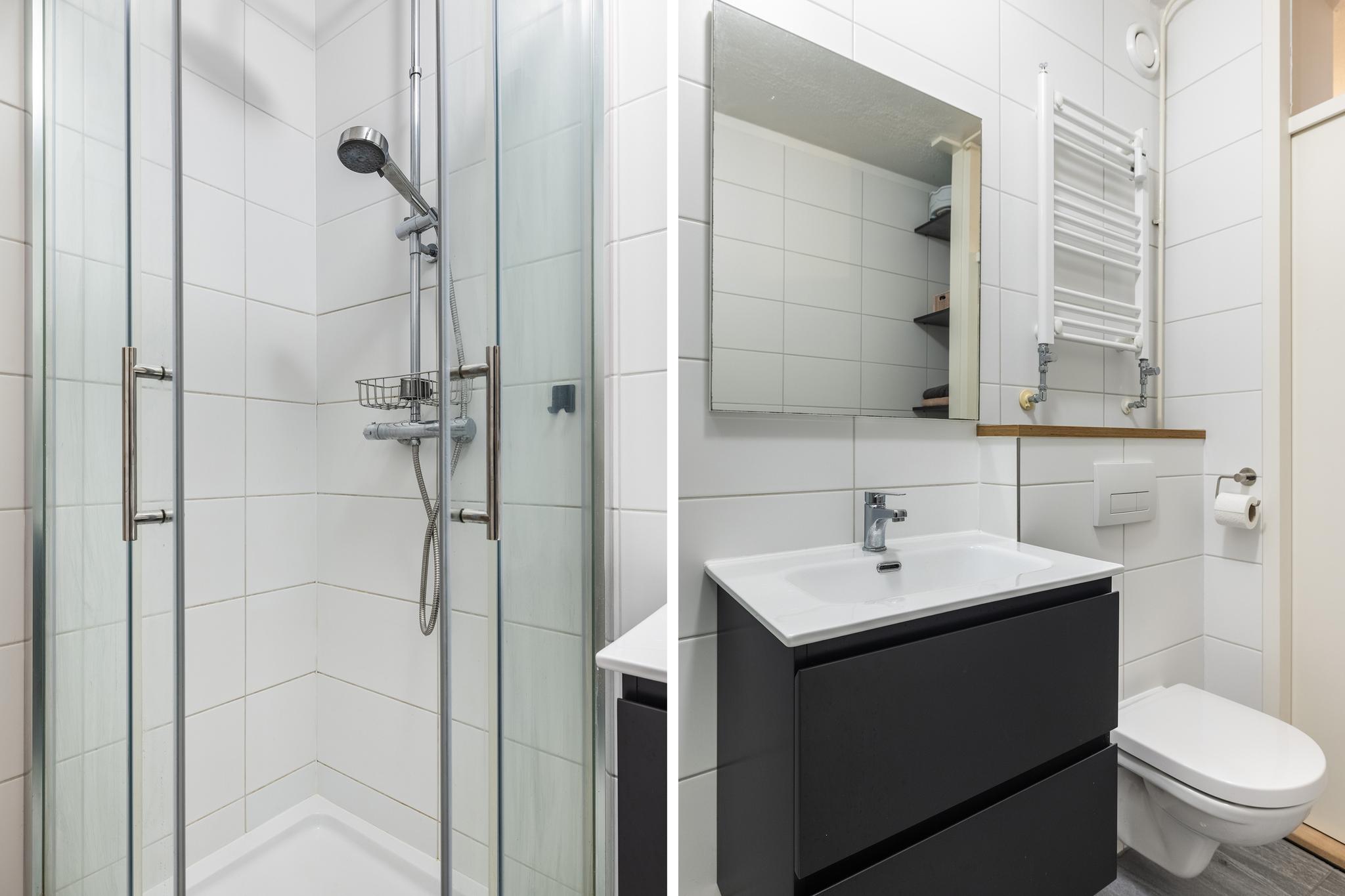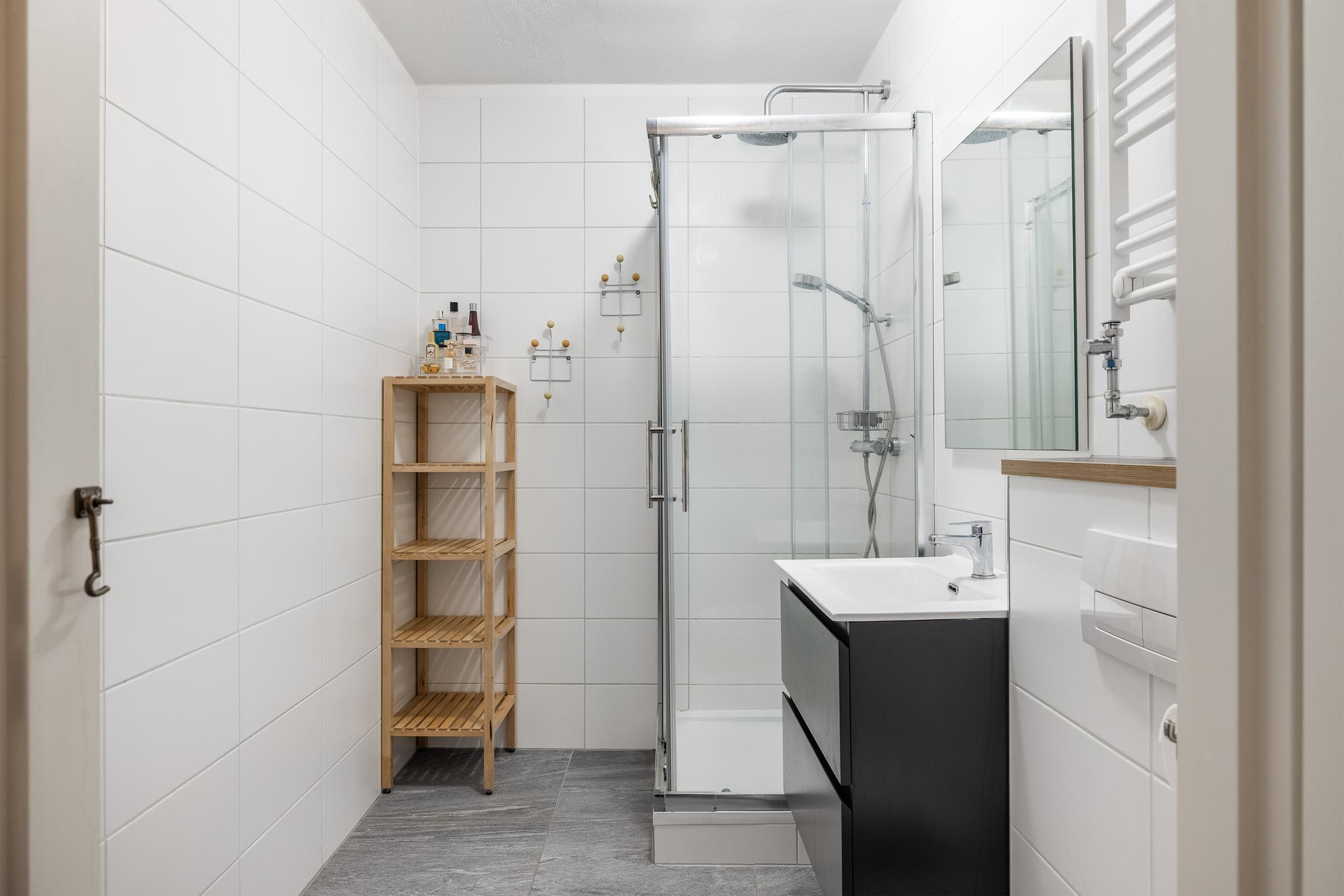De in 2018 vervangen badkamer ziet er keurig uit, er is een ruime douchehoek aanwezig met thermostaatkraan, een wastafel met meubel, vrij hangend toilet, designradiator, grotendeels betegelde wanden en een nis om je spullen op te bergen.