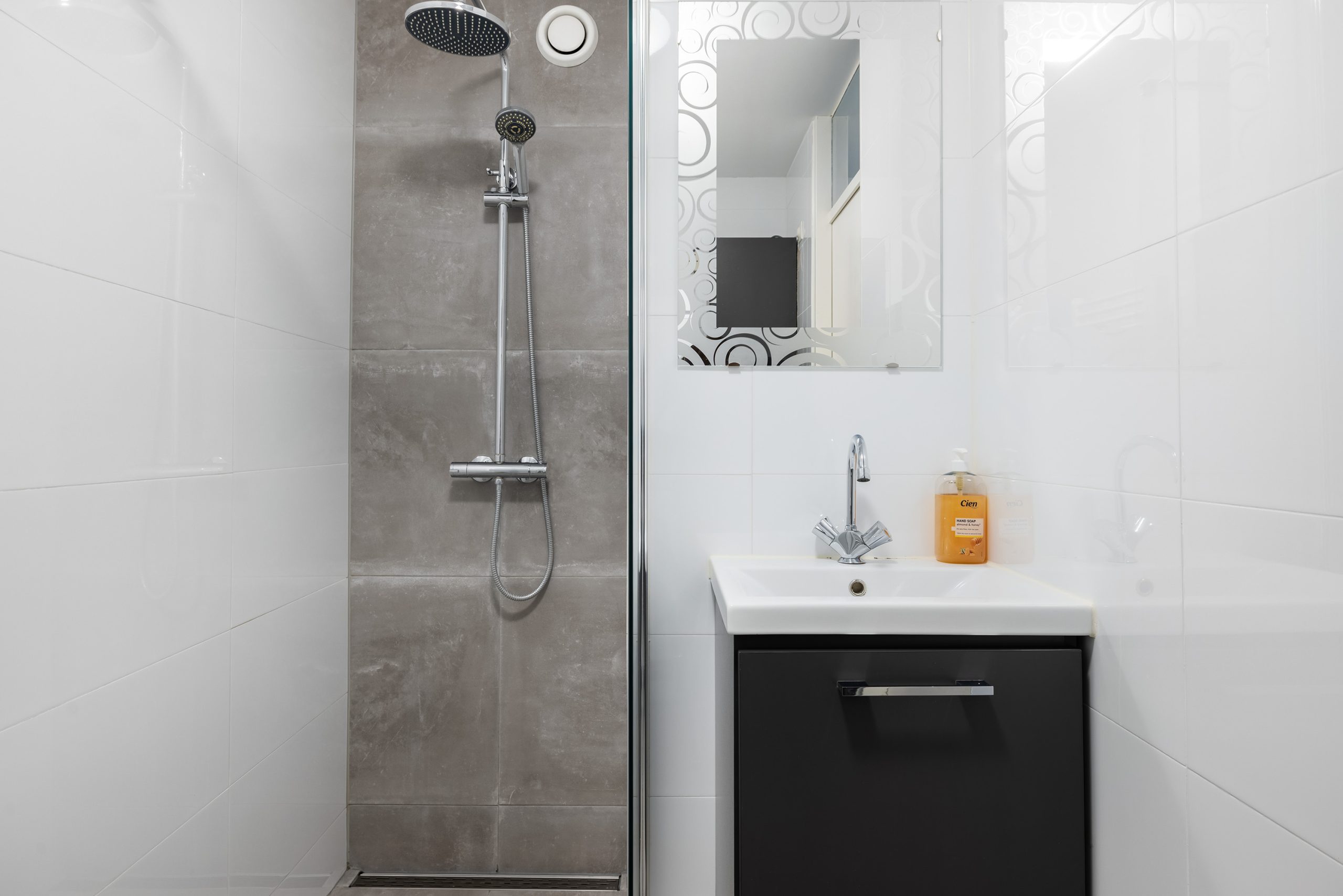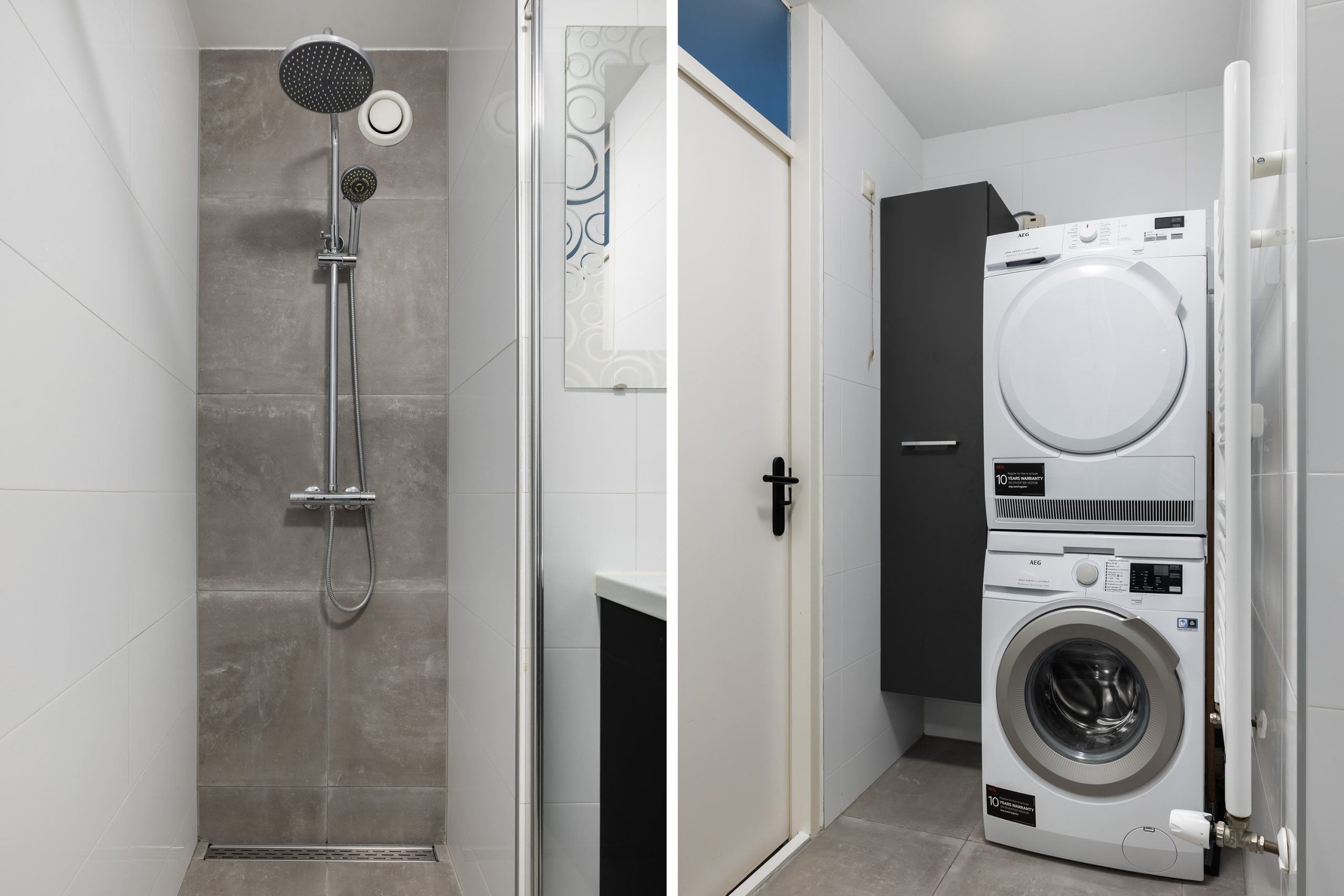 Moderne badkamer, volledig betegeld, voorzien van een inloopdouche met regendouche en thermostaatkraan, wastafelmeubel, spiegel, kolomkast, designradiator en aansluiting wasmachine.