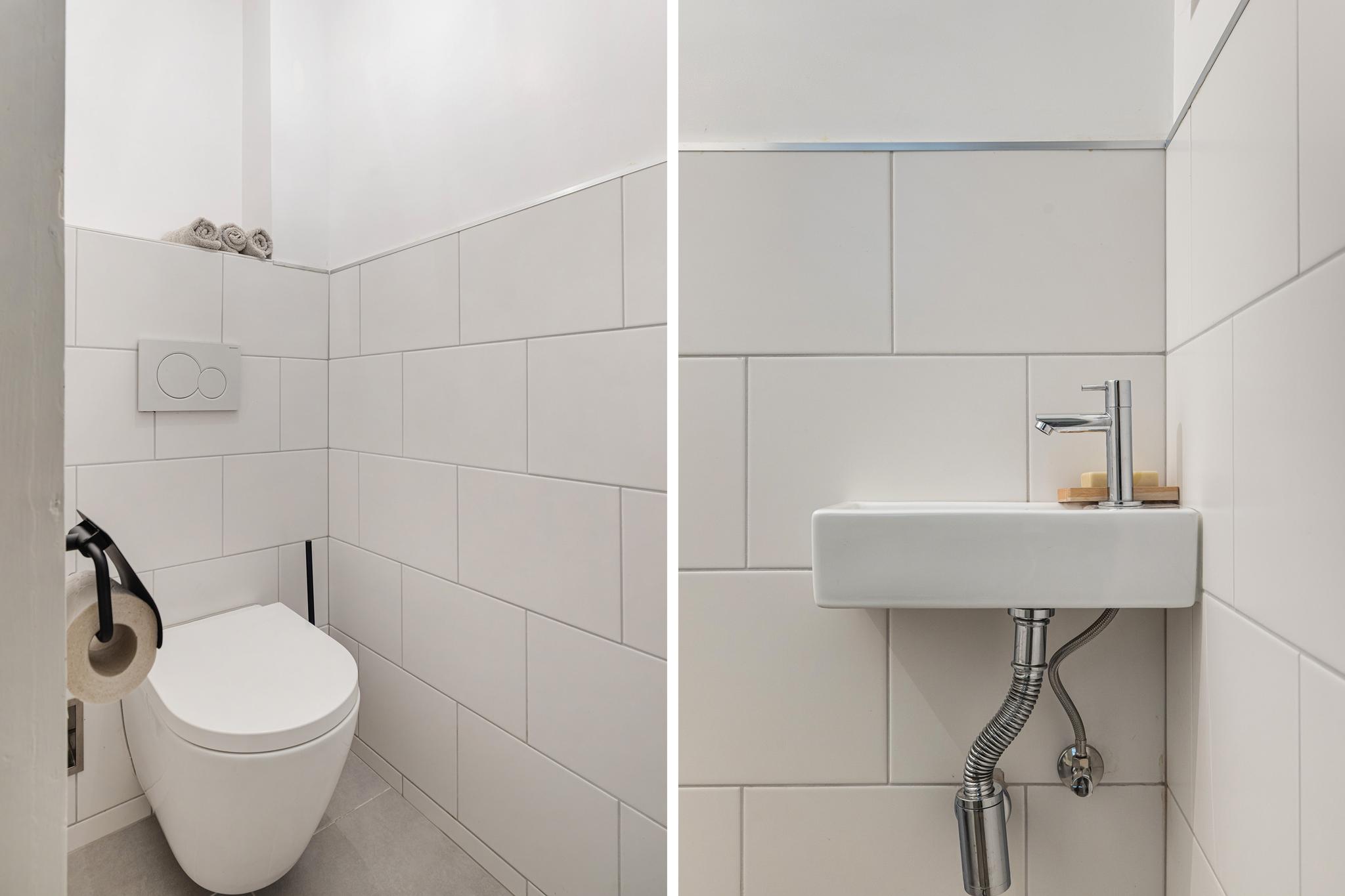Toilet, vrijhangend en voorzien van fonteintje en gedeeltelijk betegelde wanden.