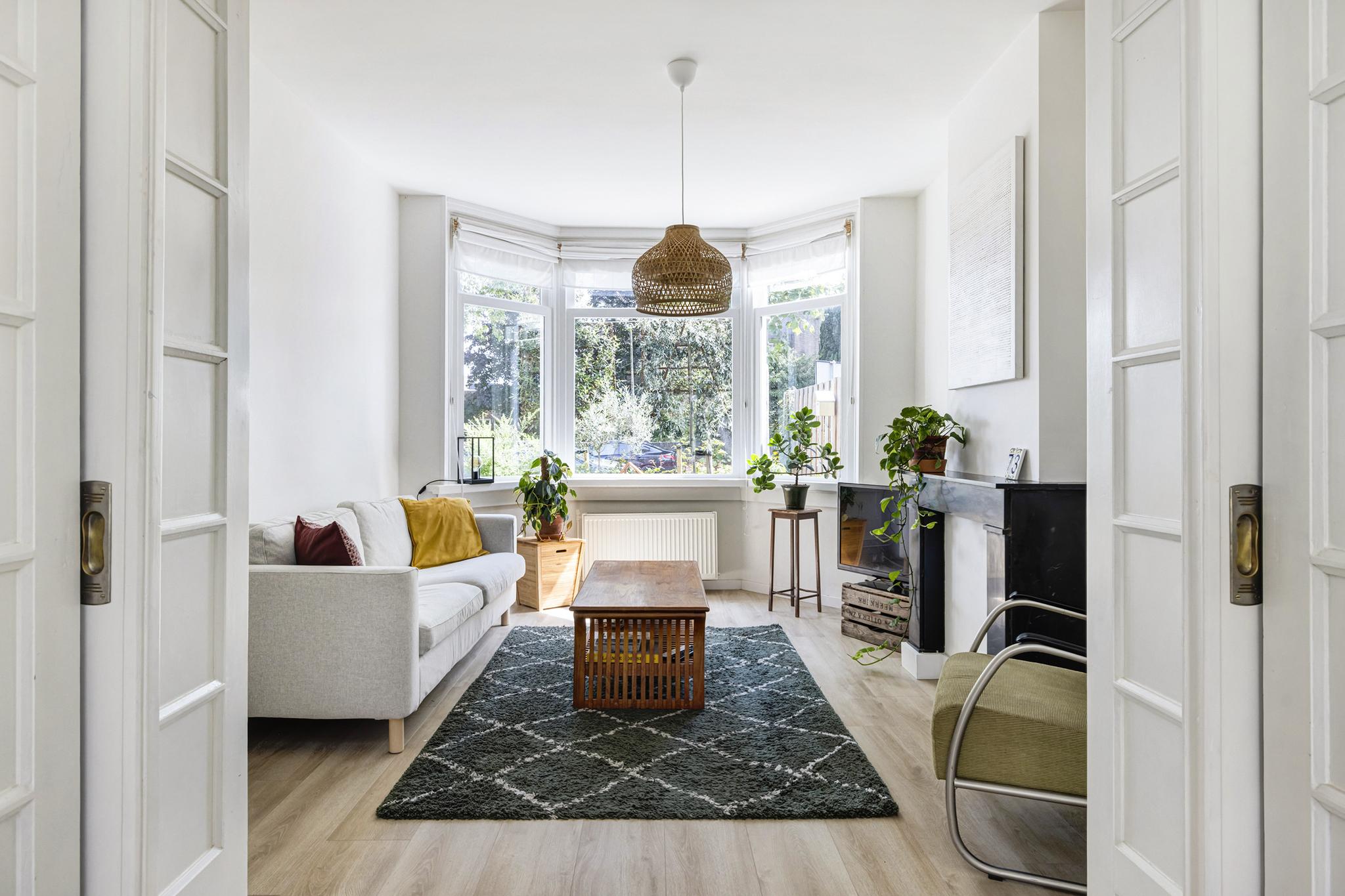 Een lichte, ruime woonkamer met de originele gerenoveerde suite scheiding met kasten nog op zijn plek. Aan de voorzijde is een erker aanwezig en de originele schouw, aan de achterzijde is de keukenmuur weggehaald waardoor een open keuken is ontstaan.