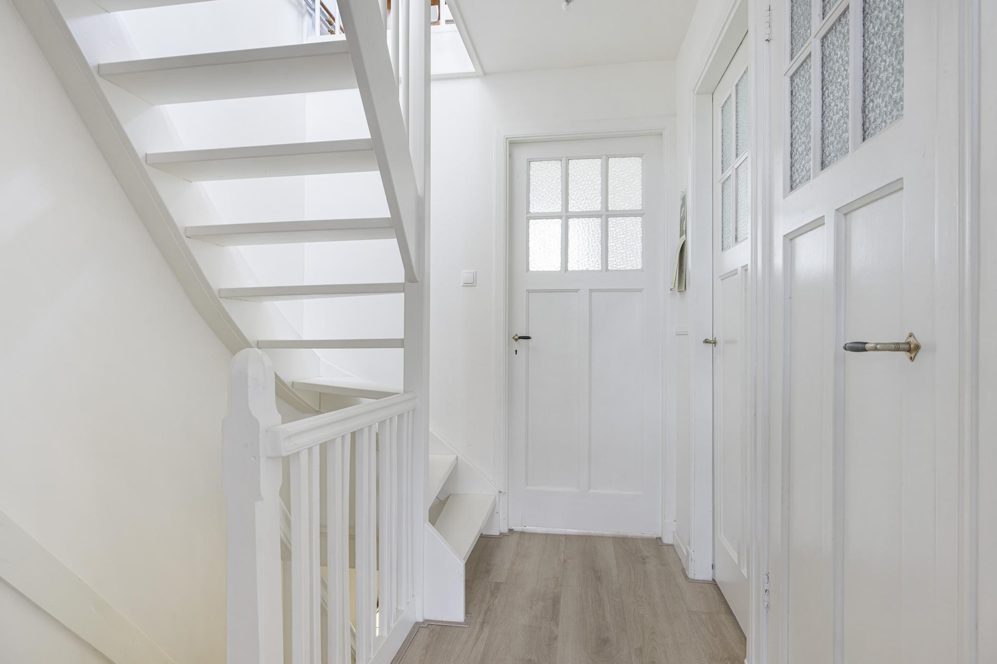 Entree in de hal met meterkast, trapopgang, toilet en trapkast met kelder. Vanuit de hal is de woonkamer bereikbaar.