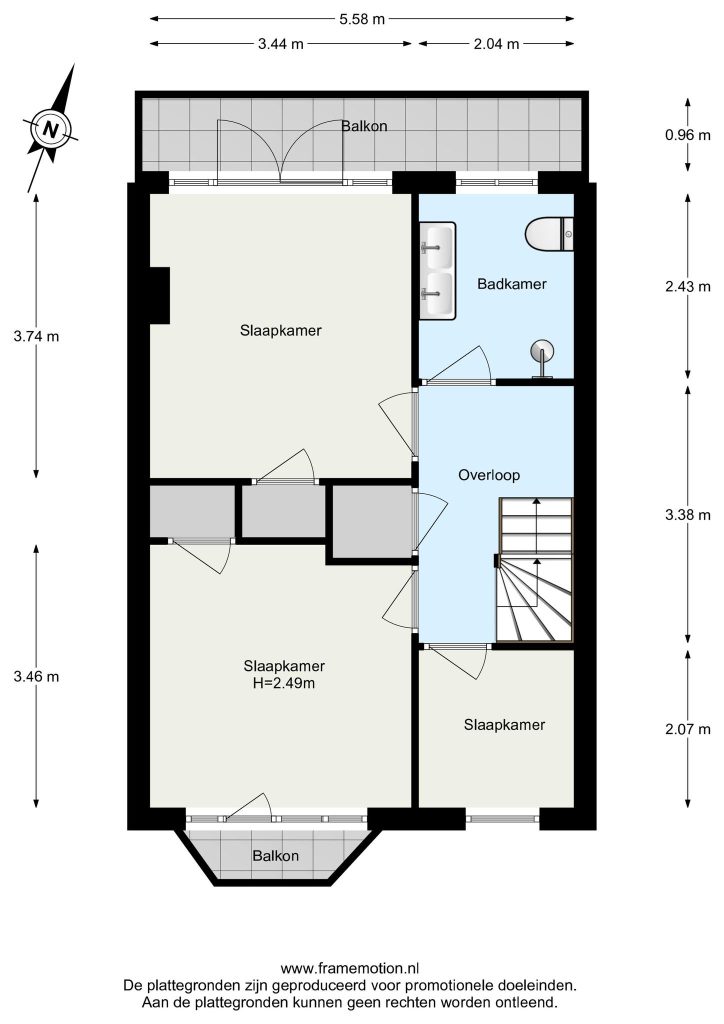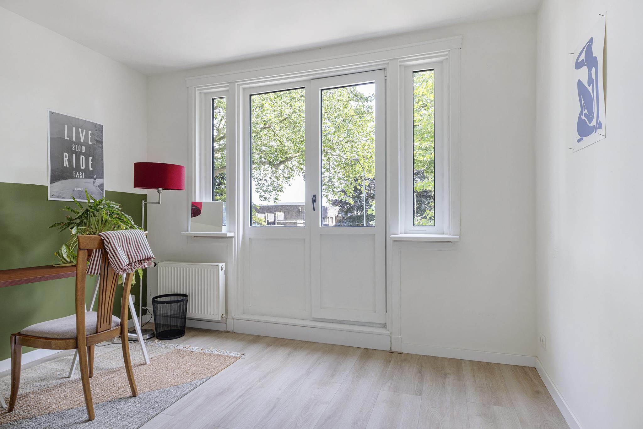 Slaapkamer 2 eveneens gelegen aan de voorzijde met deur naar het Franse balkon en vaste kast.