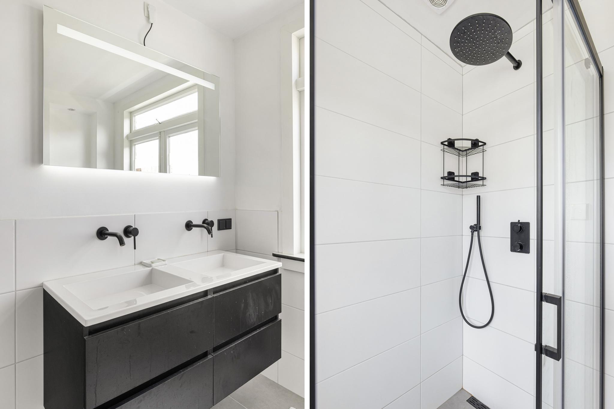 Super strakke badkamer (vergroot) met inloopdouche, dubbele wastafel, toilet, verwarmde spiegel met dimbare verlichting, elektrische vloerverwarming en geheel betegelde wanden, elektrische ventilatie, verlaagd plafond met spots.