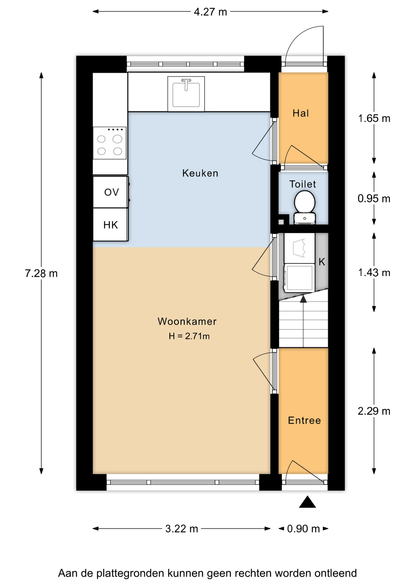 Vanuit de keuken is de hal begaanbaar, met deur naar de achtertuin. Hier bevindt zich tevens de toiletruimte (half betegeld).