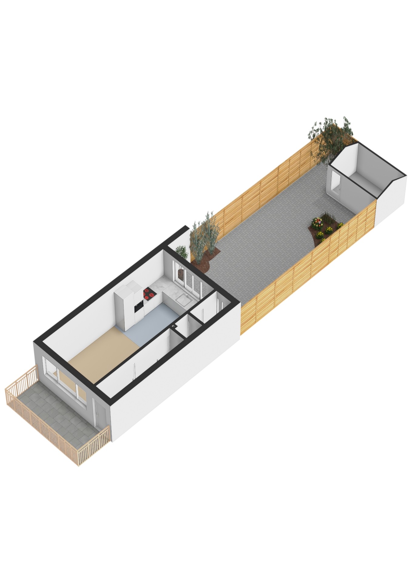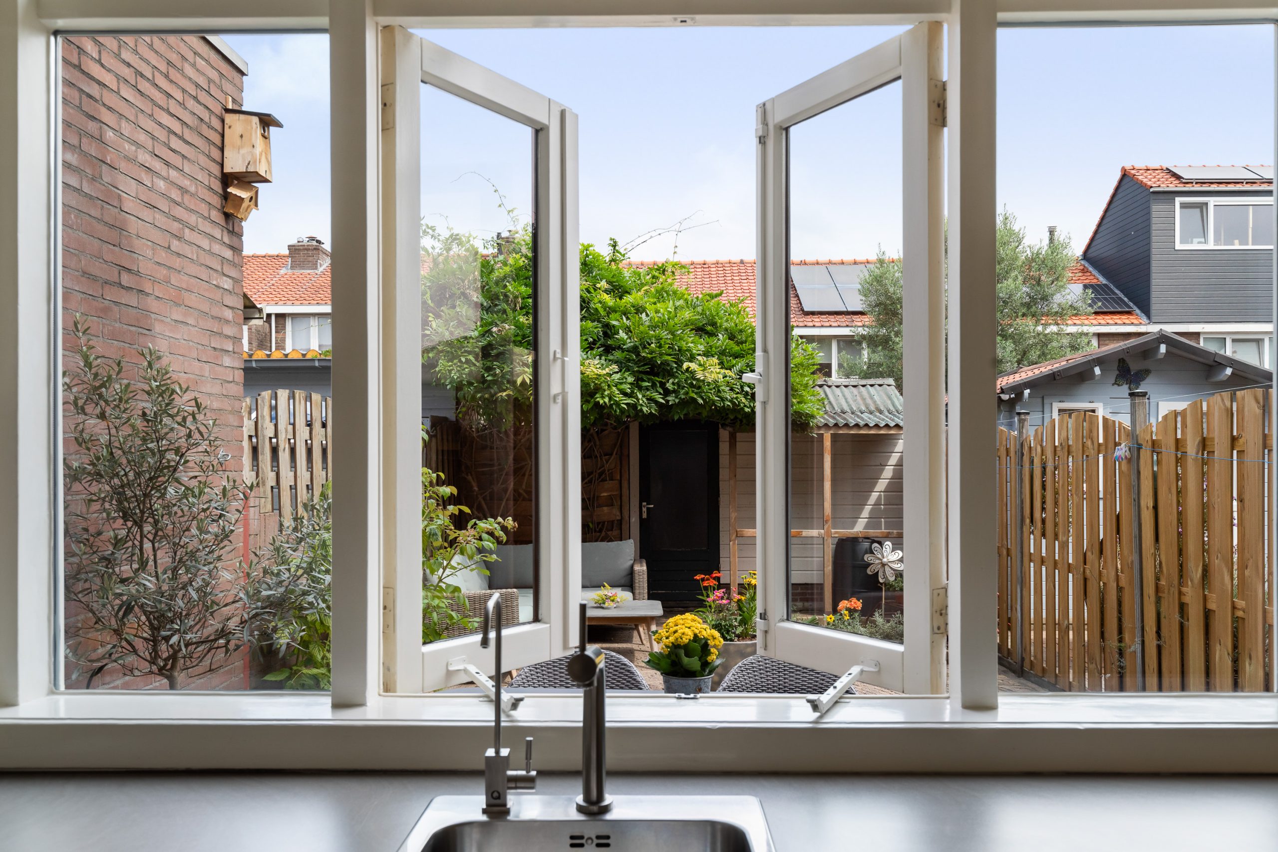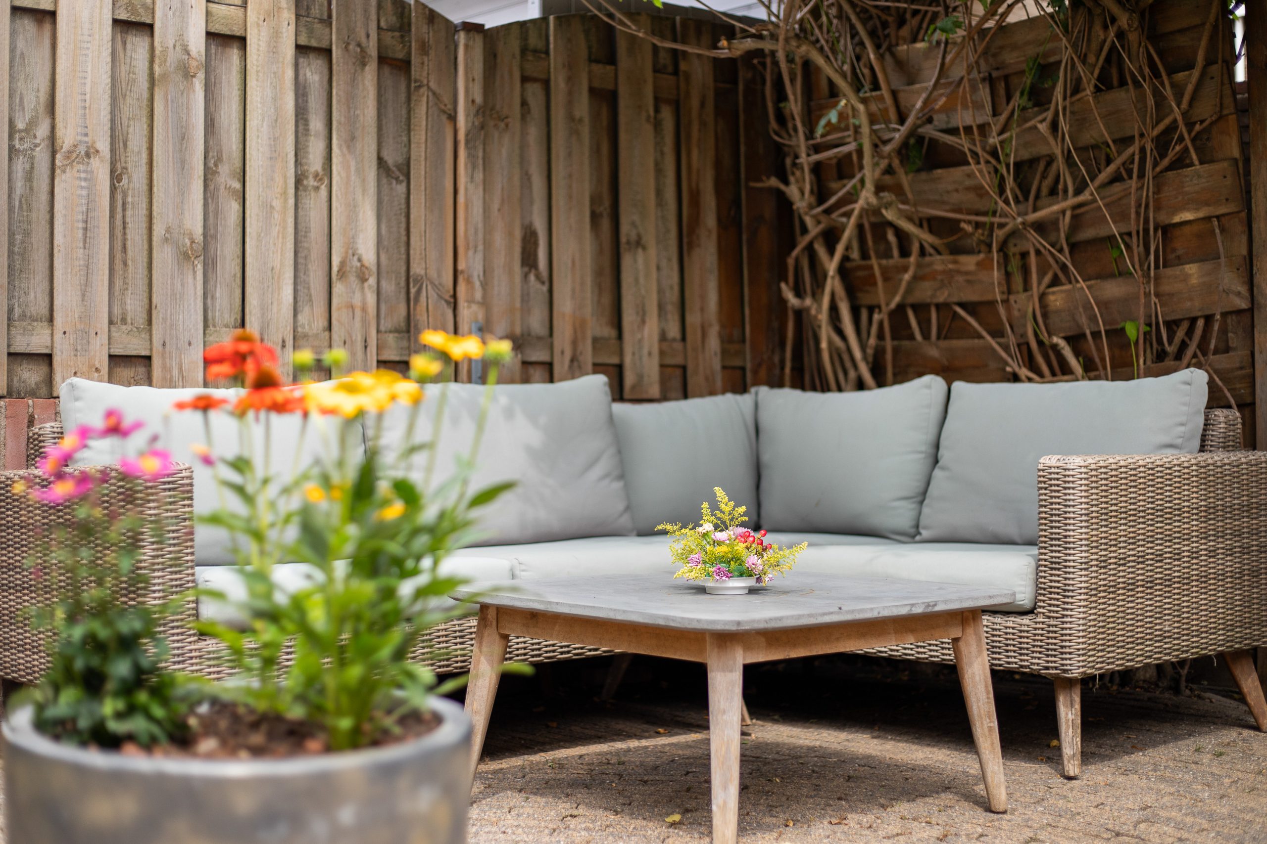 We starten met de achtertuin! Deze is dus verrassend ruim en lekker zonnig. Zet het keukenraam open en klets tijdens het koken gezellig met je gezin of visite buiten. Speciaal voor de gelegenheid wat extra gekleurde bloemetjes neergezet, hier hoef je voorlopig niet meer weg.