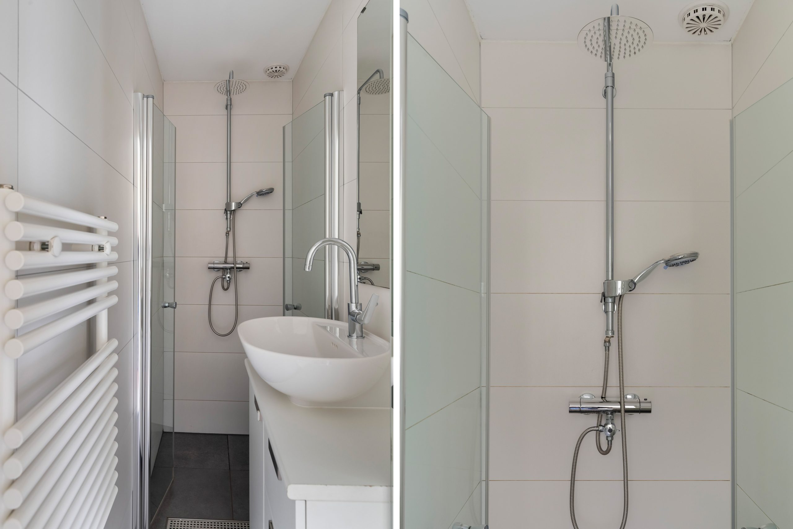 Inpandige badkamer (volledig betegeld) met douchecabine met thermostaatkraan (vervangen in 2024), waskom op meubel (kraan vernieuwd in 2025), kolomkast, designradiator, inbouwspots en mechanische ventilatie (in 2025 vernieuwd).
