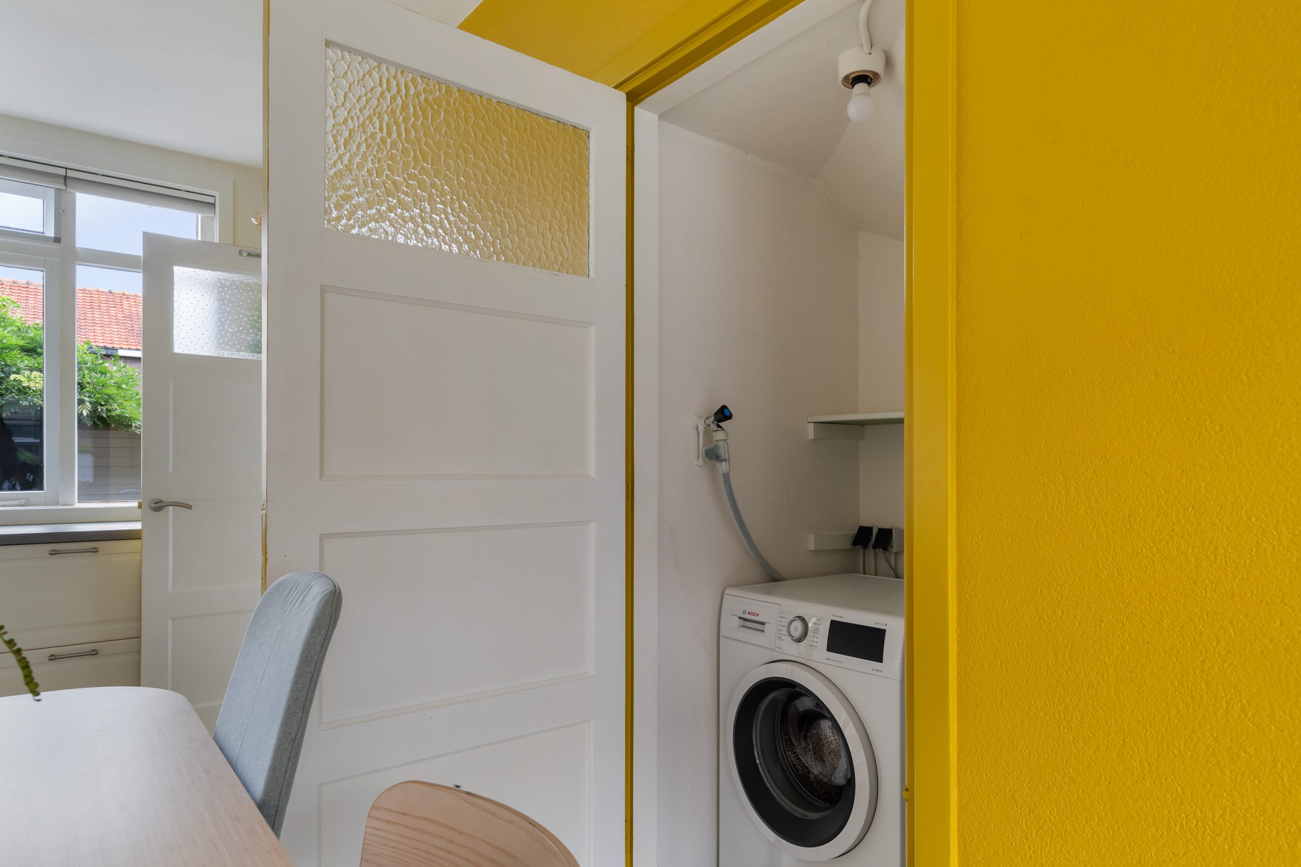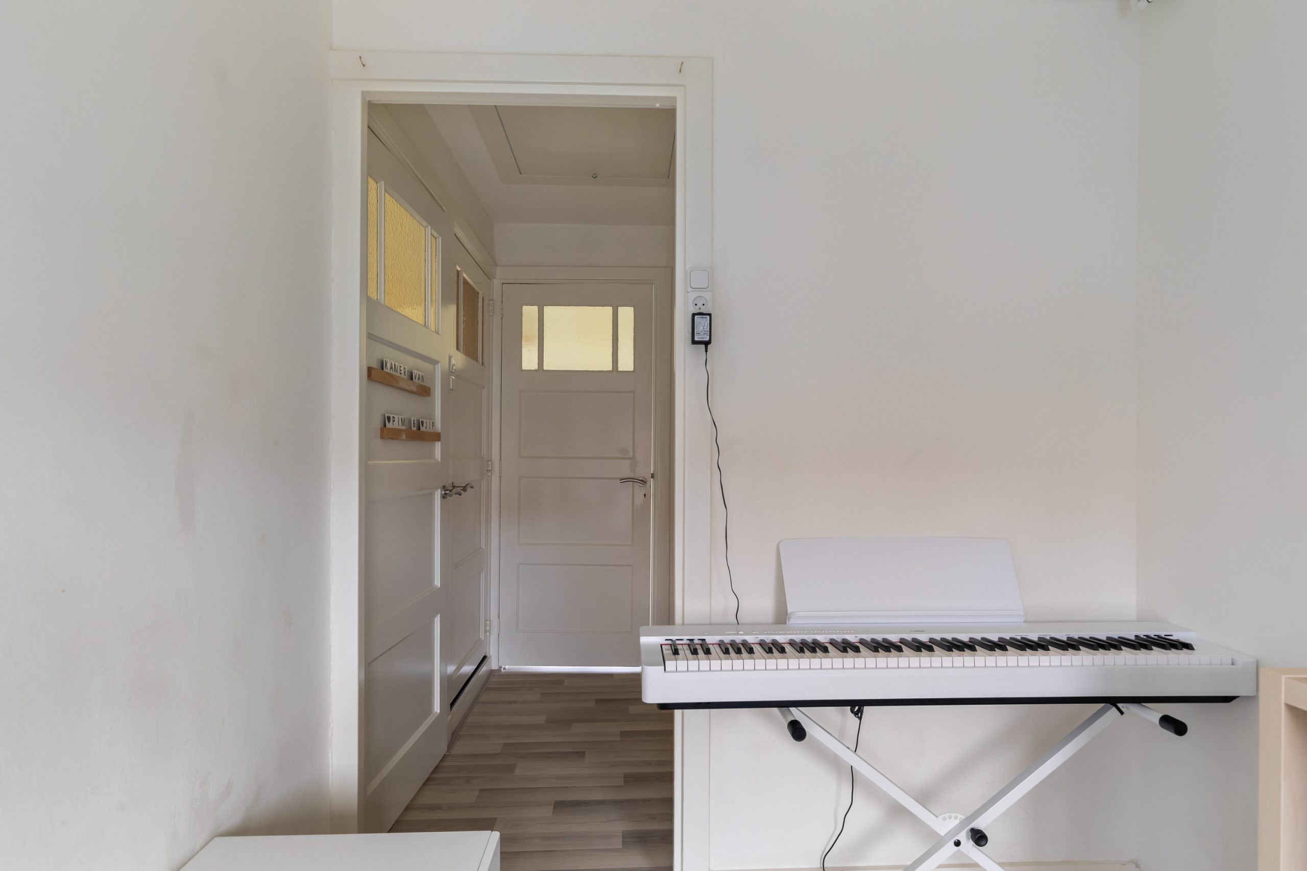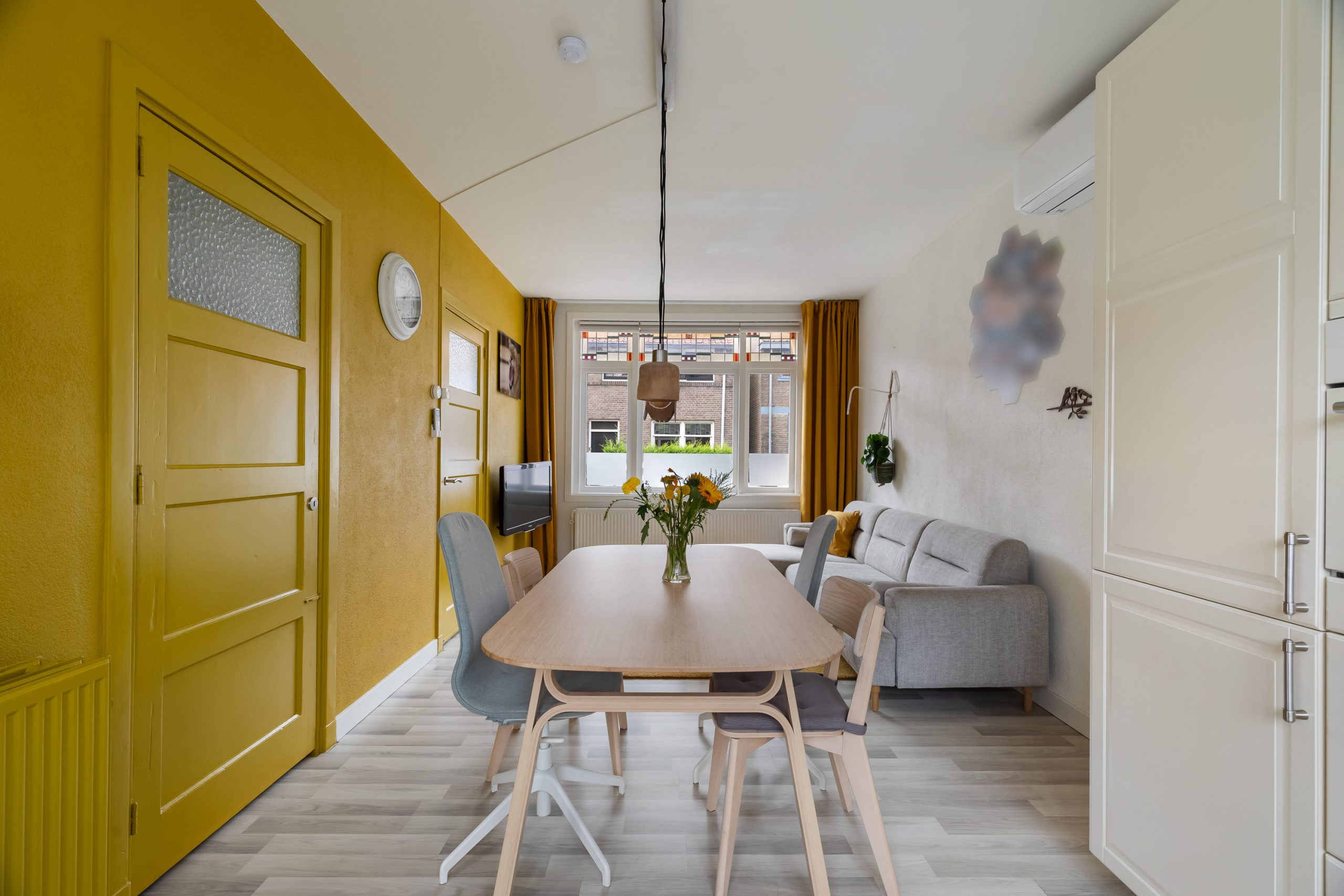 Ruime doorzonwoonkamer met open keuken aan achterzijde. De woonkamer beschikt over sfeervolle glas-in-lood ramen aan voorzijde, airconditioning (2024) en een handige trapkast met aansluiting wasmachine. De ruimte is voorzien van een laminaatvloer en spagtelputz wand- en plafondafwerking.