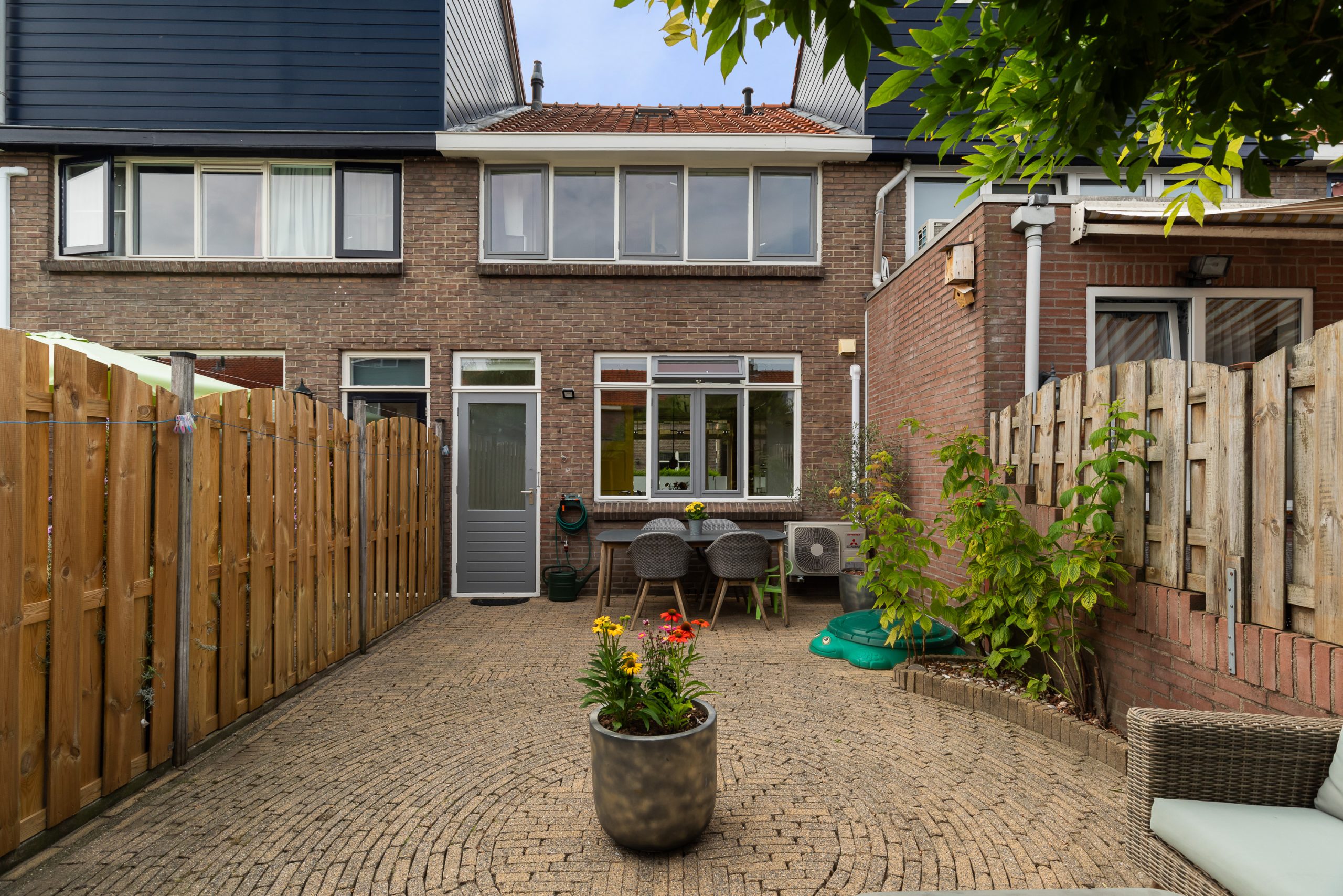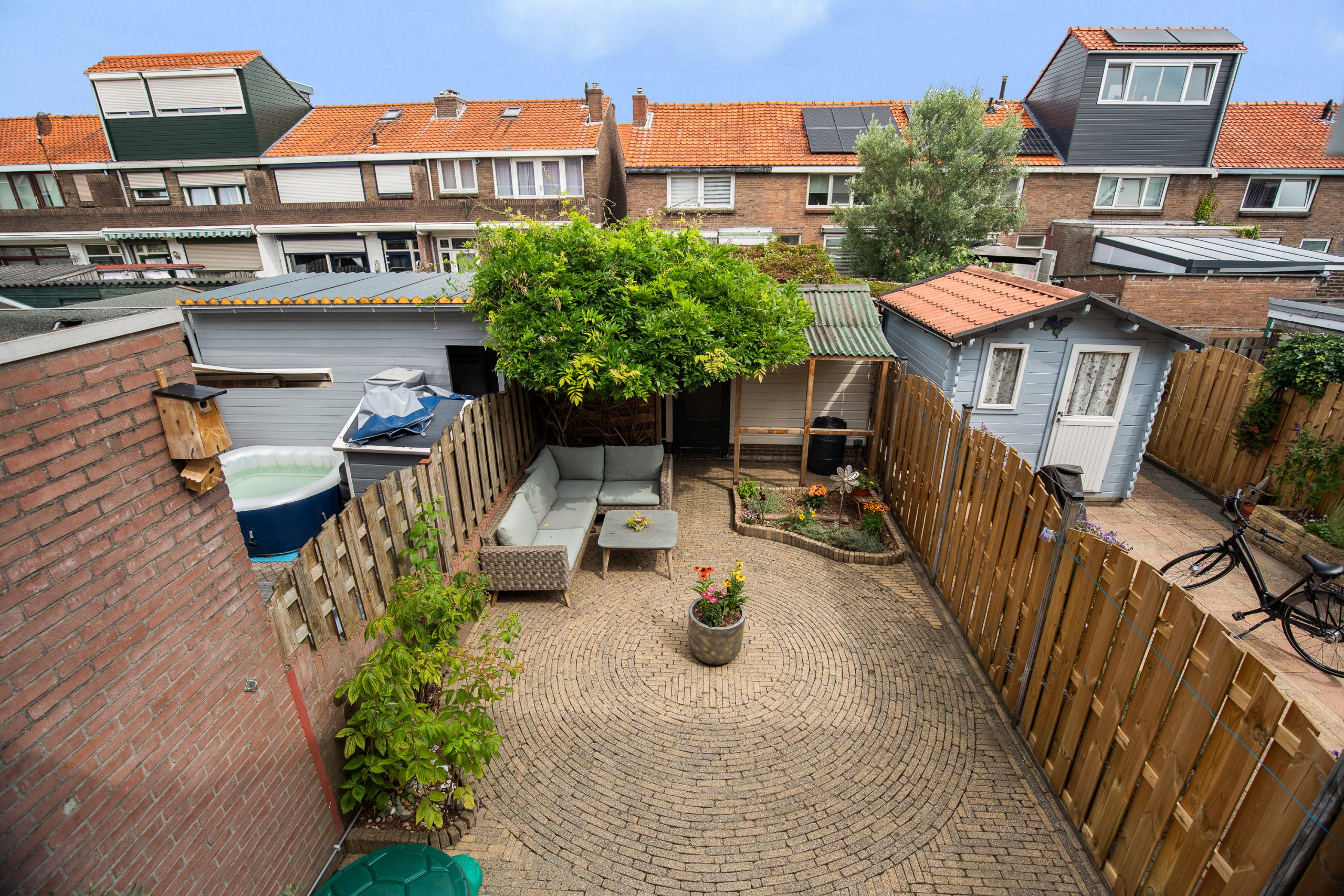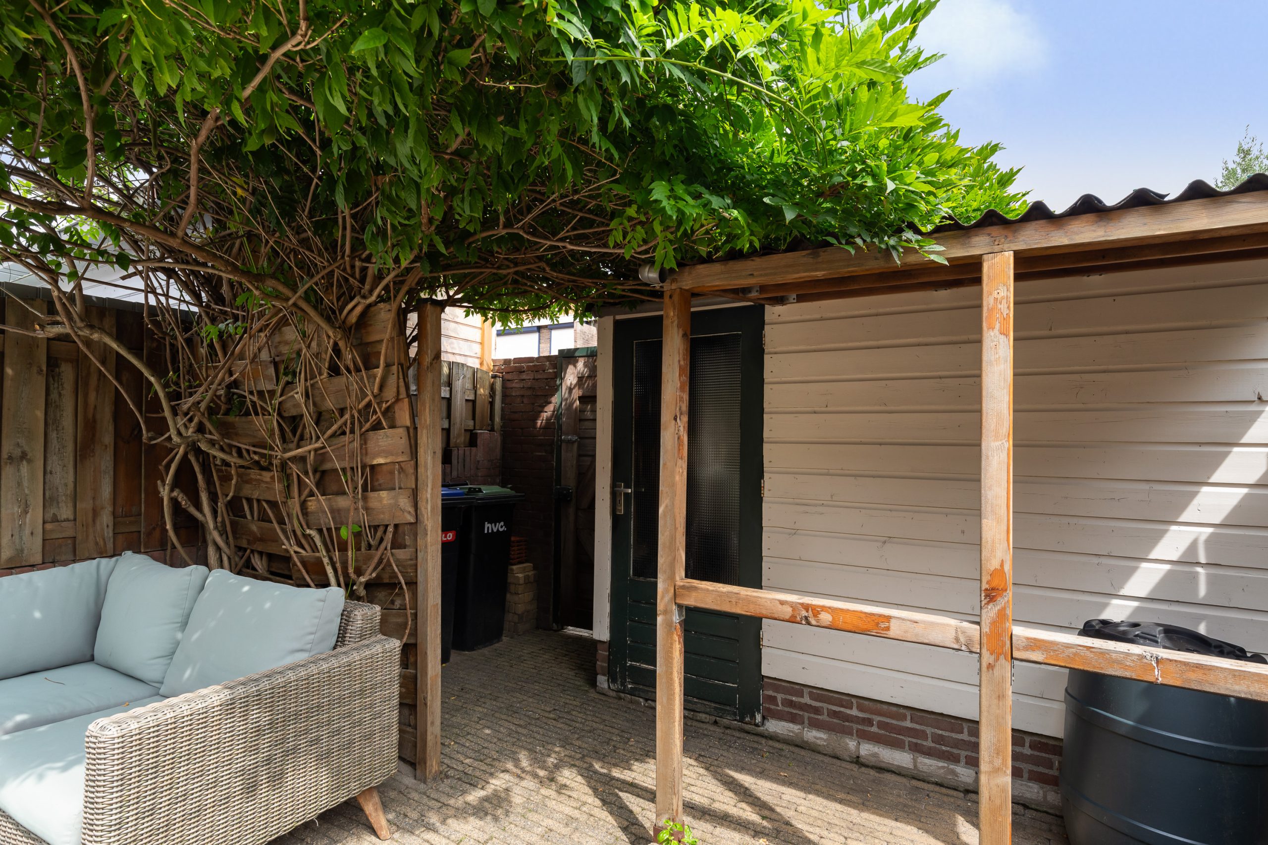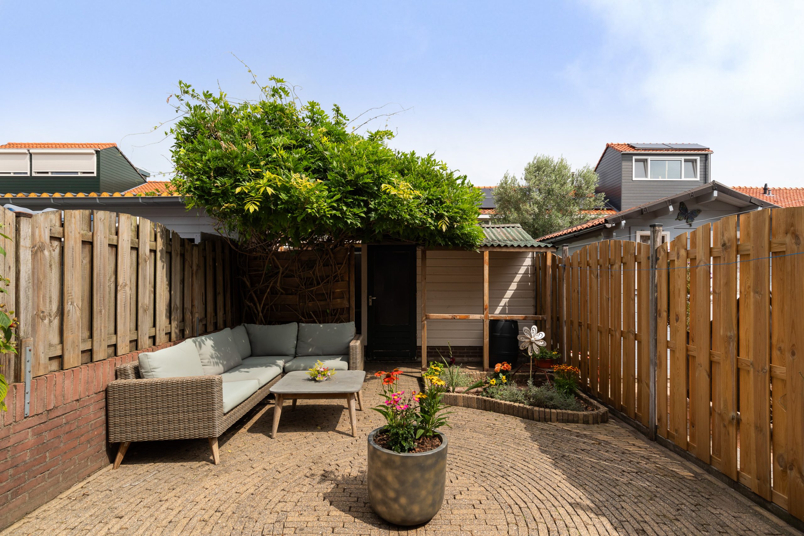 De achtertuin is gelegen op het noordoosten en is sfeervol aangelegd met nette bestrating en mooie planten zoals een Blauweregen. Achterin bevindt zich een achterom, ruimte voor de kliko's en een houten berging, voorzien van elektra.