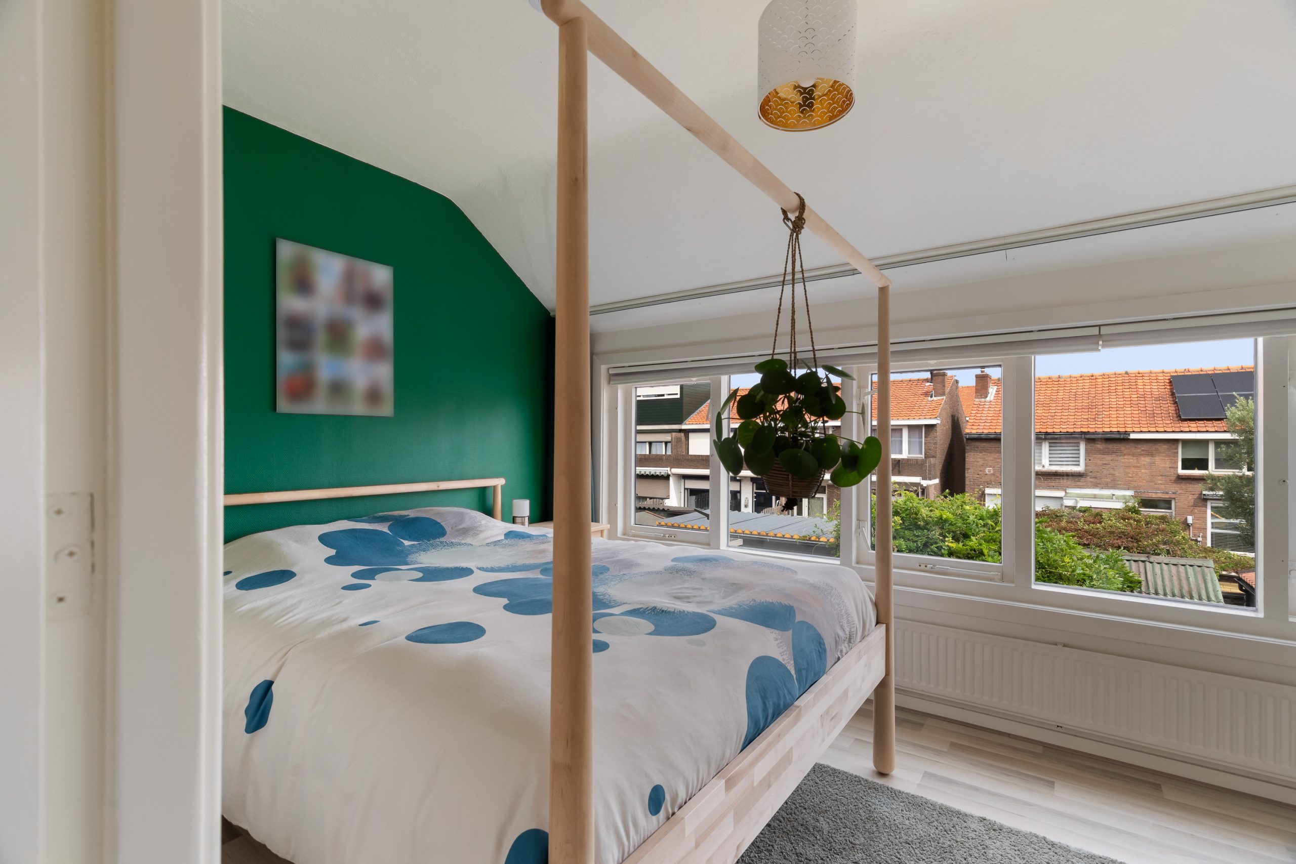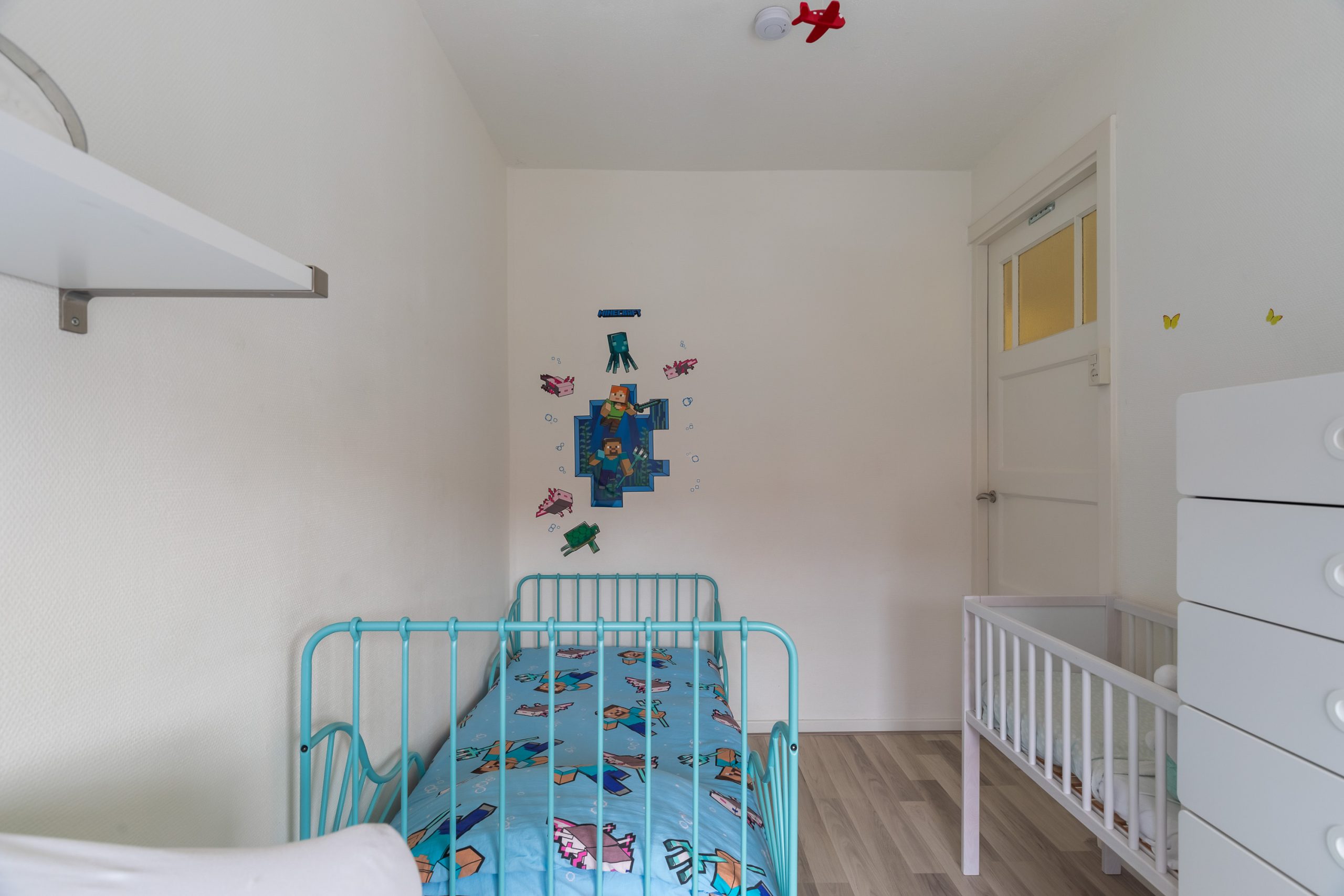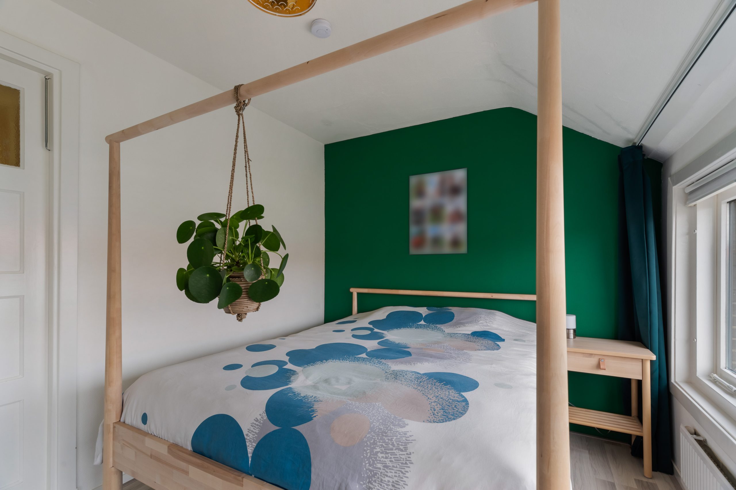 Slaapkamer aan voorzijde, met laminaatvloer en behang wandafwerking.