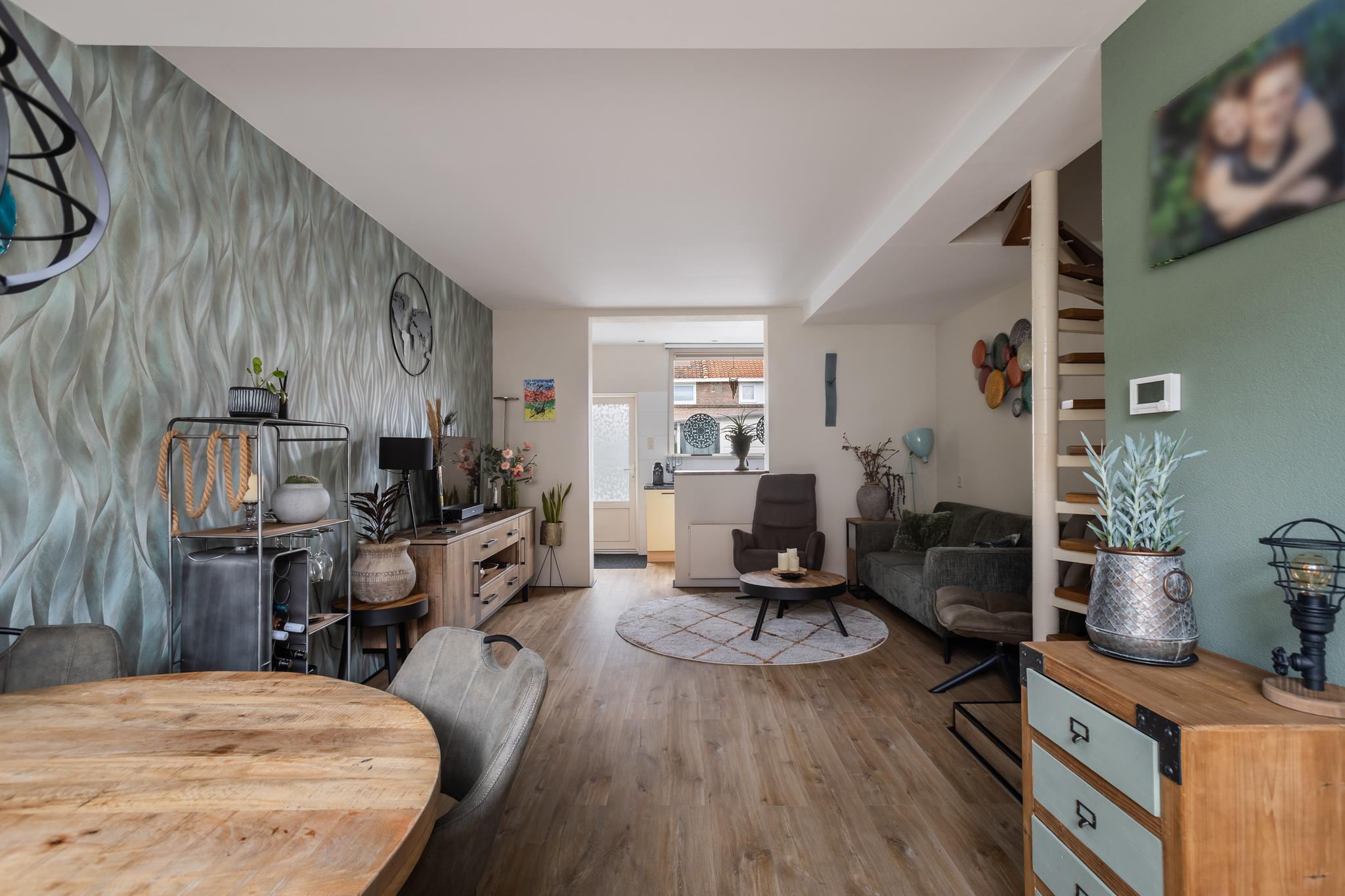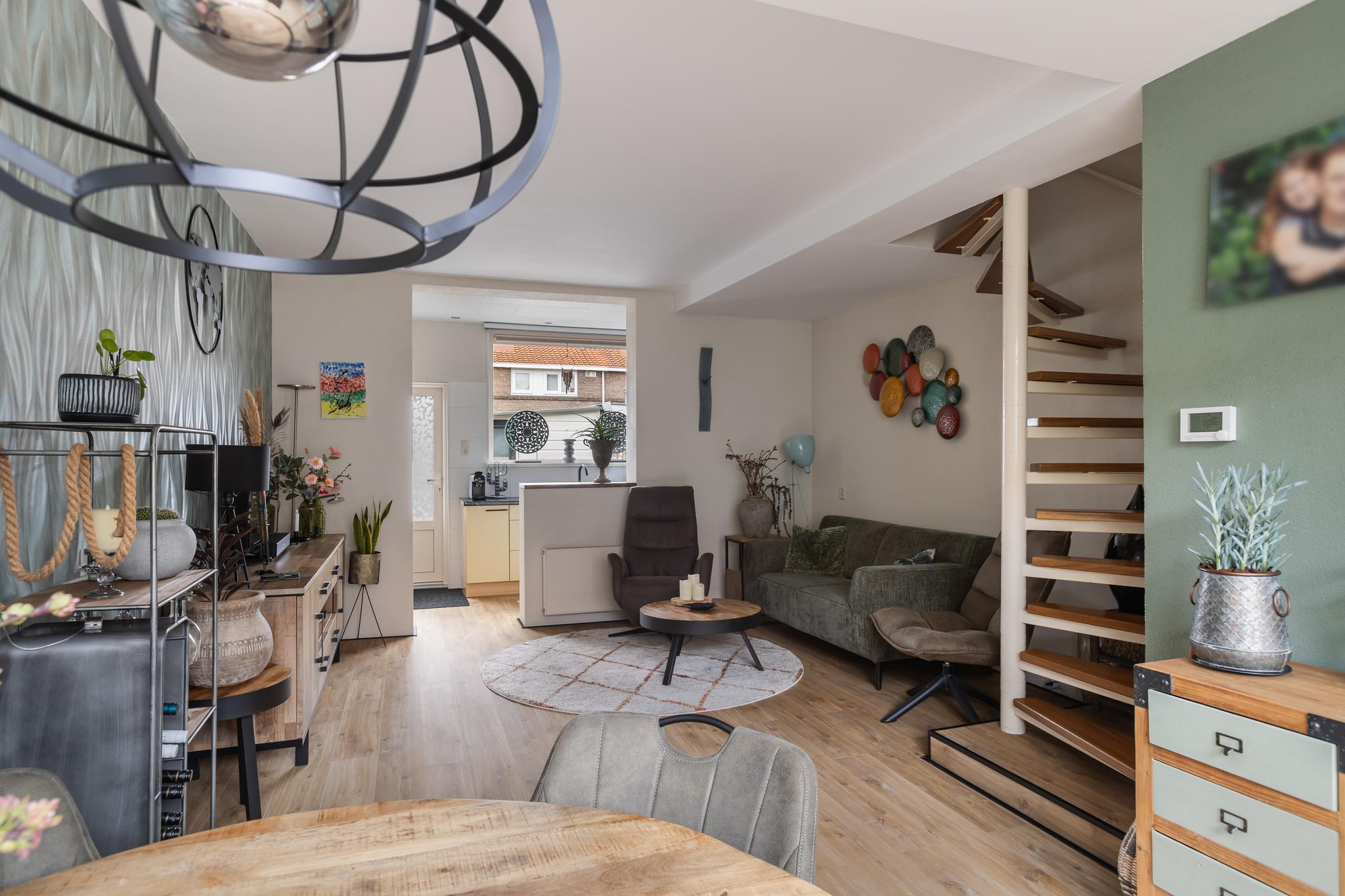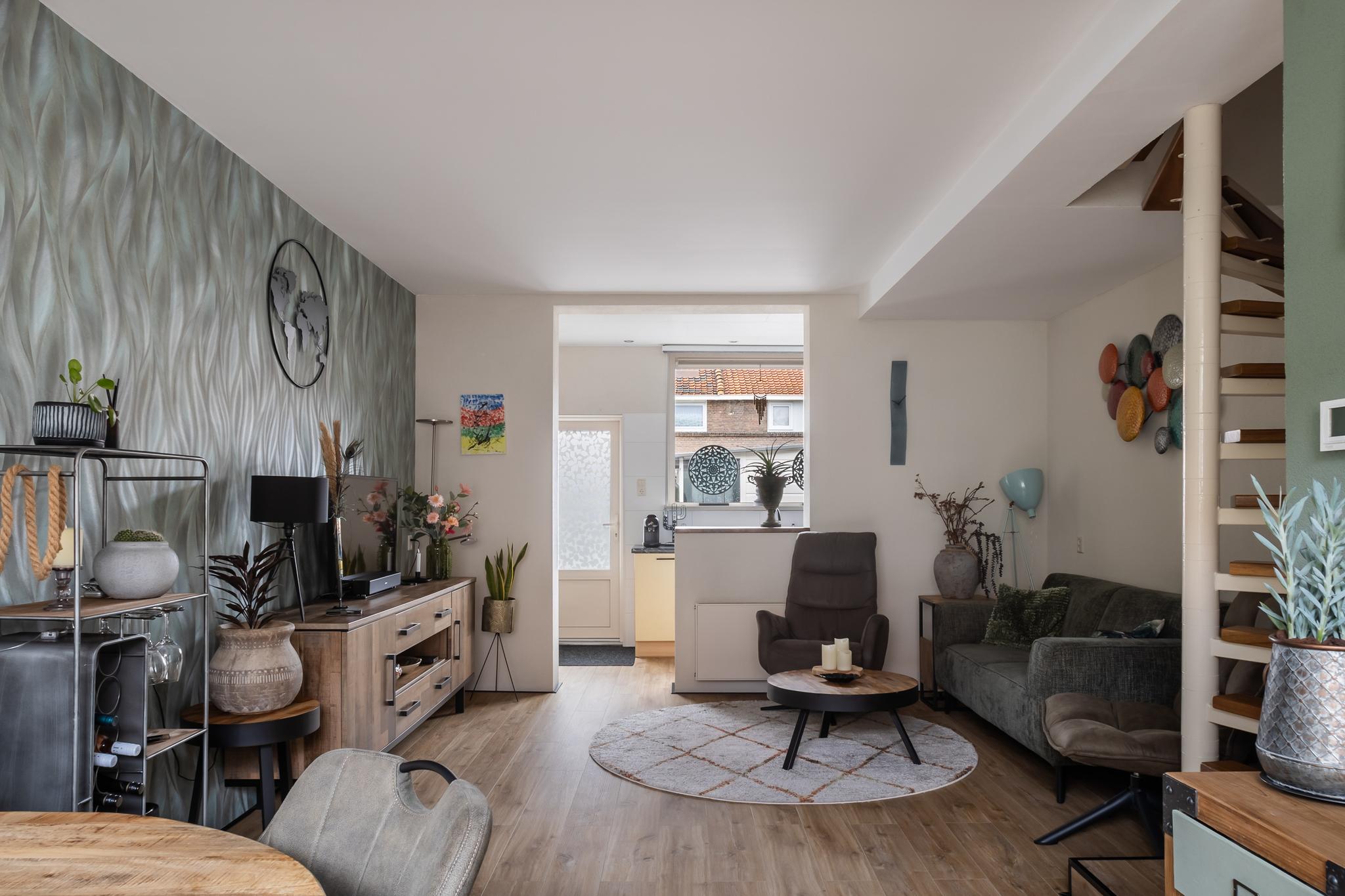 Fijne woonkamer met keuken in de aanbouw aan achterzijde. De woonkamer is voorzien van een nette PVC vloer, spagtelputz en behang wandafwerking, gladgestuct plafond en een spiltrap naar de 1e verdieping.