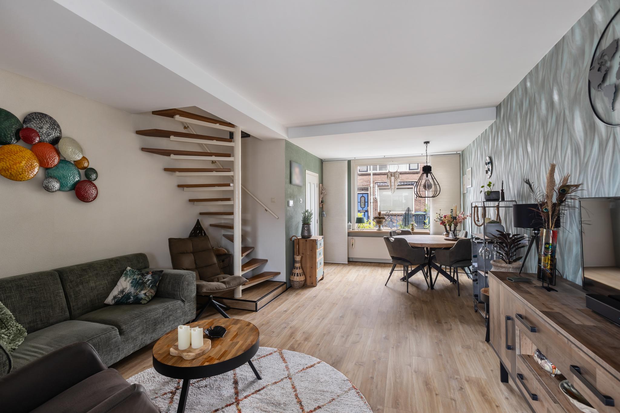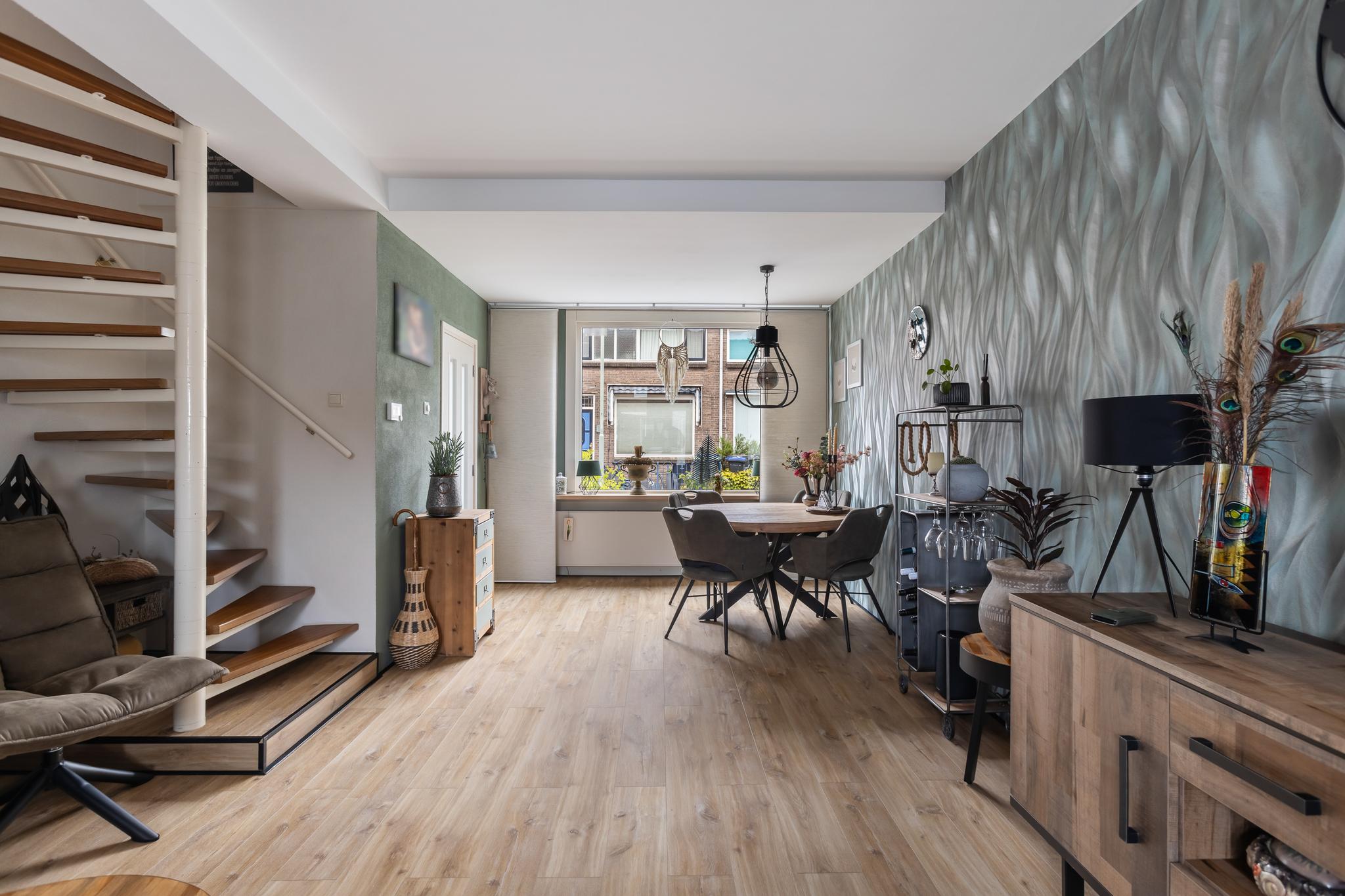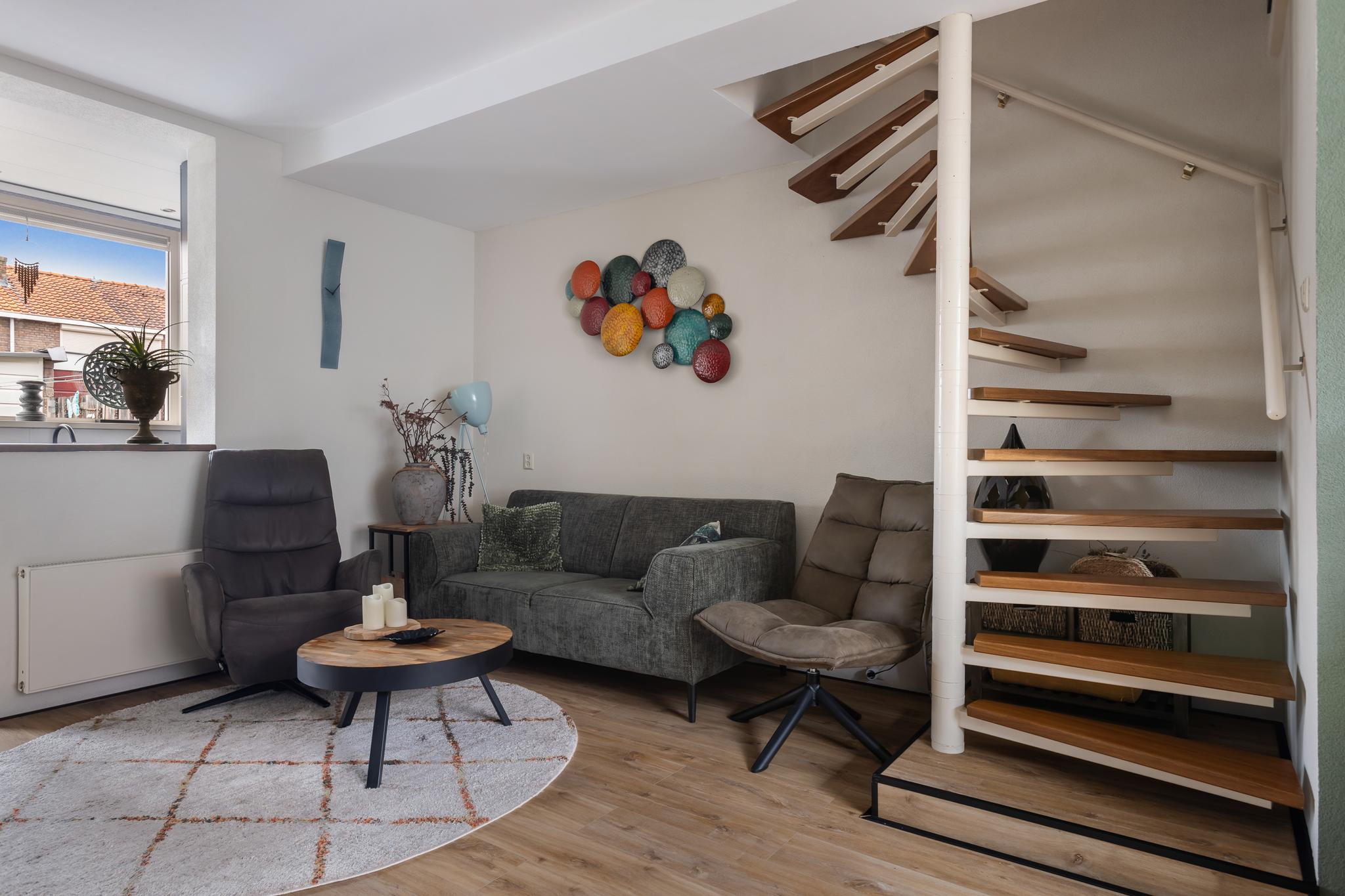 Fijne woonkamer met keuken in de aanbouw aan achterzijde. De woonkamer is voorzien van een nette PVC vloer, spagtelputz en behang wandafwerking, gladgestuct plafond en een spiltrap naar de 1e verdieping.