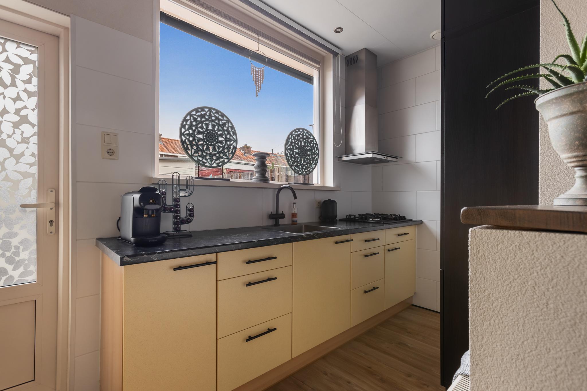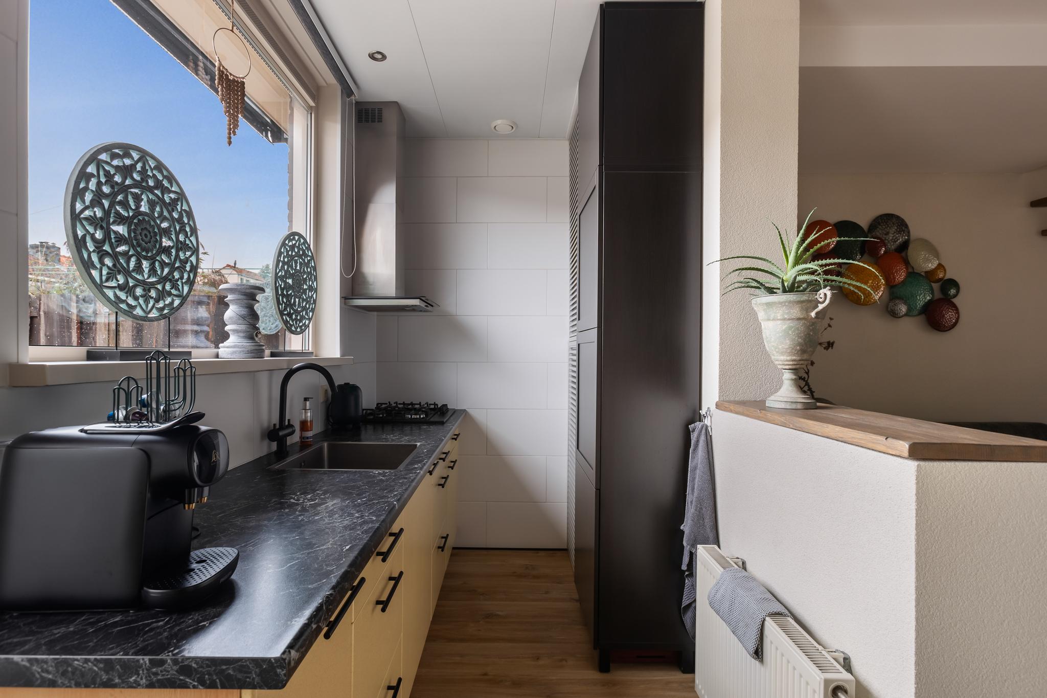 Keuken in dubbele wandopsteling met uitzicht op de achtertuin. De keuken is voorzien van een 4 pit gaskookplaat (2017) met afzuigkap, combi-magnetron (2020), koelkast (2021) en veel bergruimte.