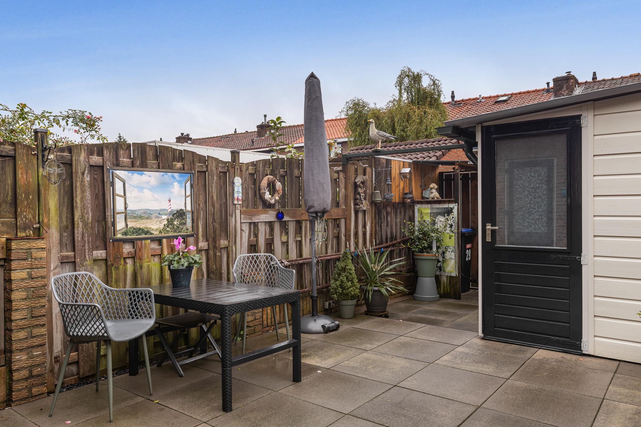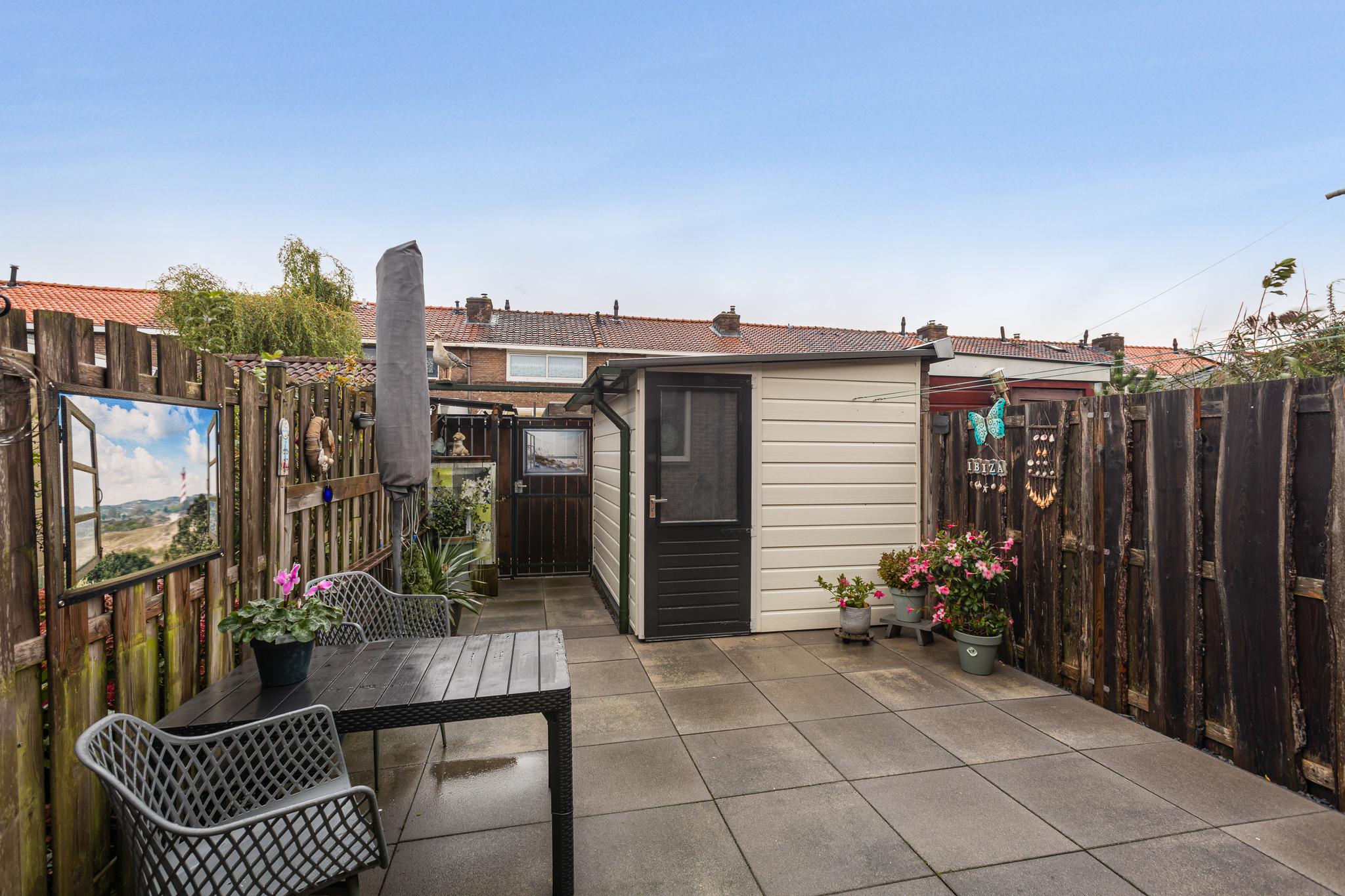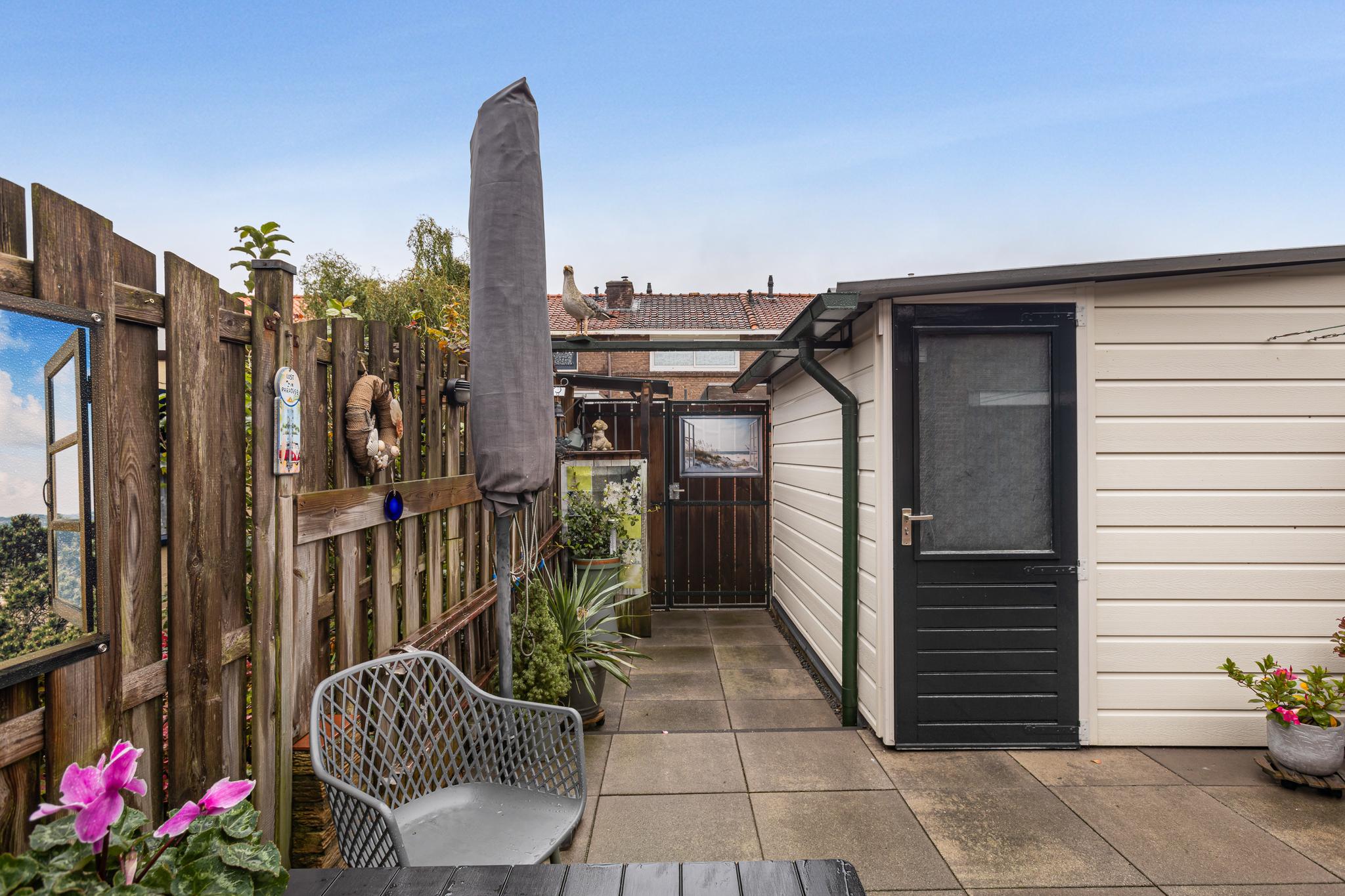 Zonnige achtertuin gelegen op het zuidwesten, keurig aangelegd en met zonnescherm en achterom. De berging is voorzien van elektra en aansluiting voor de wasmachine. Aan de buitenzijde is de berging deels afgewerkt met kunststof platen, het dak is in 2023 vervangen.